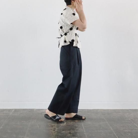 ベーシックなレギュラーカラーに、フロントはボタン開き。フロント裾と背面のタックがチャーミングな印象です。ウエストにつけられた伸縮性のある紐を使って、異なるシルエットをお楽しみいただけます。