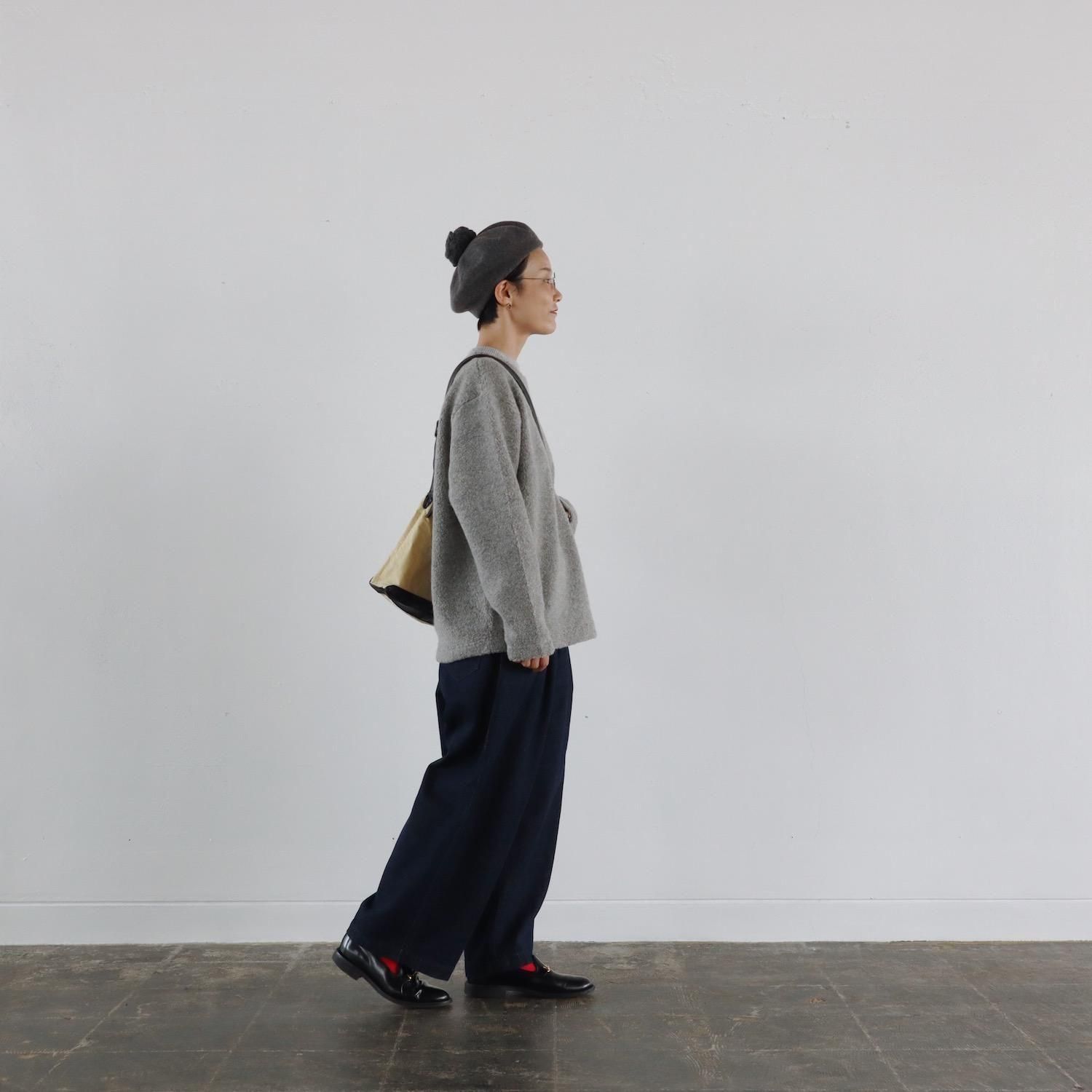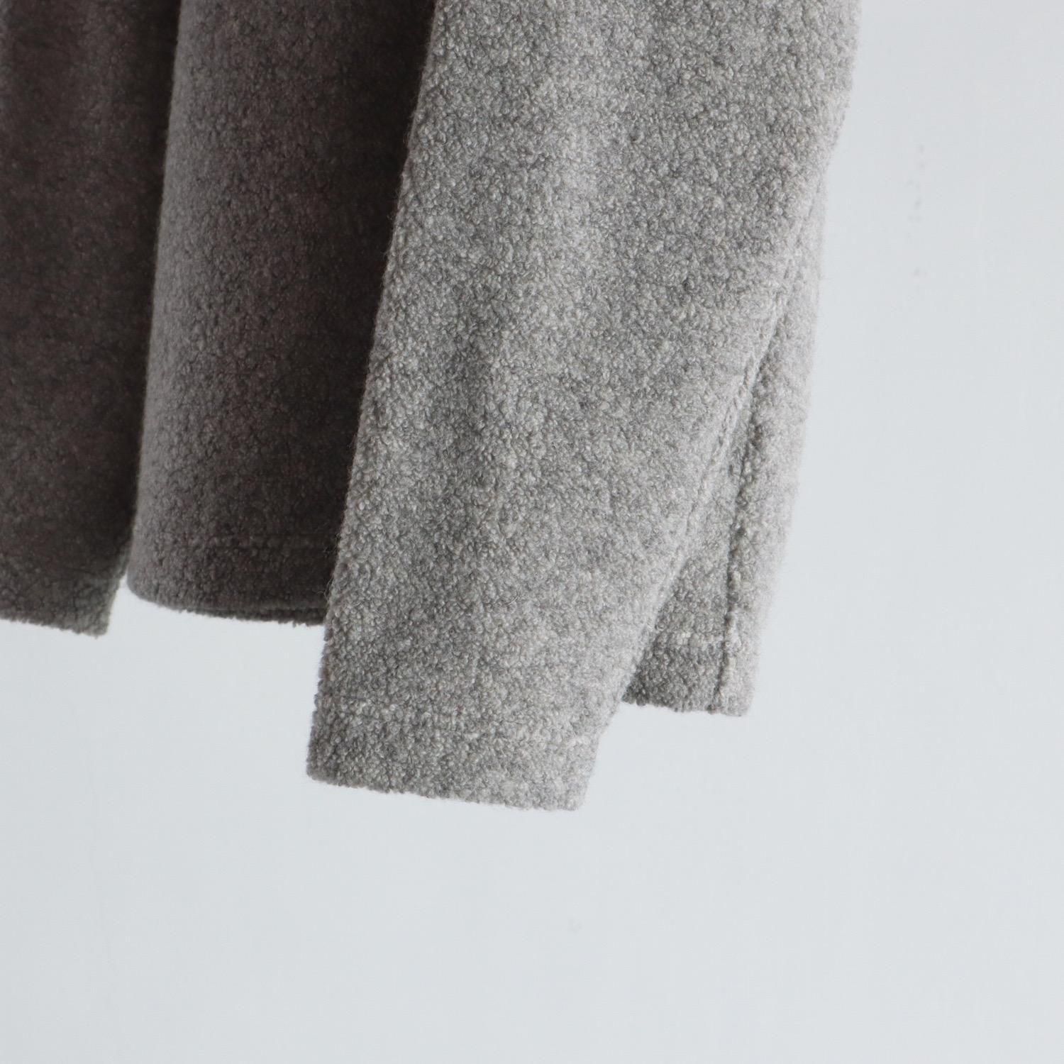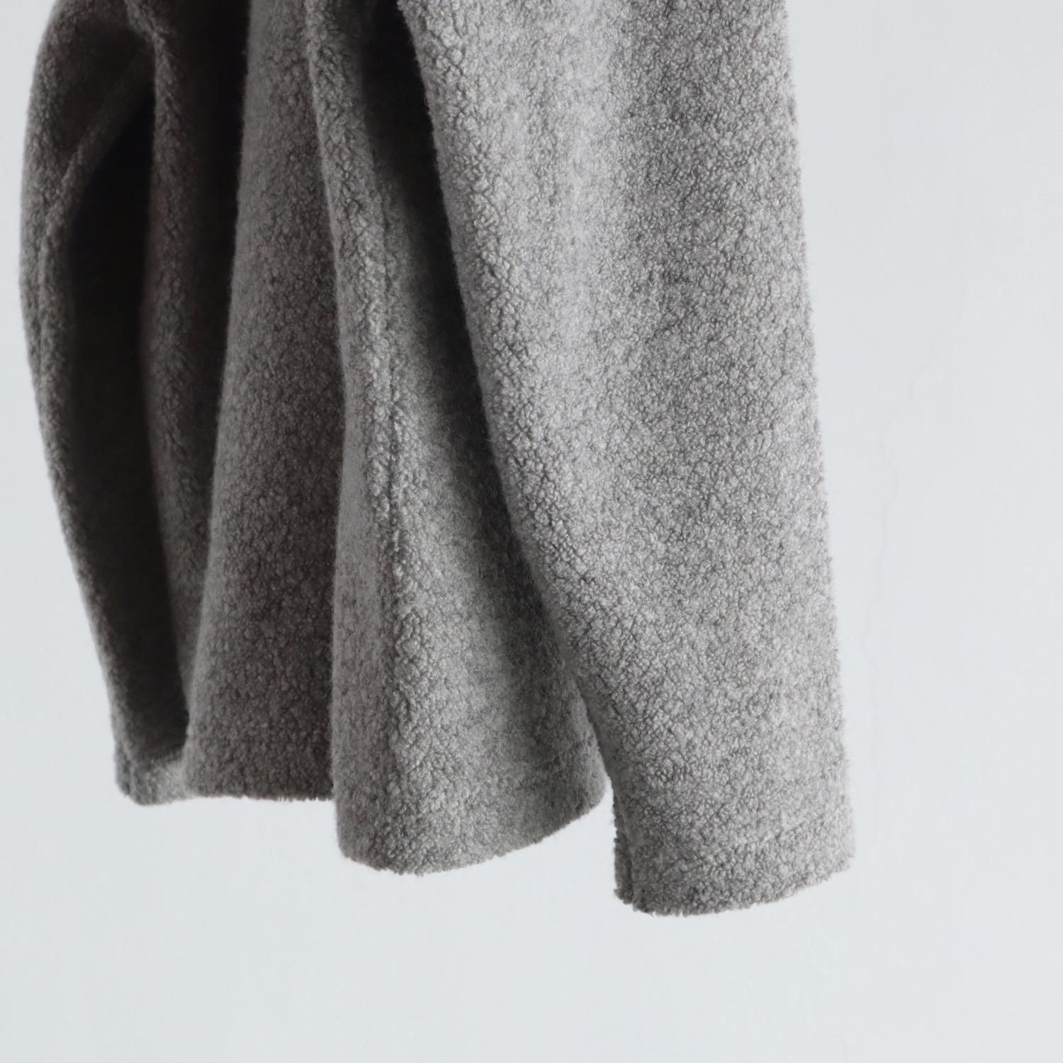 ウールを中心とした糸で軽くて暖かみのあるパイル生地を作りました。表面のパイルがモコモコ感を出していますが、裏面はフラットで滑らかな生地です。直接素肌に触れてもチクチクせず、心地良く着られます。