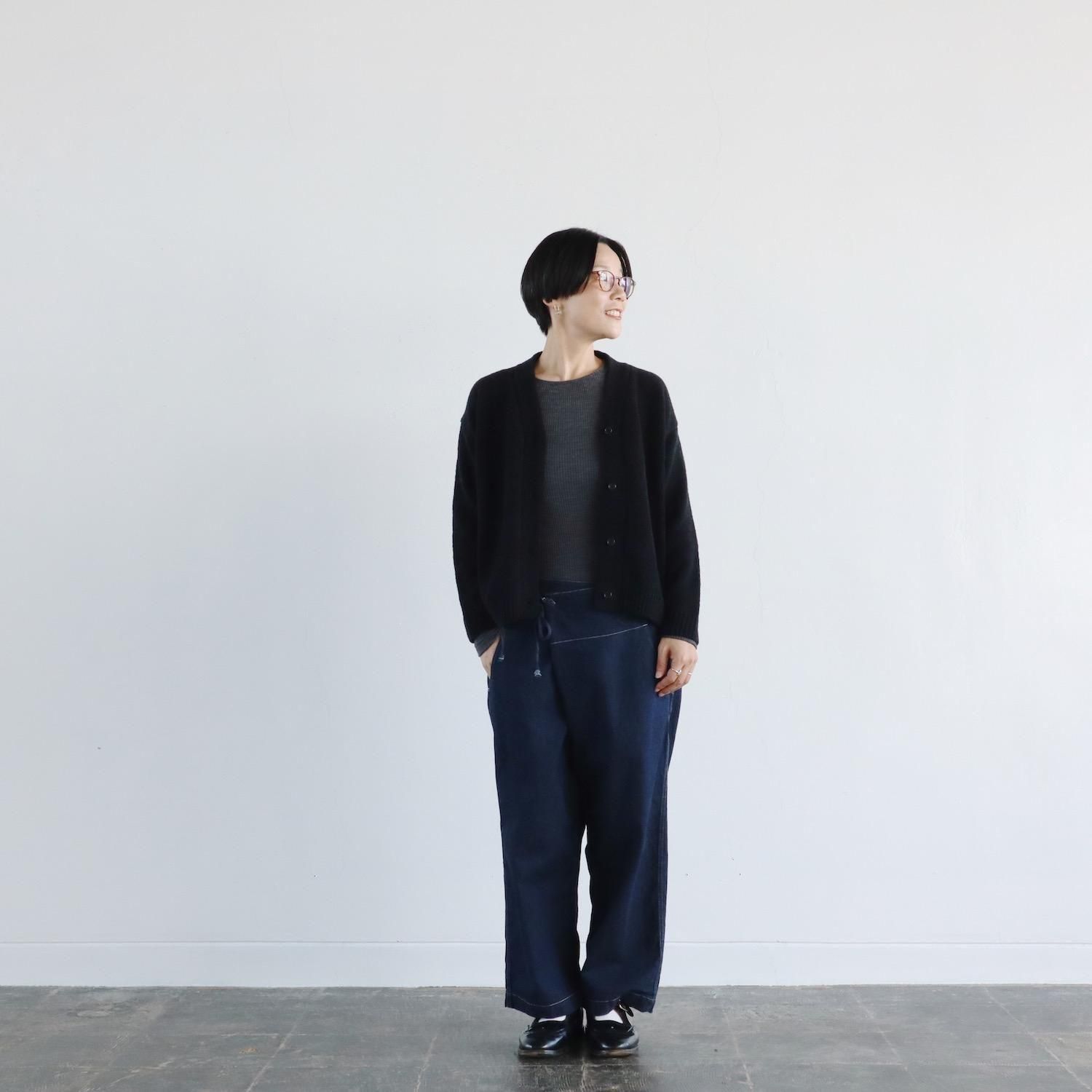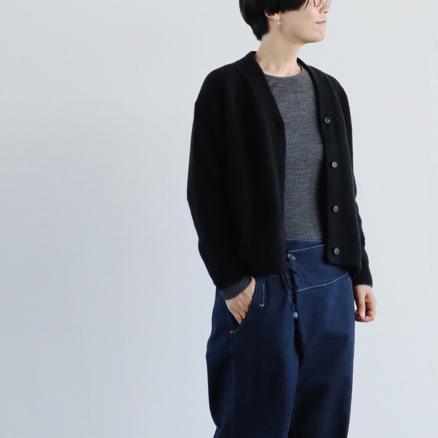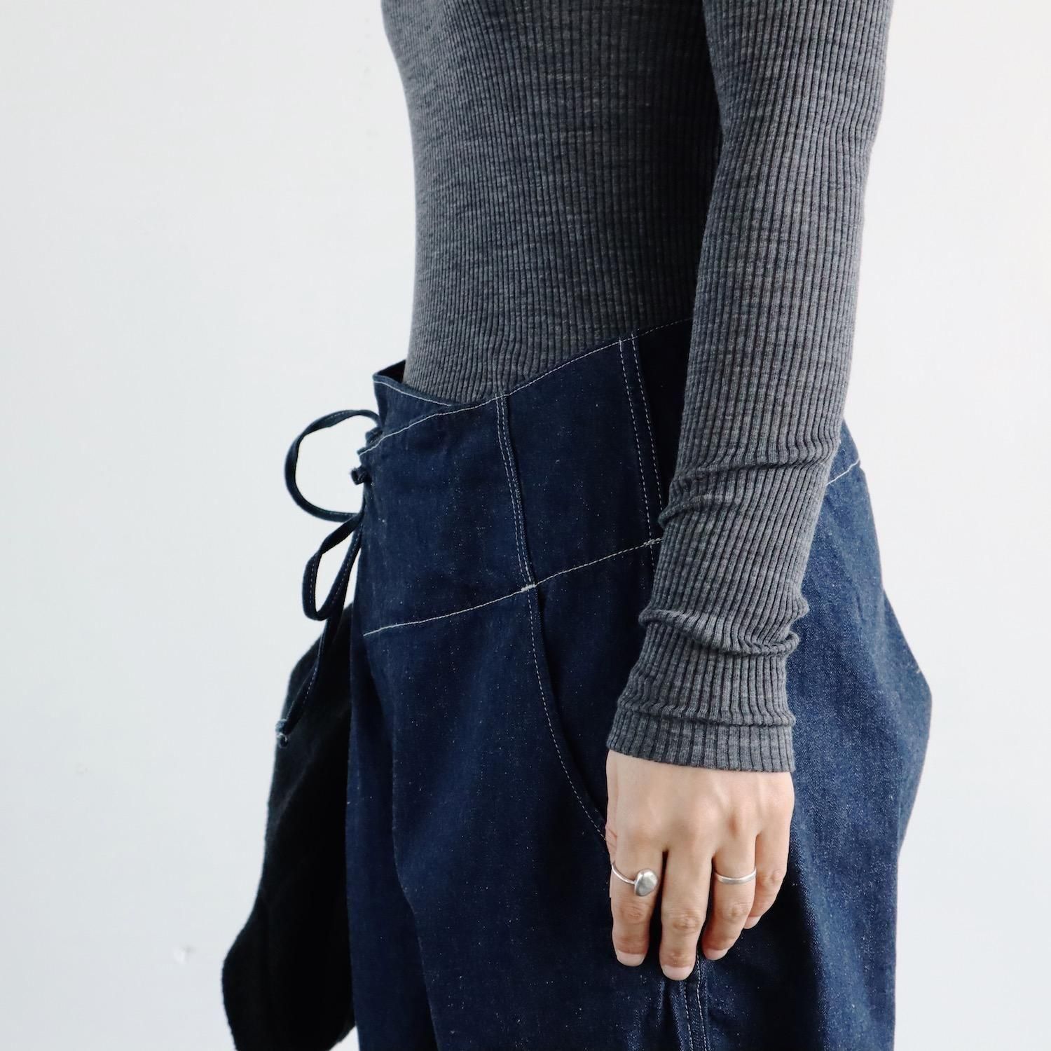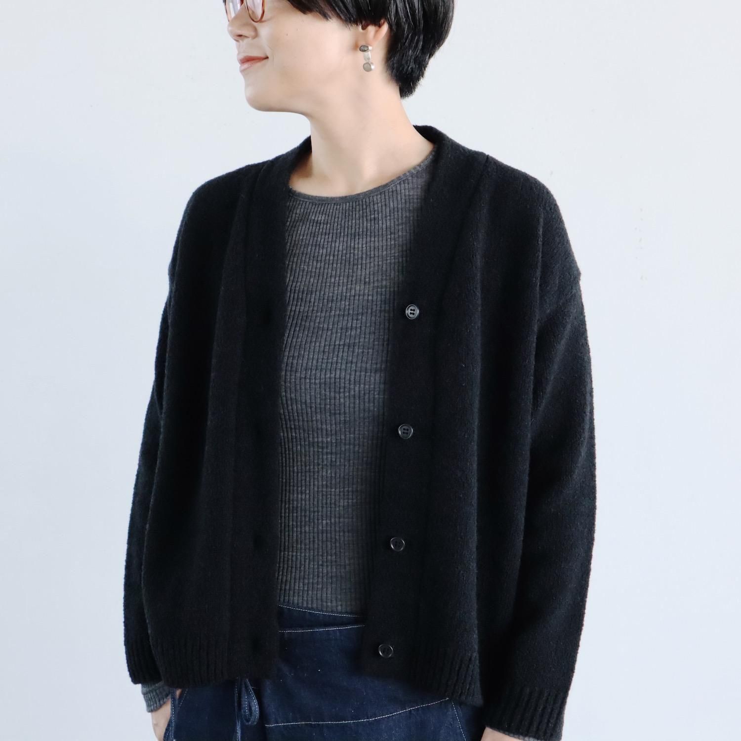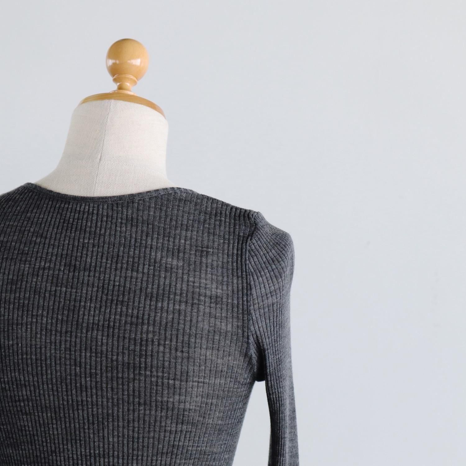 この柔らかなウール素材は、ニュージーランドでのびのびと育ったメリノ羊から生まれます。極細でとても長い繊維のウールを、ゆっくりと編み立て仕上げています。身頃に縫い目のない丸胴編みで、ノンストレスな着心地です。