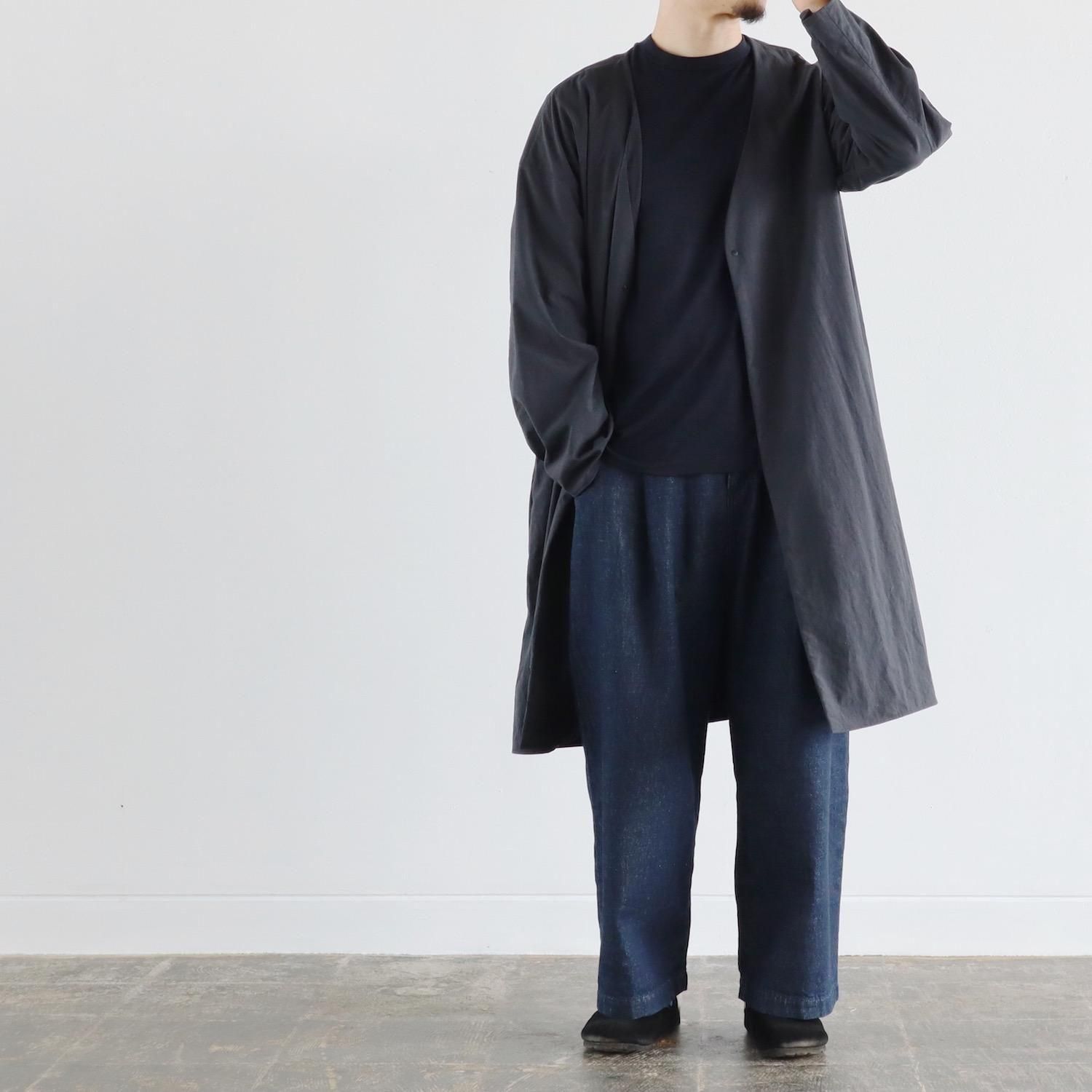 その素材だけでも十分に気持ち良いんですが、毛羽立ちを抑える為の一手間を加え、時間を掛けて丁寧に染色をする事で、素肌に着たくなる程に気持ち良い生地が出来上がります。ほんのりと美しい光沢があり、上品に見える仕上がりです。