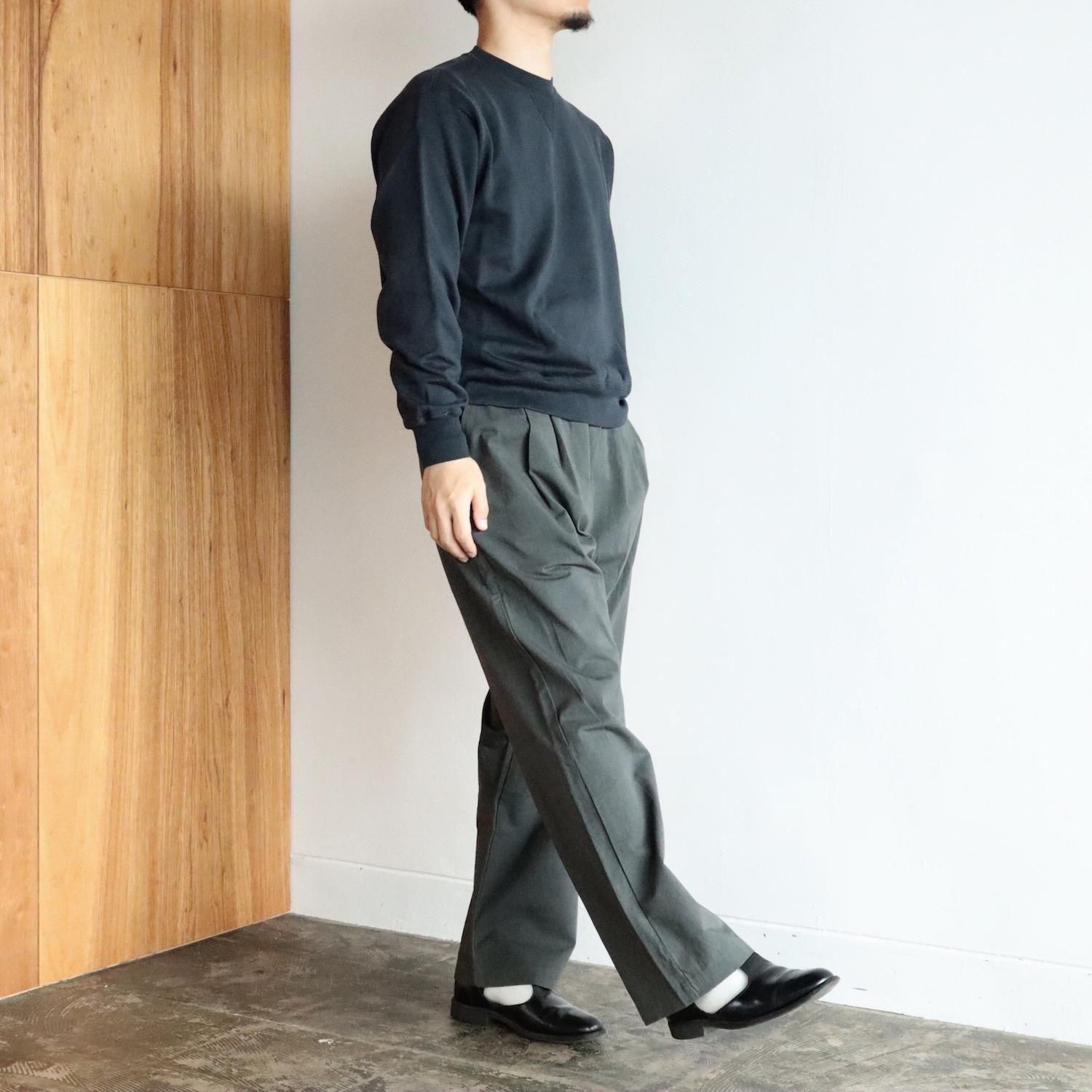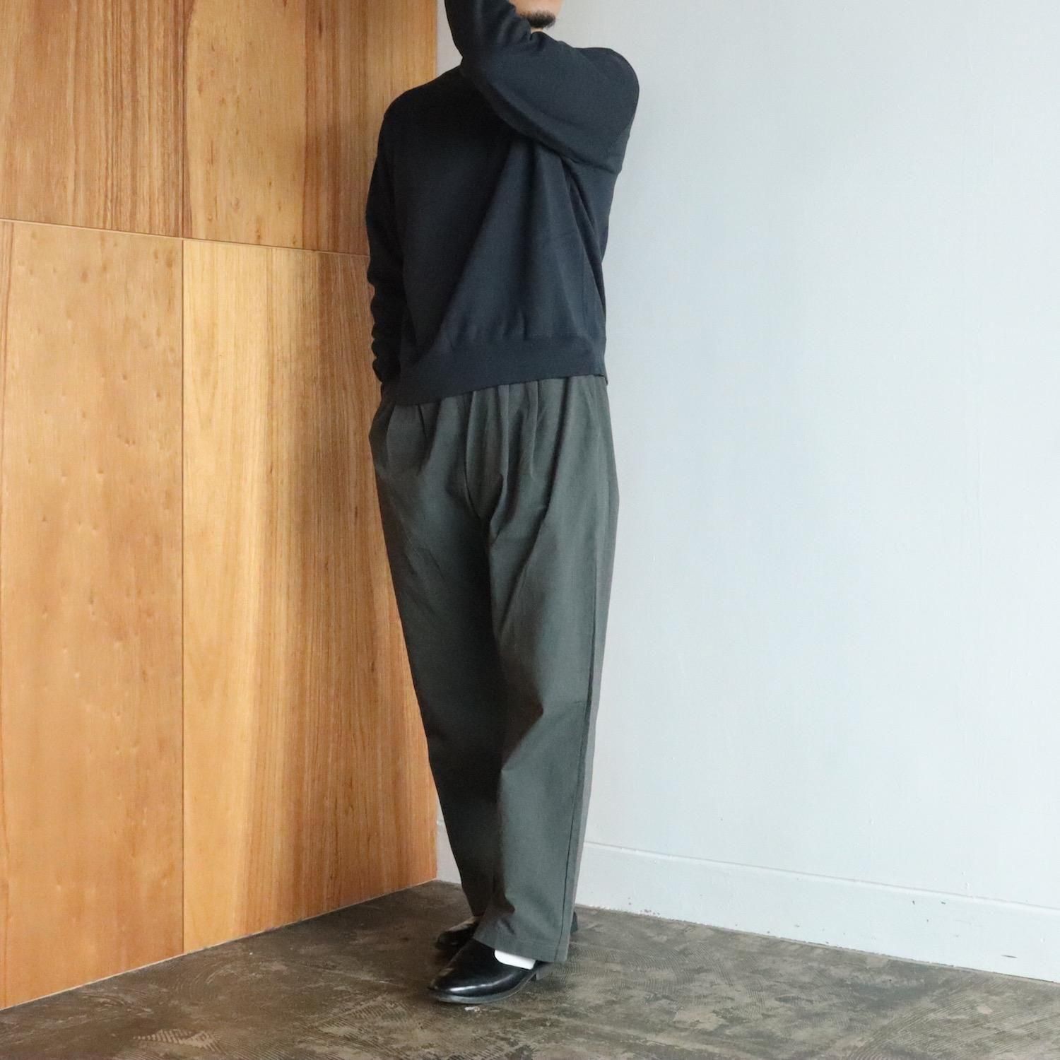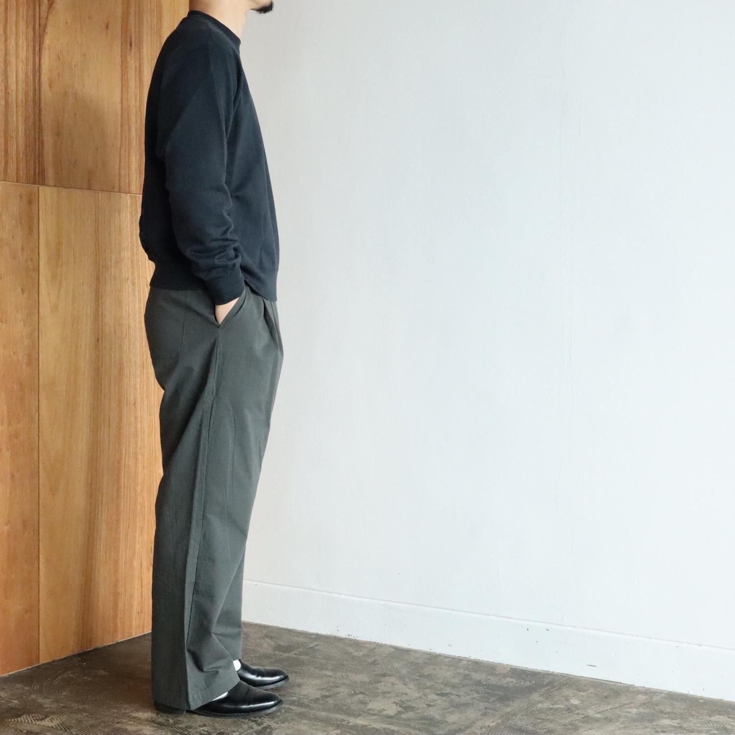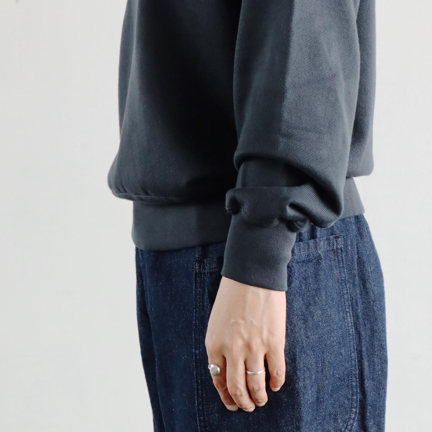 首元のVガゼット、キュッと締まったリブに袖口のたまり感など、デザインはオーセンティックなスウェットを踏襲しつつ、現代的なシルエットにアレンジしました。短めに整えられた着丈のお陰で、ワイドパンツやスカートを合わせてもきれいにまとまります。
