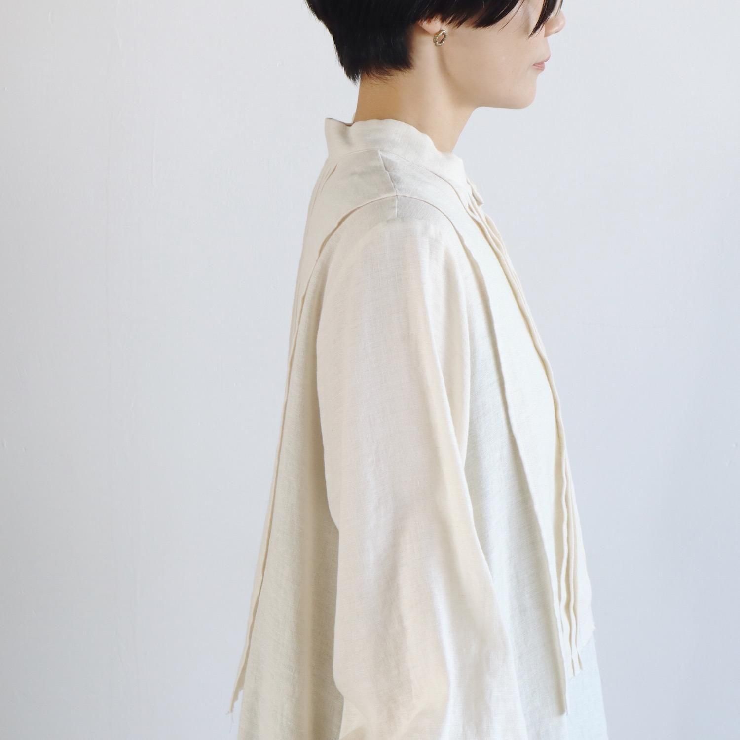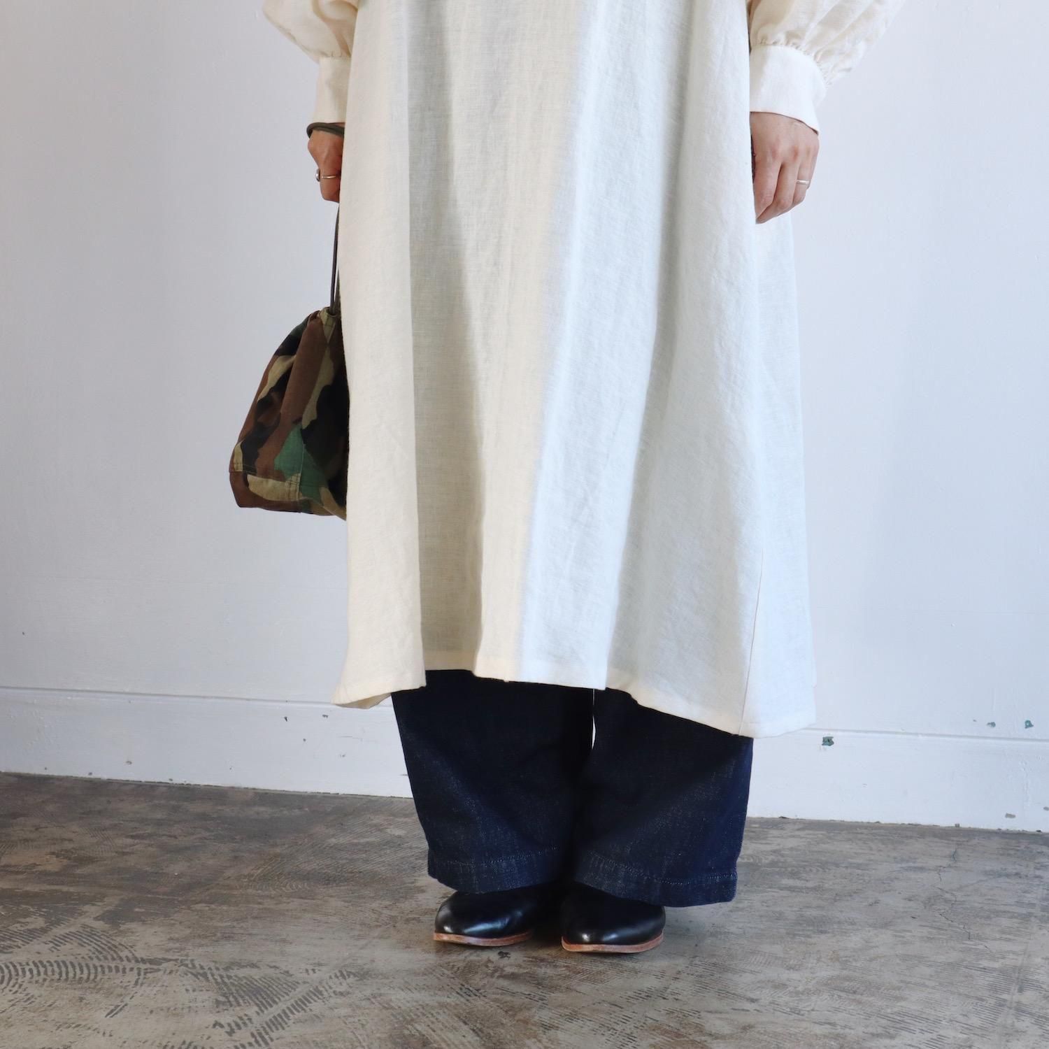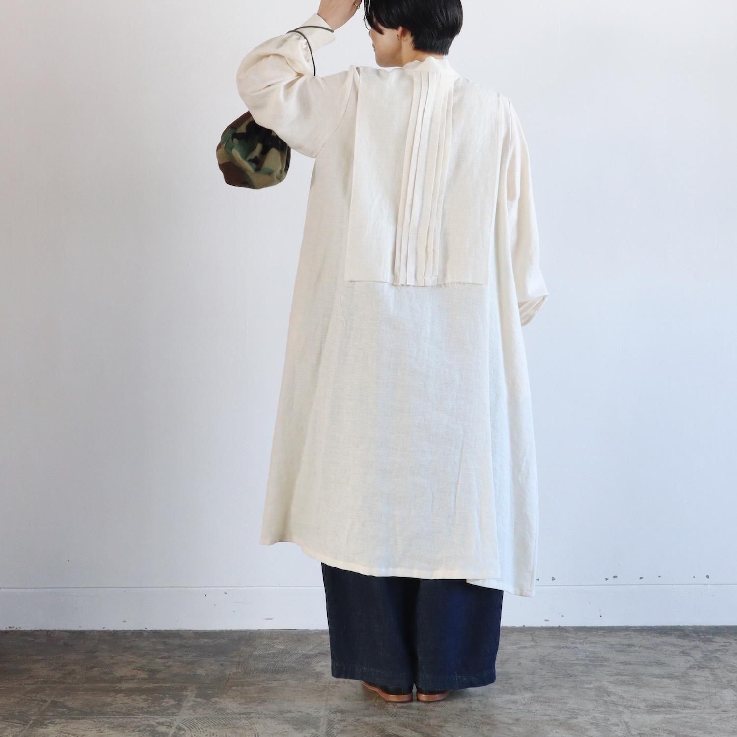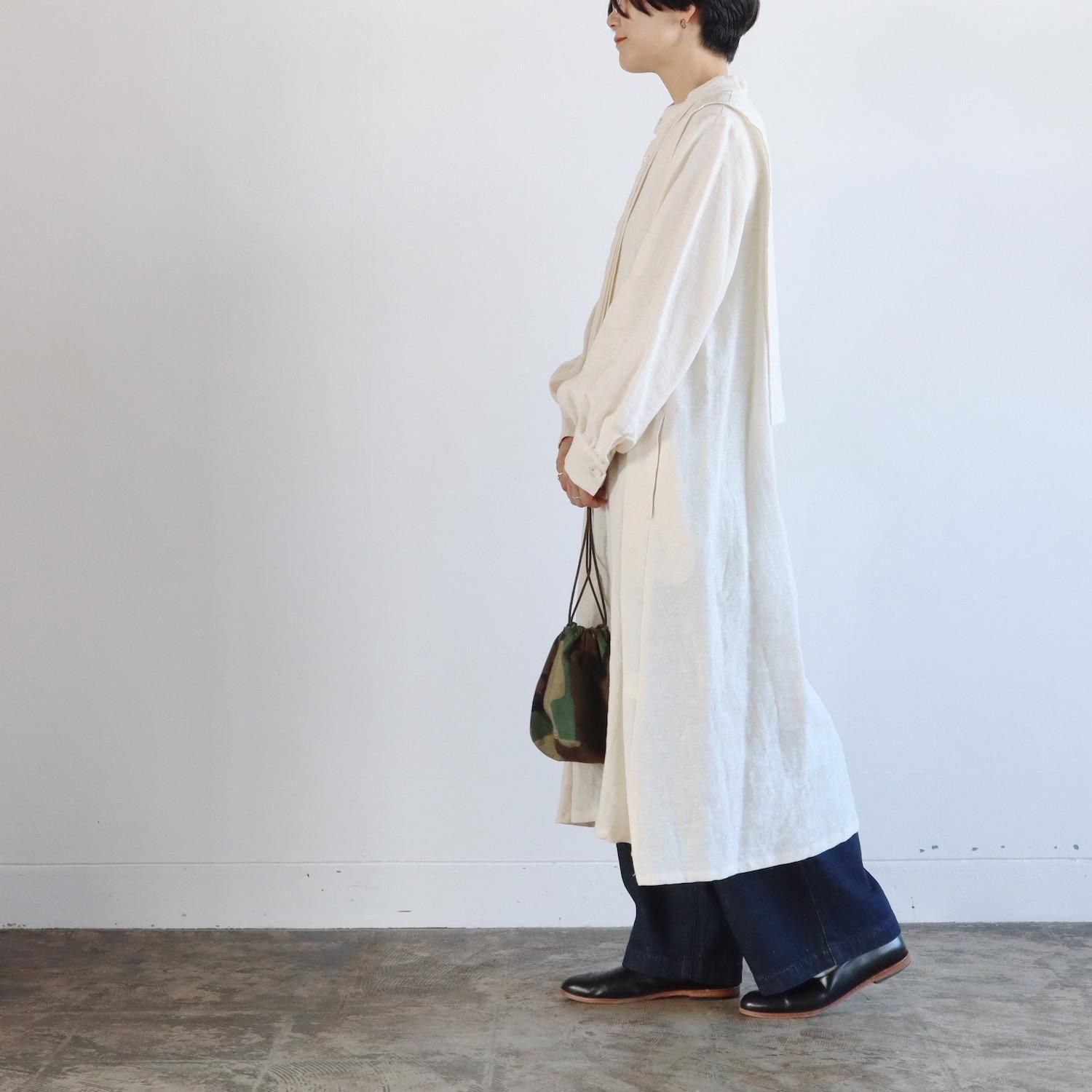 単純に重ねるのではなく、前立てのパターンに創意工夫を凝らすことで、ベストをドッキングしたような特徴的なデザインを実現しました。シンプル一辺倒になりがちなナチュラルなAラインのワンピースに、裾を裁ち切りにした粗野な雰囲気の胸当てを加えることで、一線を画す仕上がりになっています。