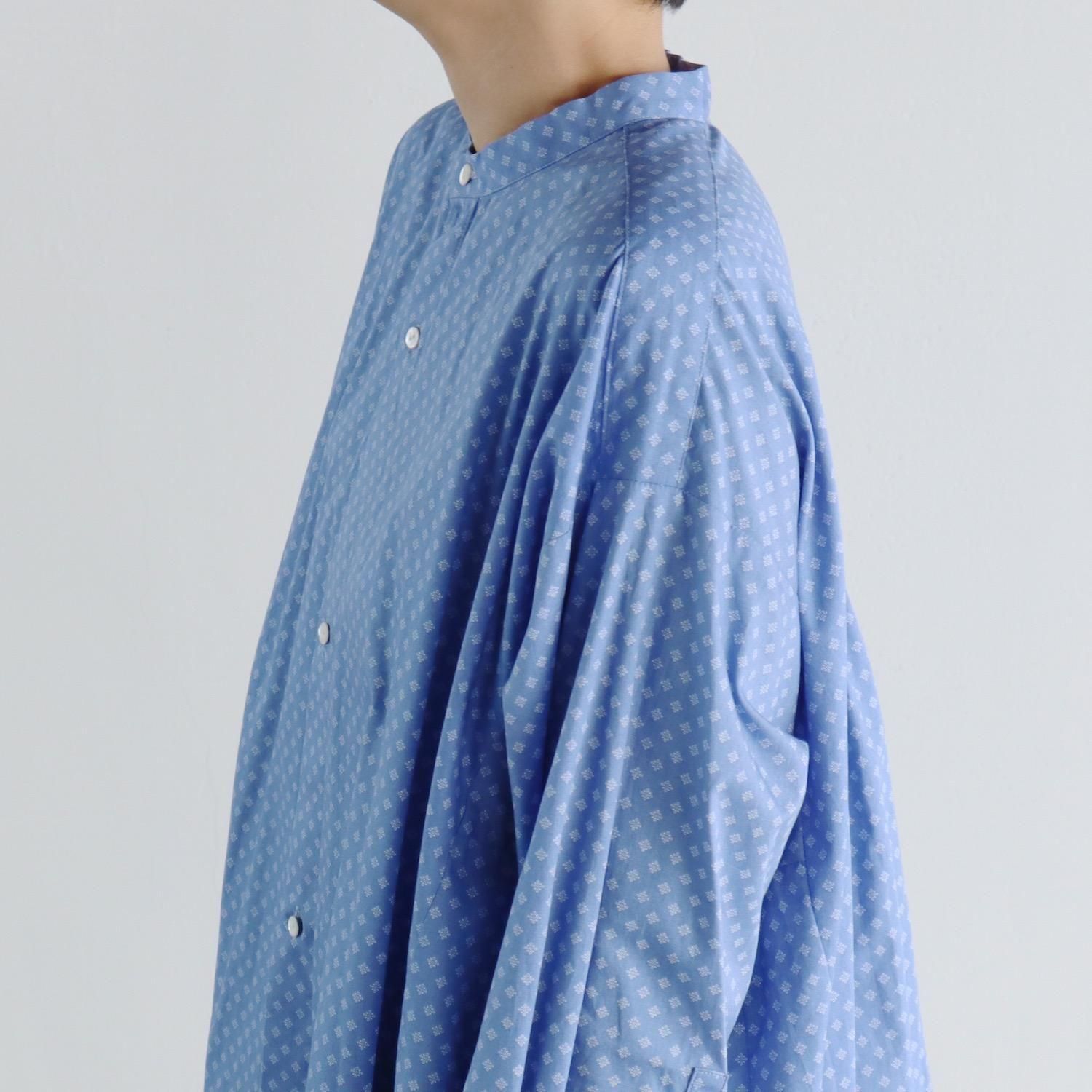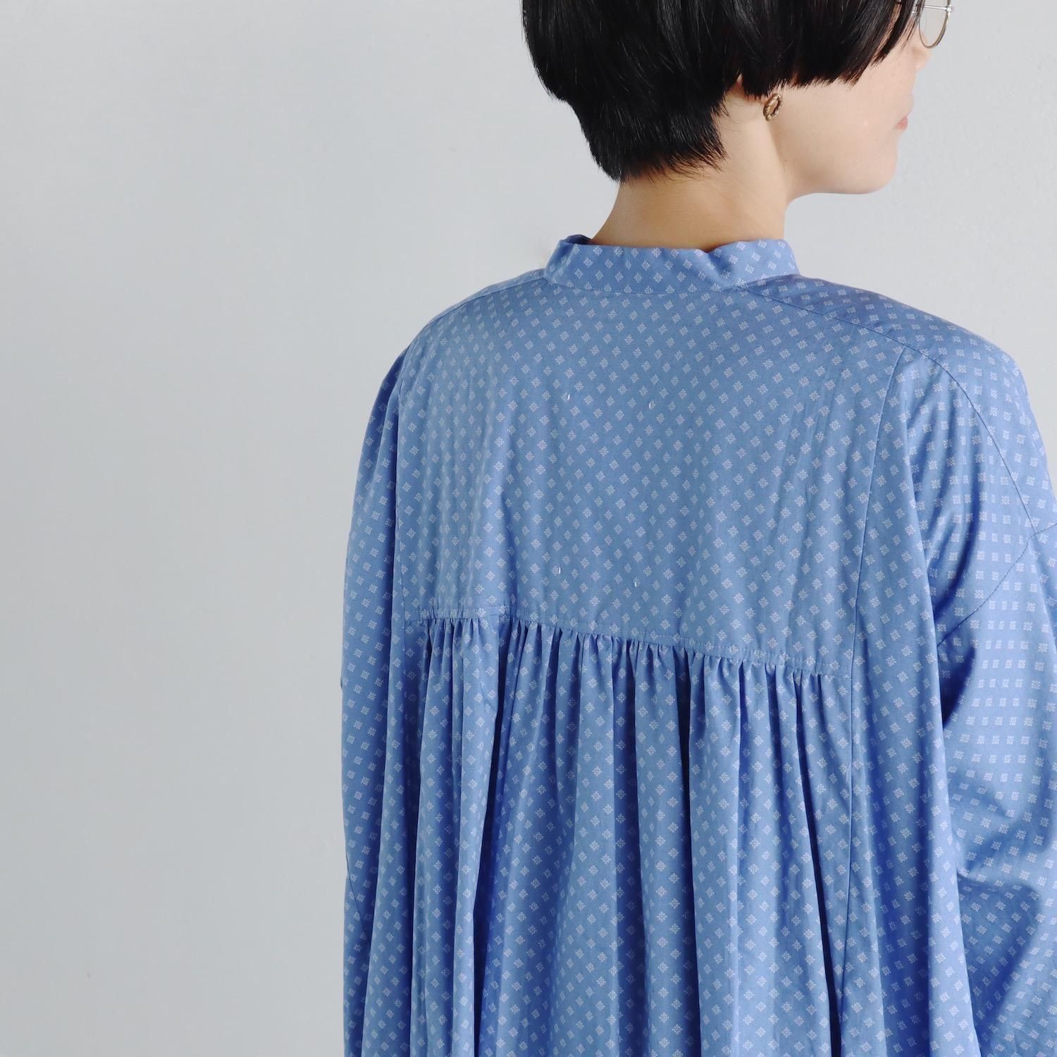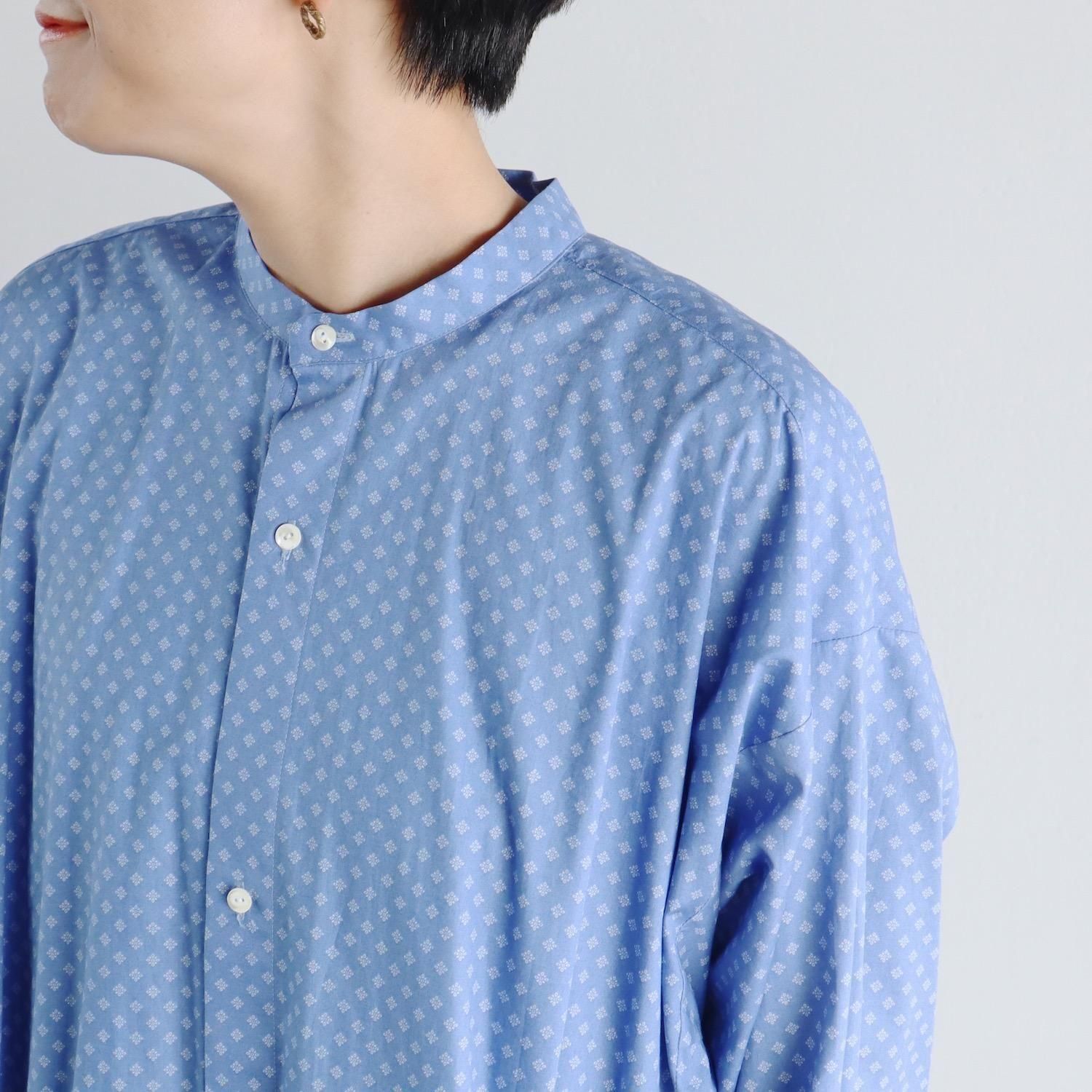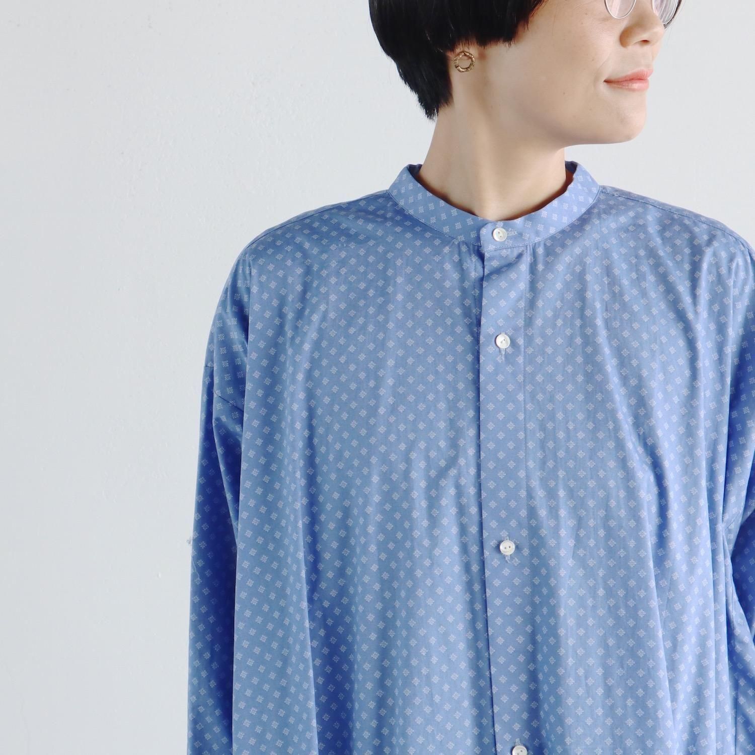 花や蕾のような幾何学模様がプリントされたブロード生地。高密度で織り上げられた程よい肉感と適度なハリを持った素材で、イージーケアでキレイな表情が長く続く、扱いやすさも魅力の素材です。