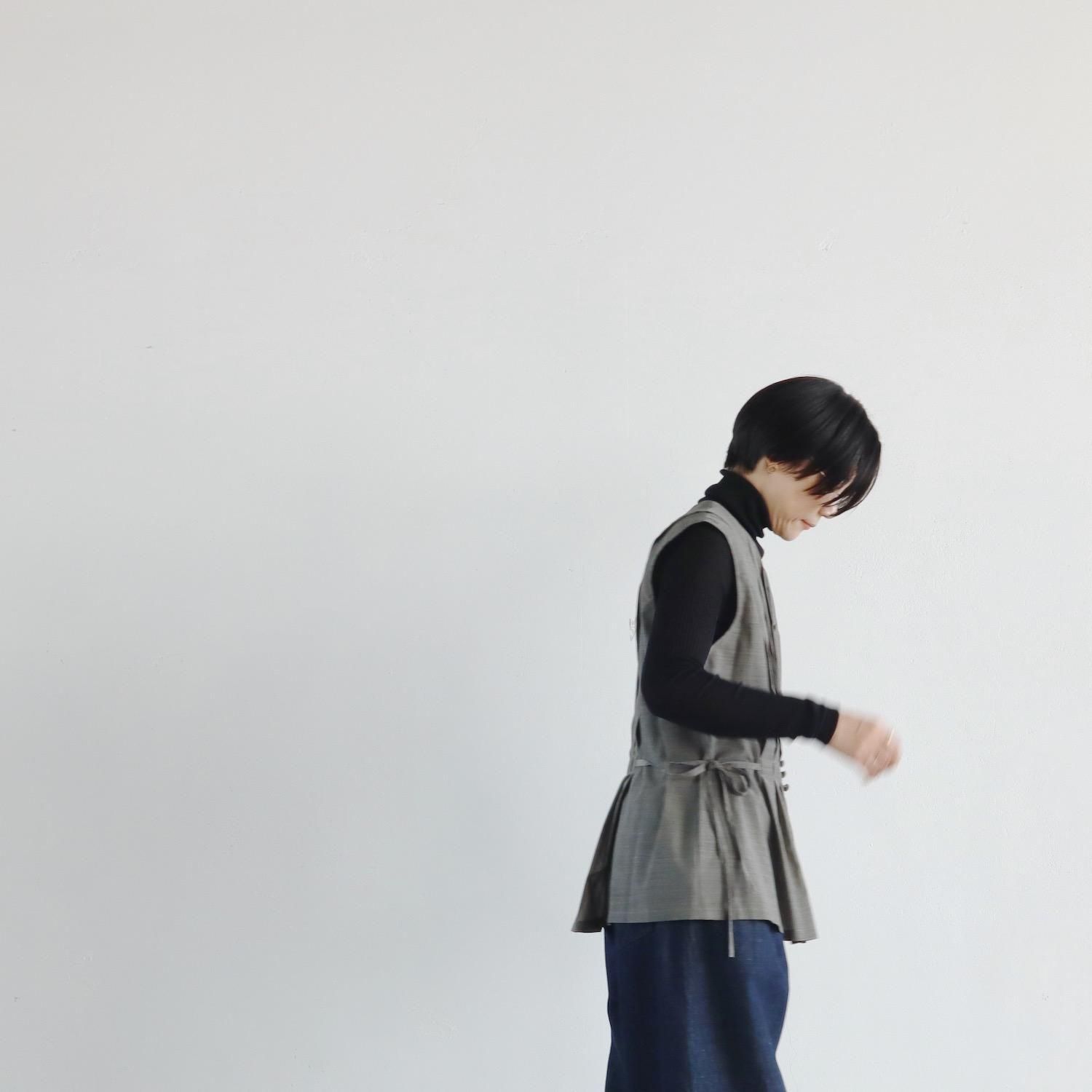 襟元や肩から裾に向けて配した直線的なタックはマニッシュな印象です。一方、首元は柔らかなカーブで切り替え、大和撫子な空気を演出しています。ポンポンポポポンというリズムでフロントにつけられたボタンは、可憐に咲いたスズランのようです。ウエストのドローコードで、シルエットの変化もお楽しみいただけます。