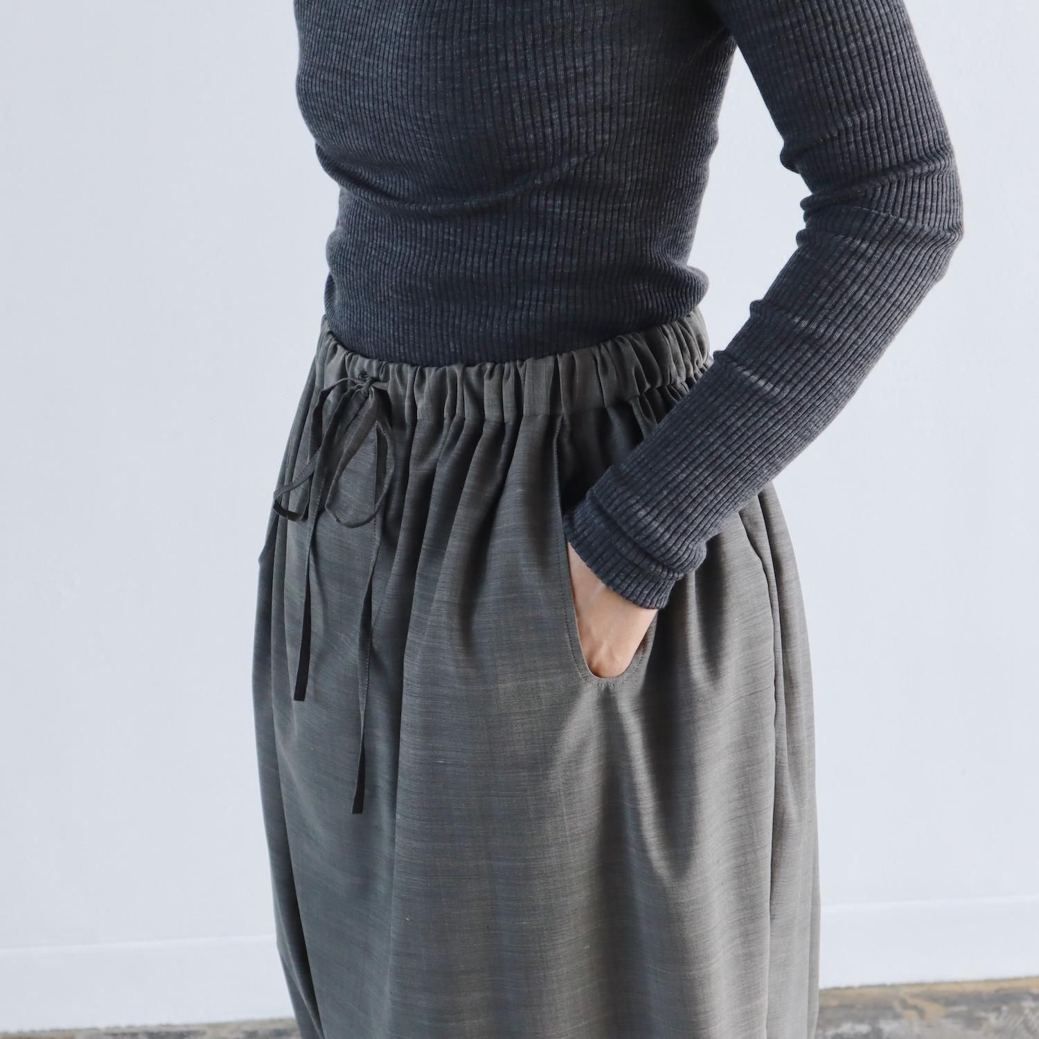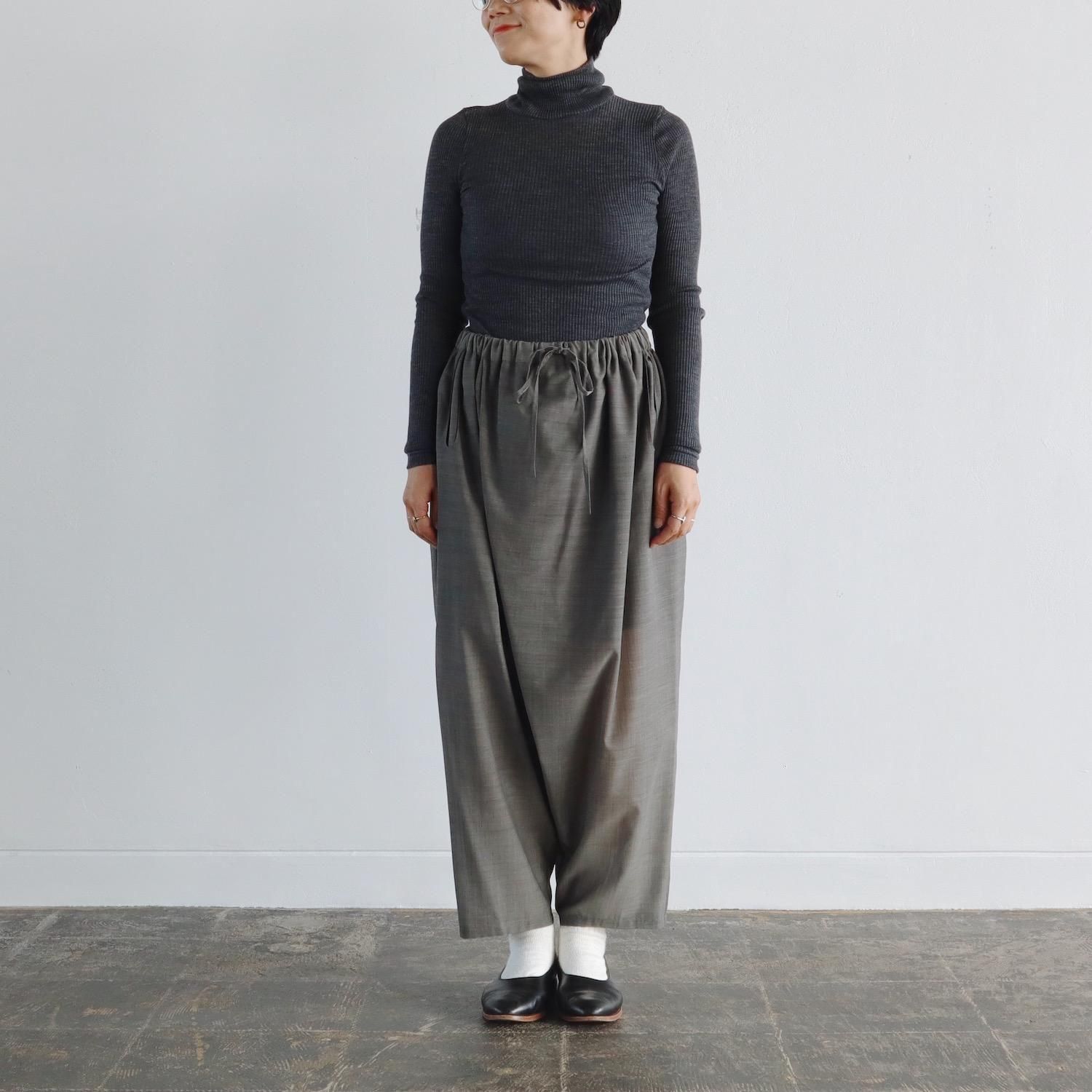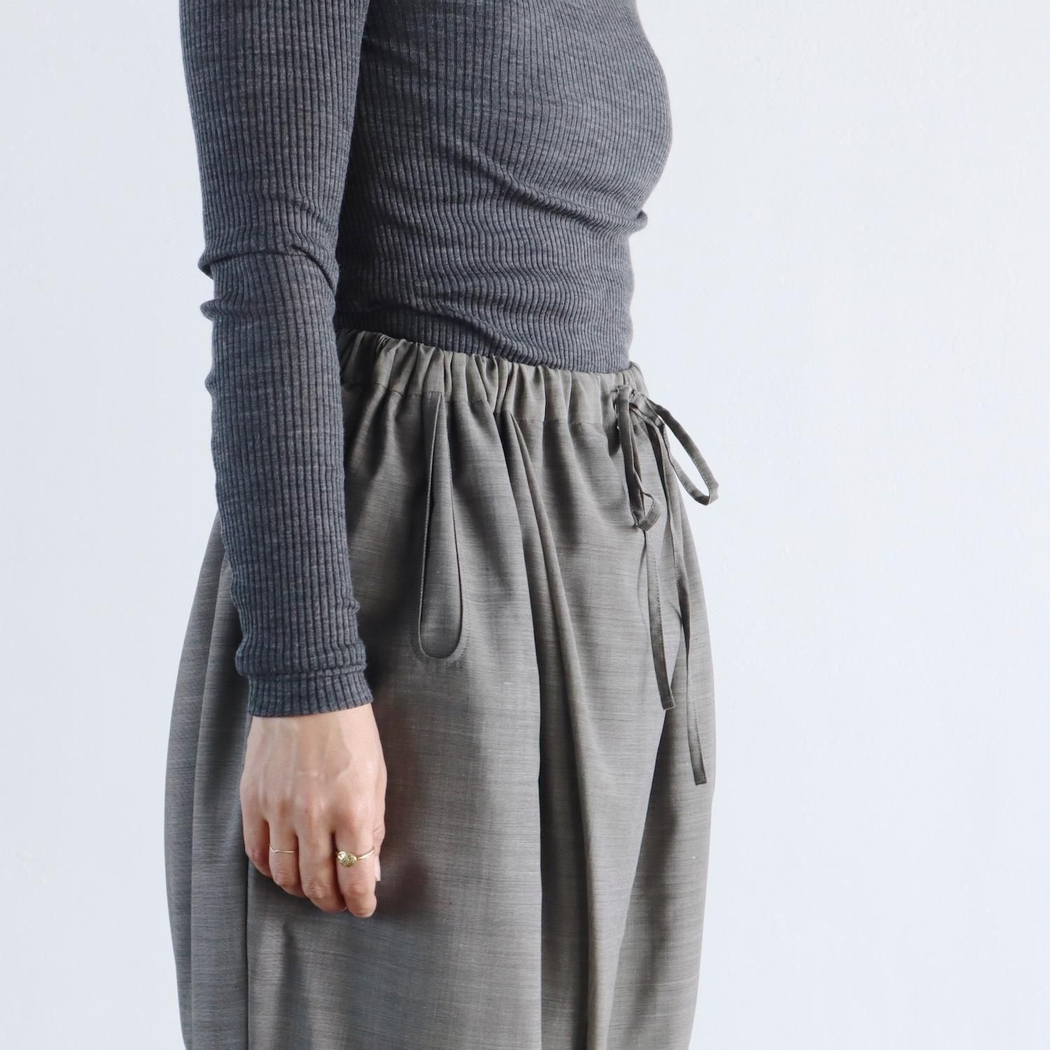 東アジアの伝統的な腰布からイメージを膨らませた、ラップ風デザイン。ドローストリング付きのイージー仕様と、プチサルエルと呼びたくなるほどのヒップ周りのゆとりで、締め付けの少ないラクな履き心地を叶えます。