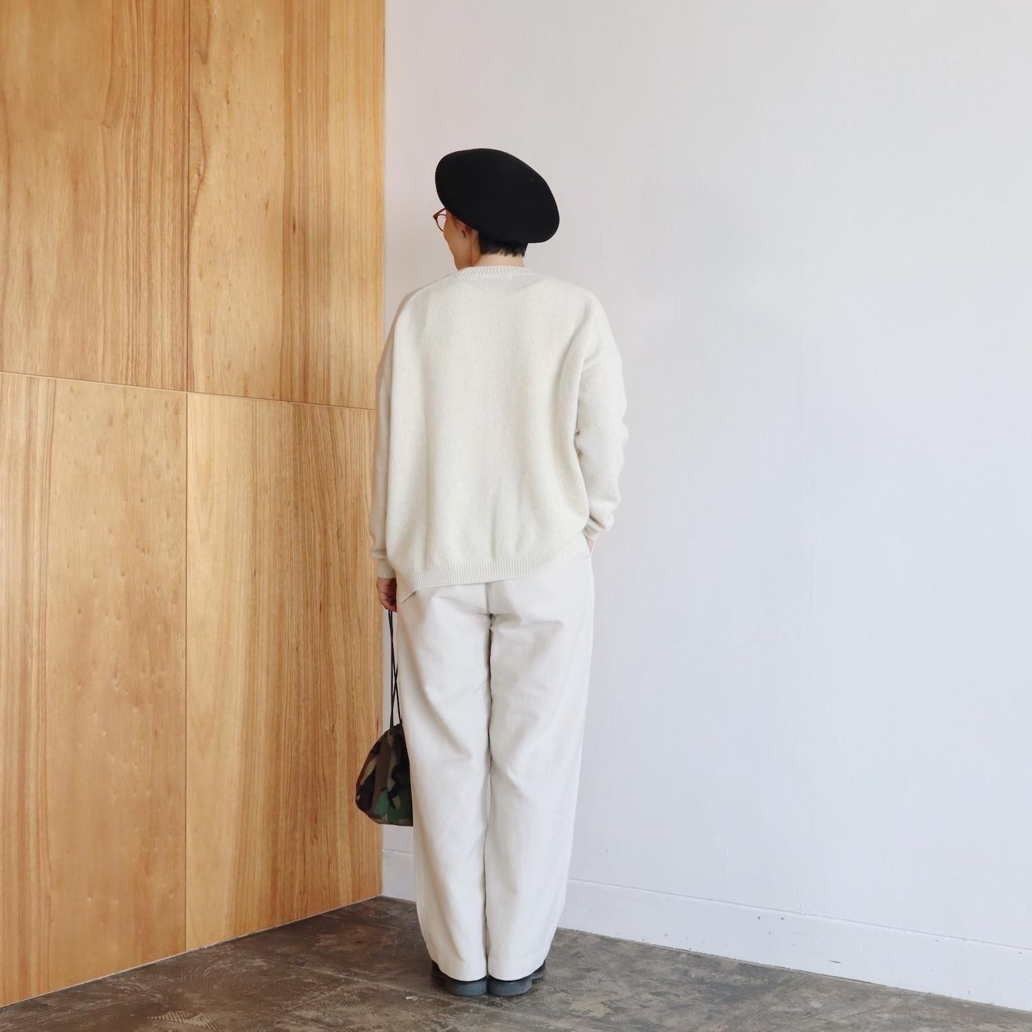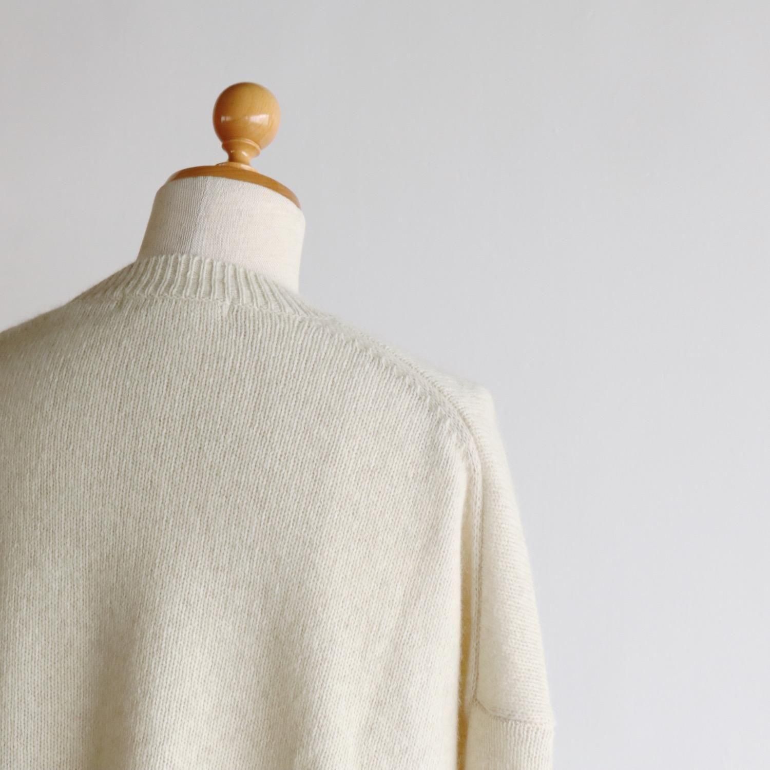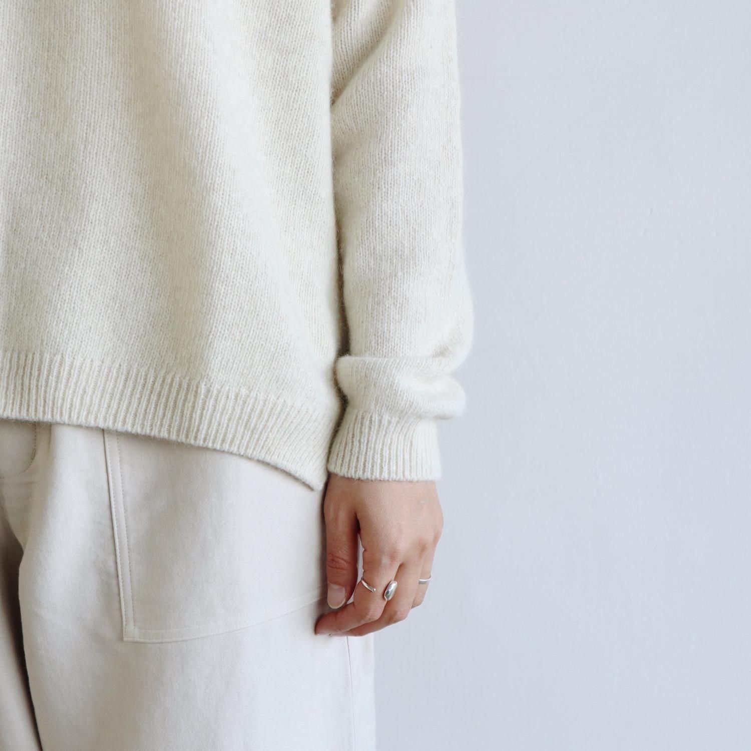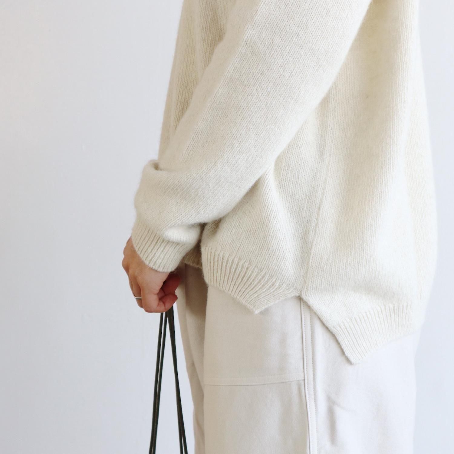 もっちりとしたメリノウールと、フワフワのブルーフォックスをブレンドしたニットは、柔らかさ・軽さ・温かさがあり、その肌触りの良さは、カシミヤと肩を並べます。普通のようでいて全然普通じゃない、着ているとその肌触りや着心地に気持ちがぐんぐんと上がっていきます。