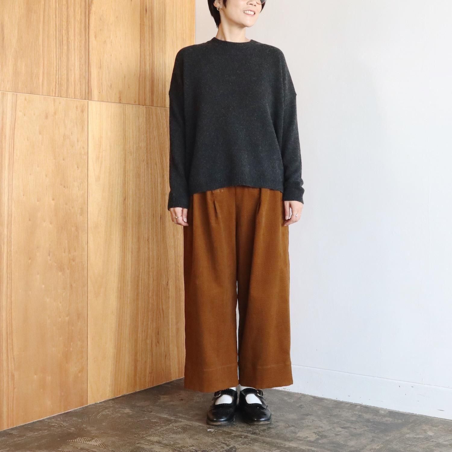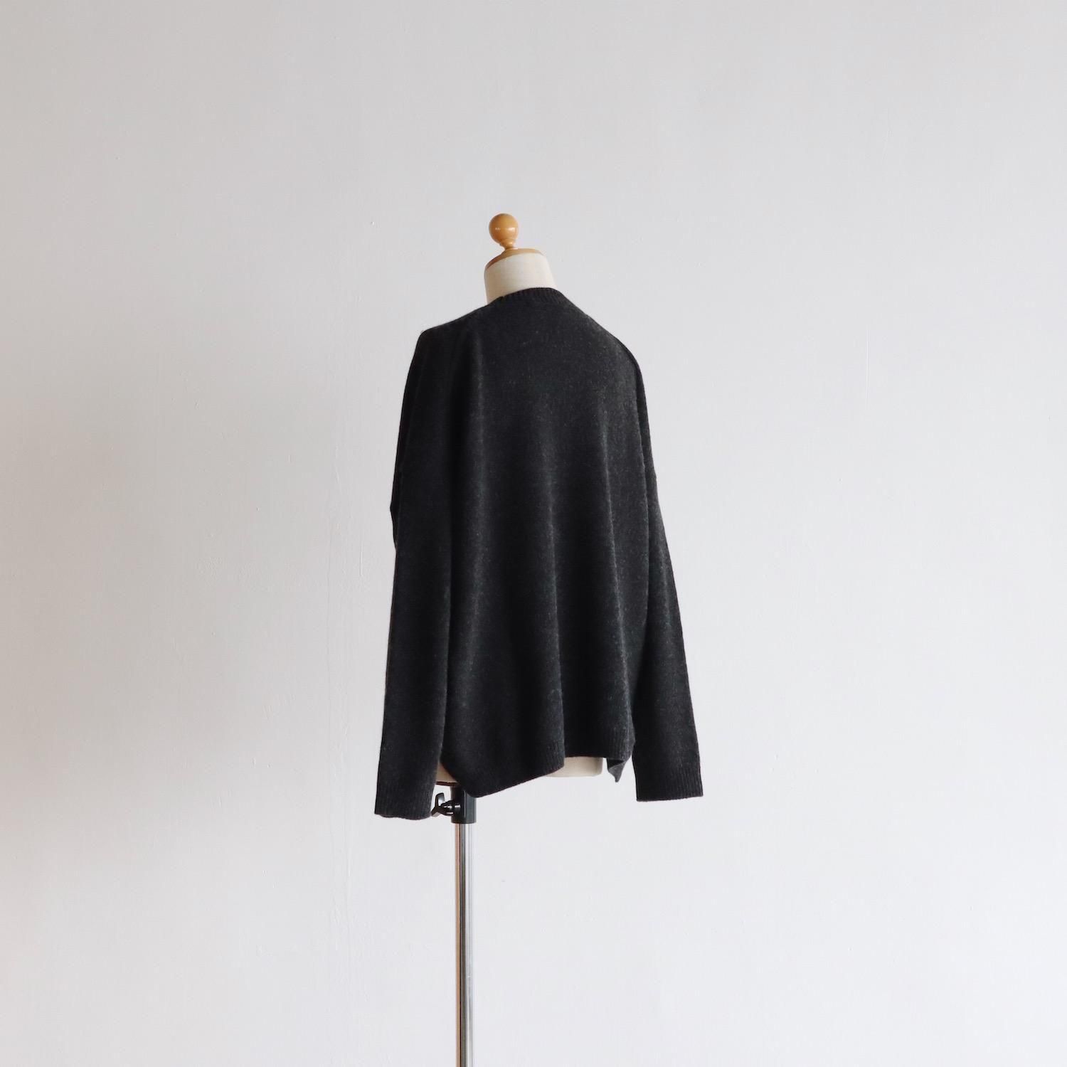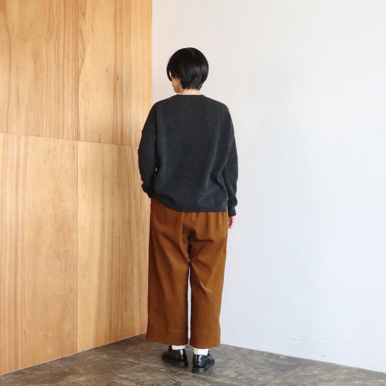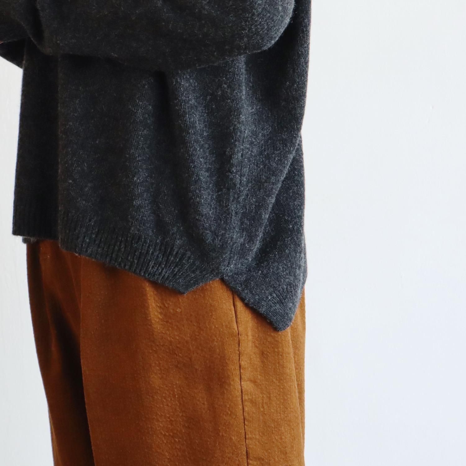 ドロップショルダーに広めの身幅で、ザックリと着られるゆとりのあるデザインです。サイドにはスリットが入り、後ろ身頃がやや長めに作られています。ボリュームのあるパンツやスカートとも合わせやすい仕様です。