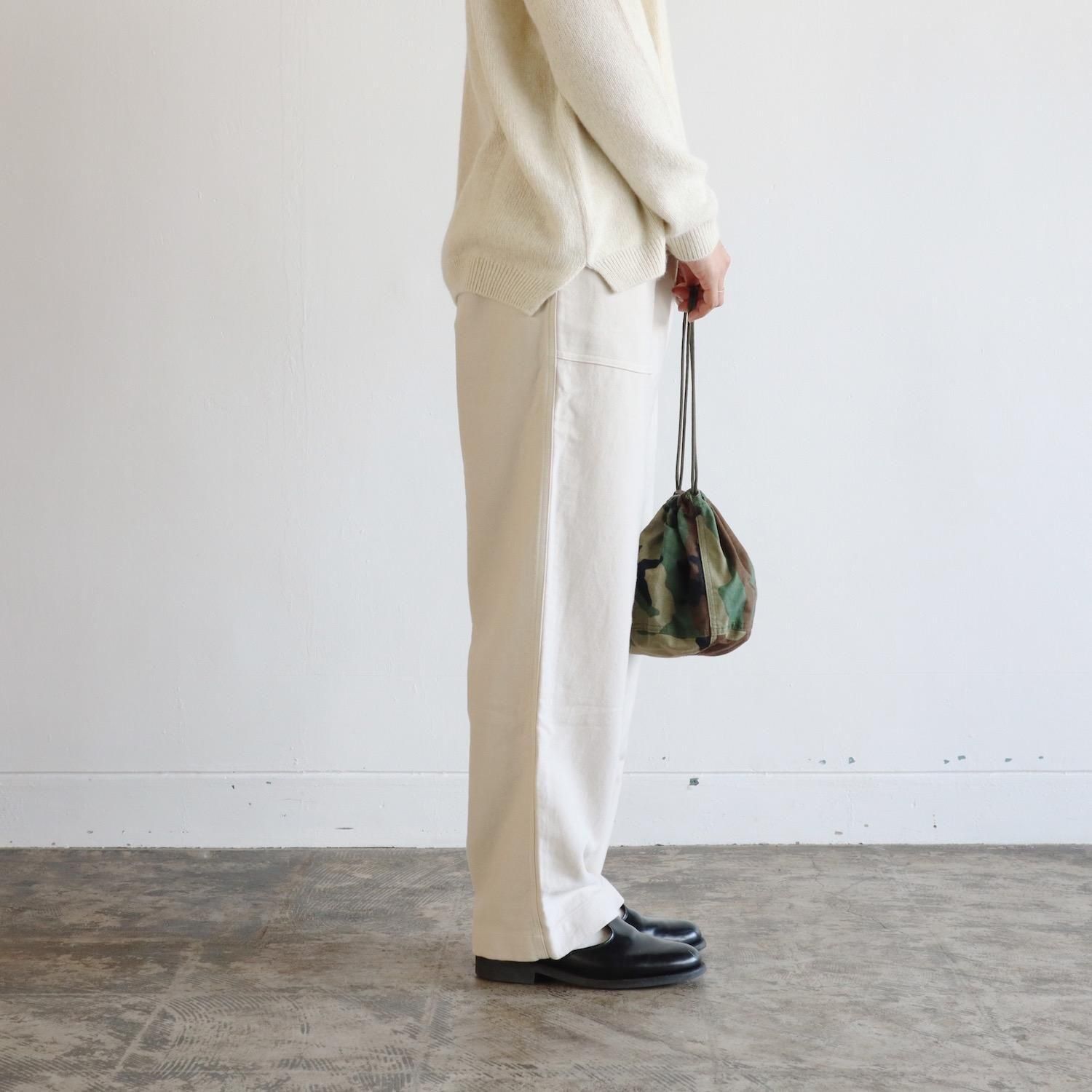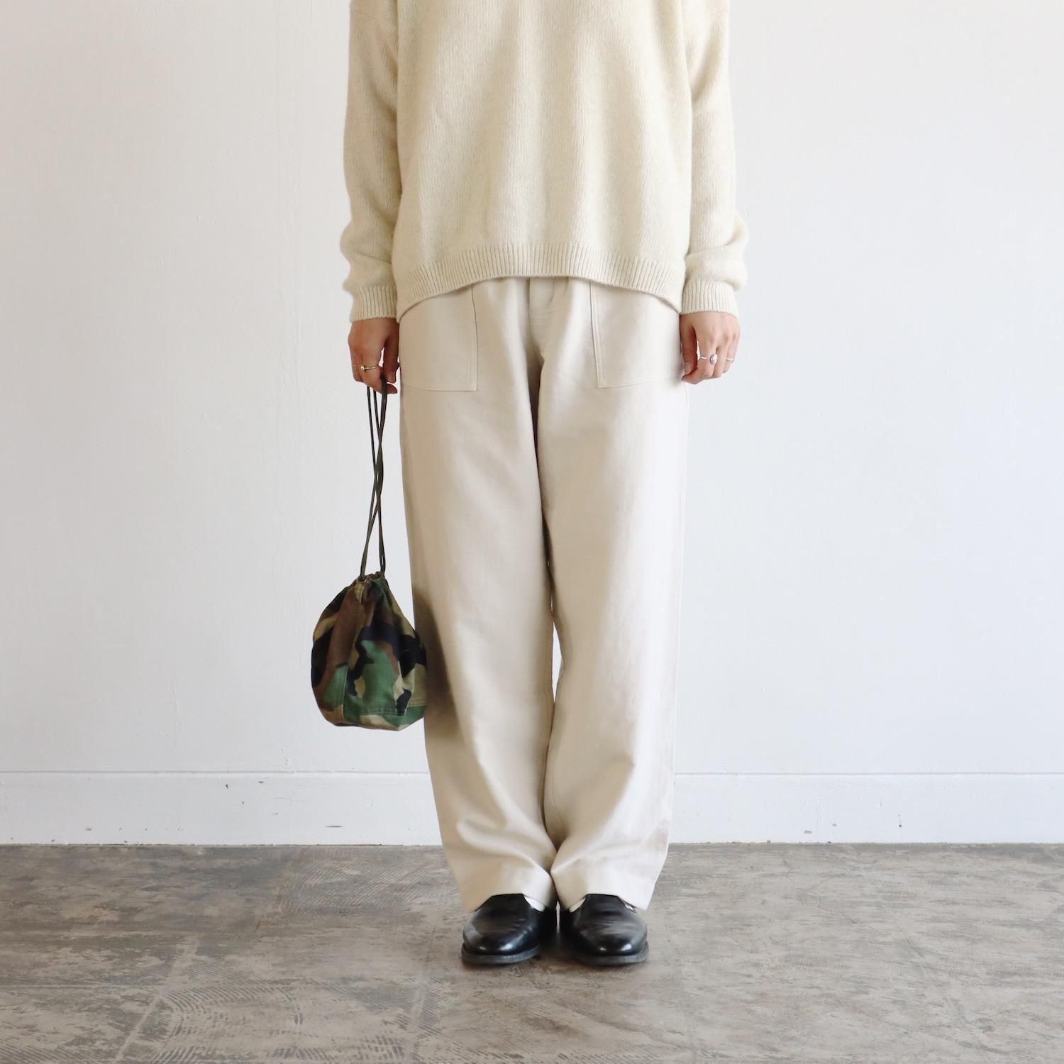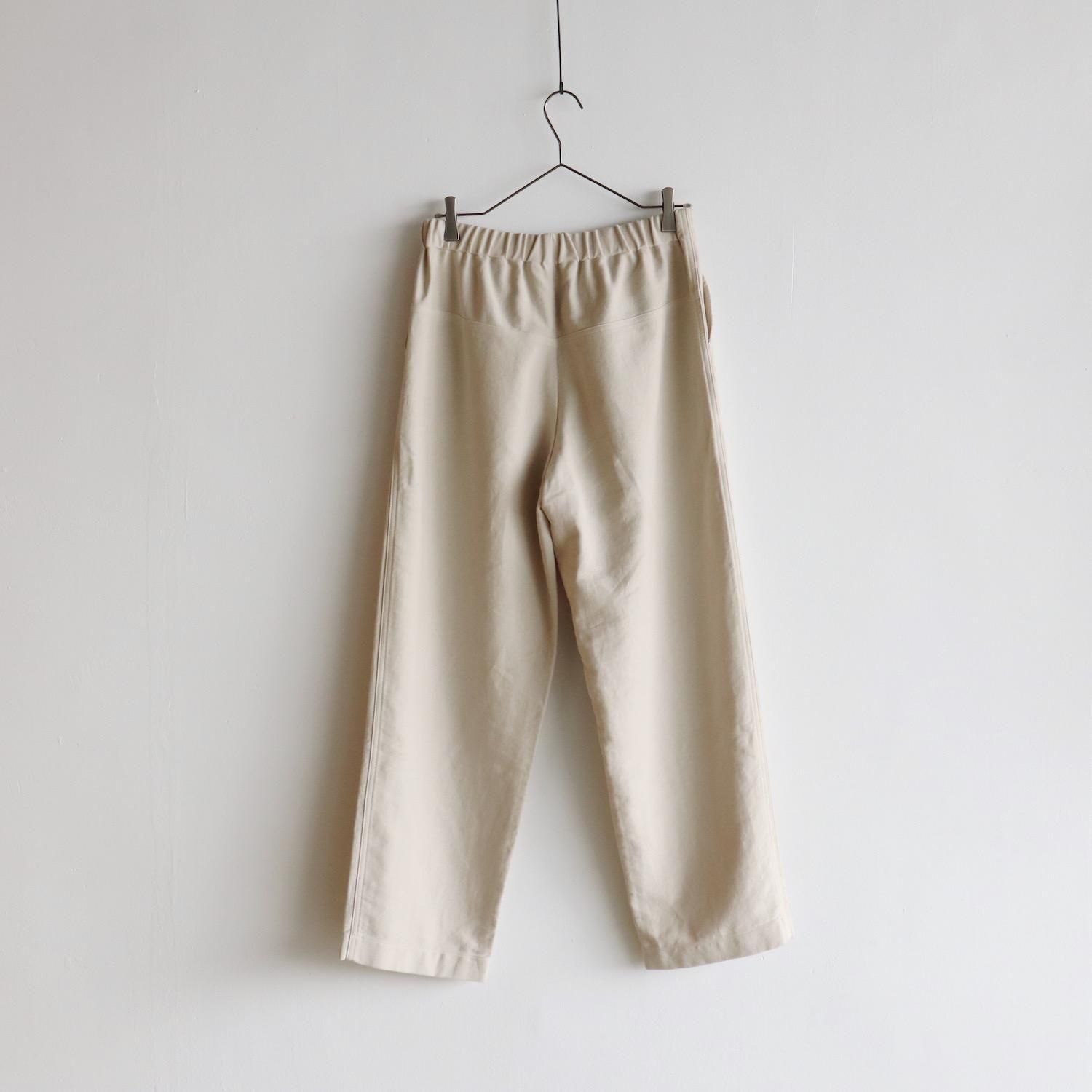 ウエストはゴム+紐のイージー仕様になっており、細かなサイズ調節が可能。綺麗なストレートシルエットで、ポケットのステッチがアクセントになっています。シャツやモコモコニットなど、幅広く合わせやすい癖のないデザインです。