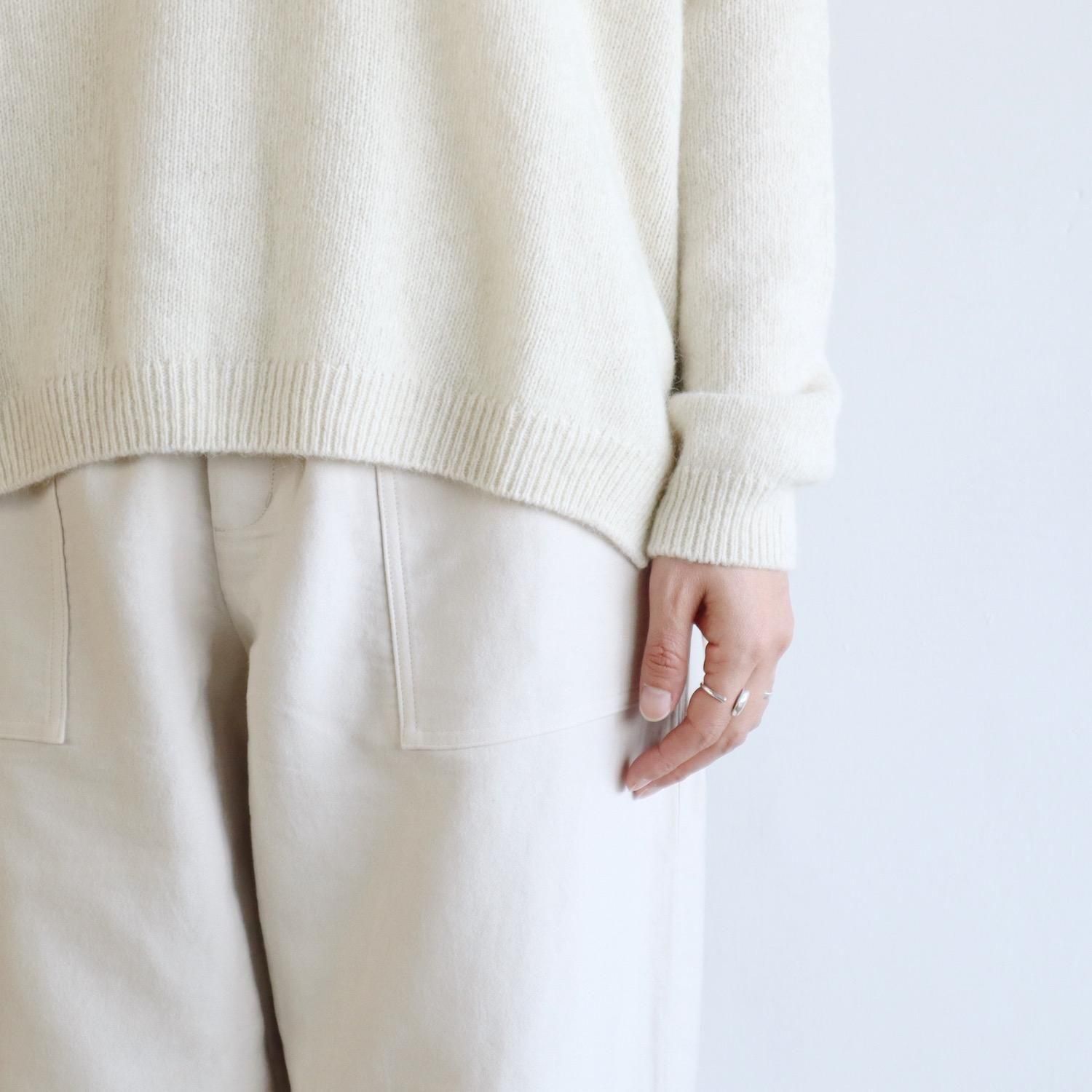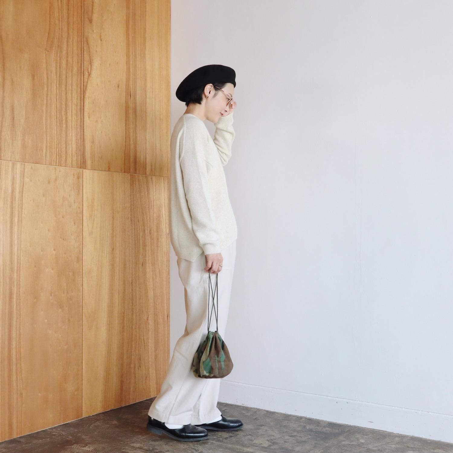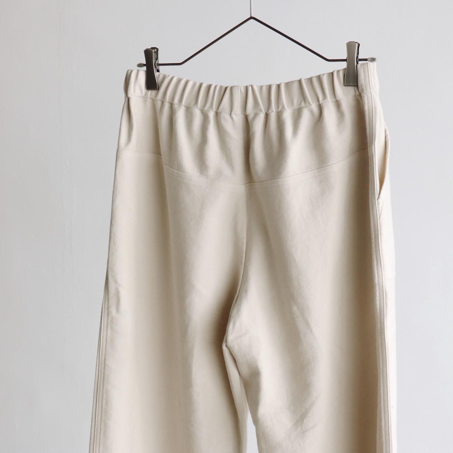 ウエストはゴム+紐のイージー仕様になっており、細かなサイズ調節が可能。綺麗なストレートシルエットで、ポケットのステッチがアクセントになっています。シャツやモコモコニットなど、幅広く合わせやすい癖のないデザインです。