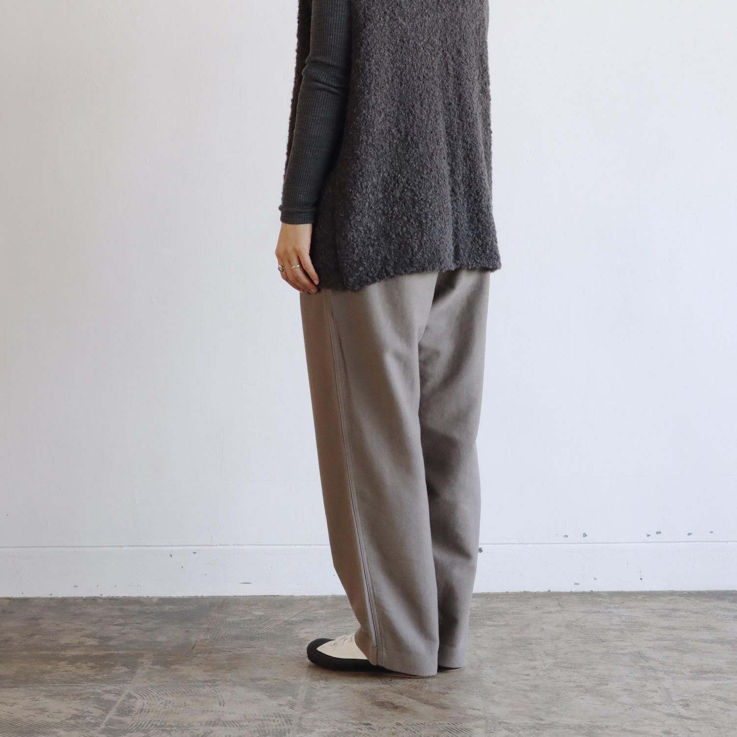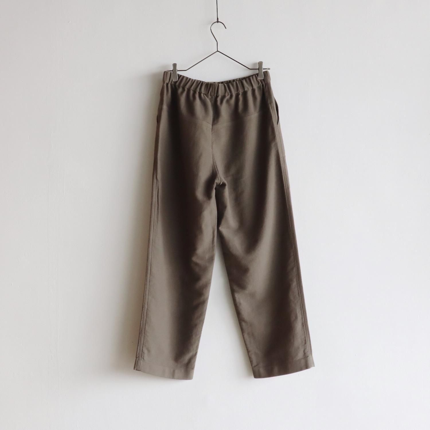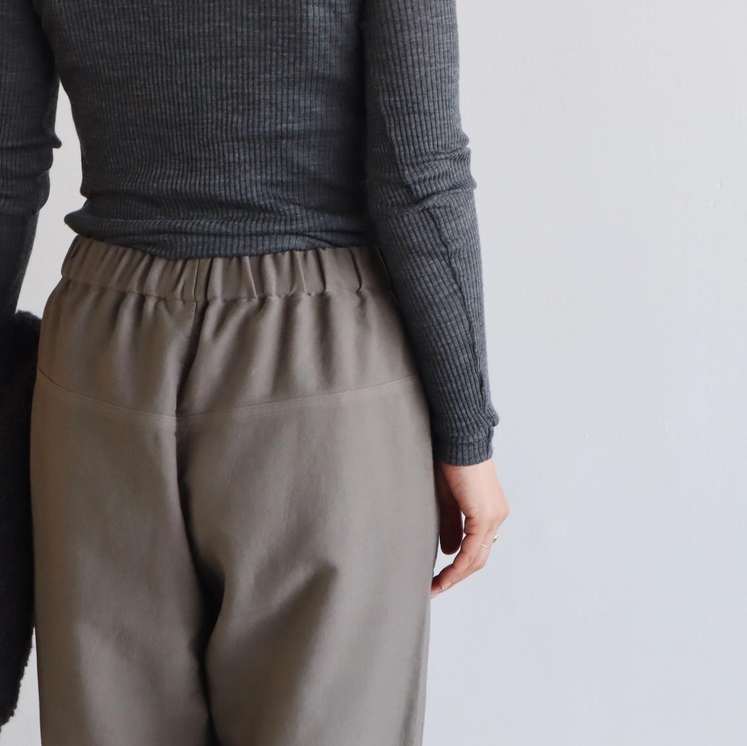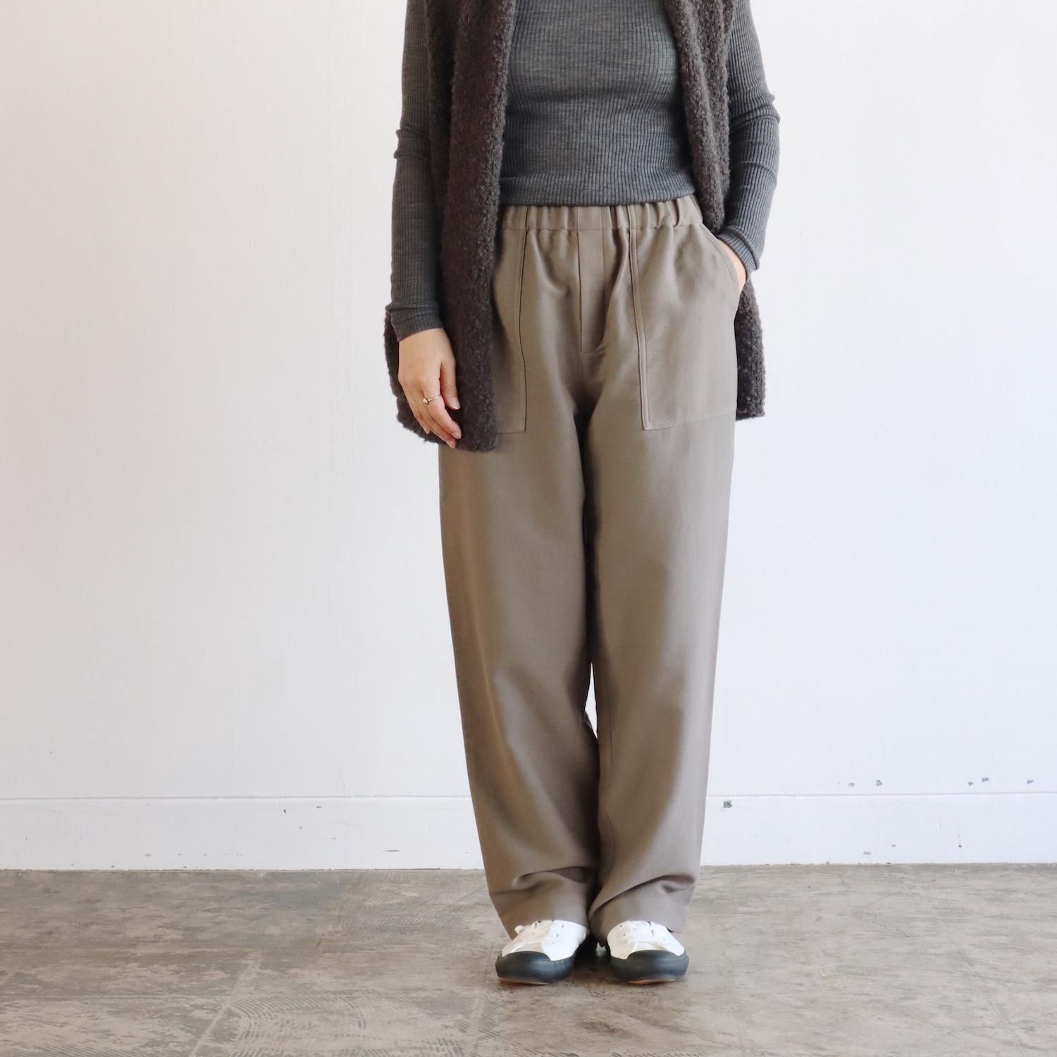 ウエストはゴム+紐のイージー仕様になっており、細かなサイズ調節が可能。綺麗なストレートシルエットで、ポケットのステッチがアクセントになっています。シャツやモコモコニットなど、幅広く合わせやすい癖のないデザインです。