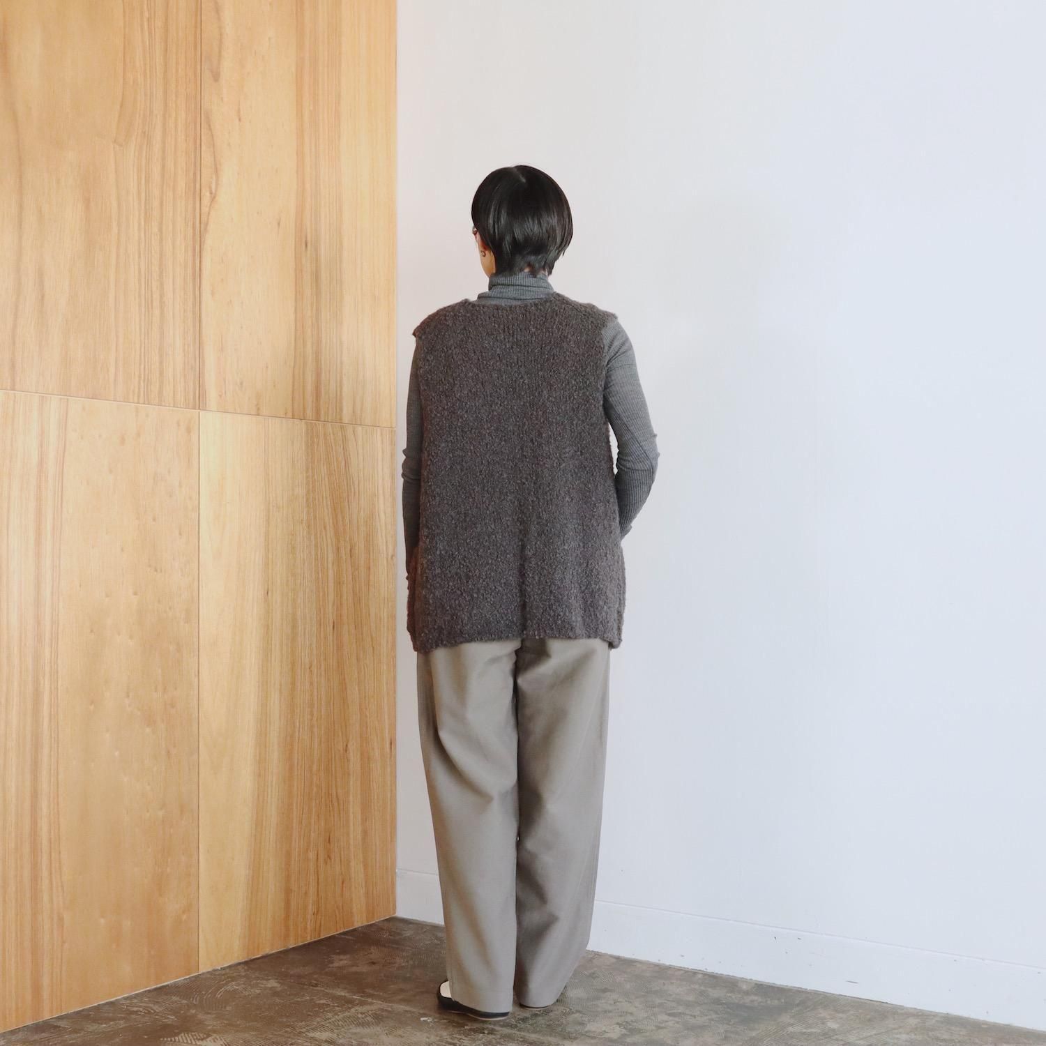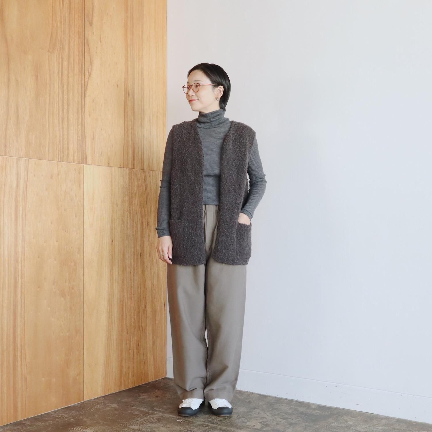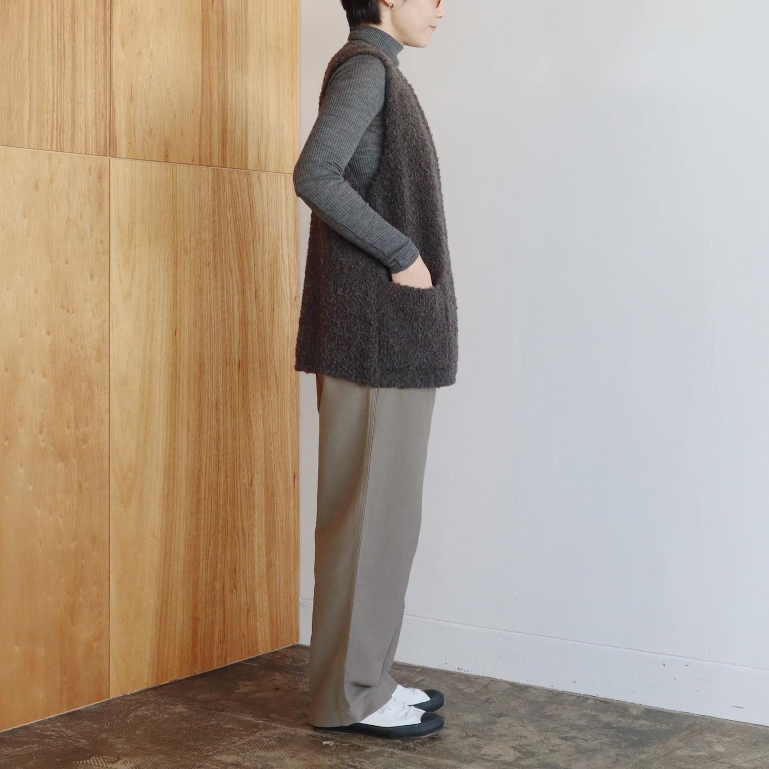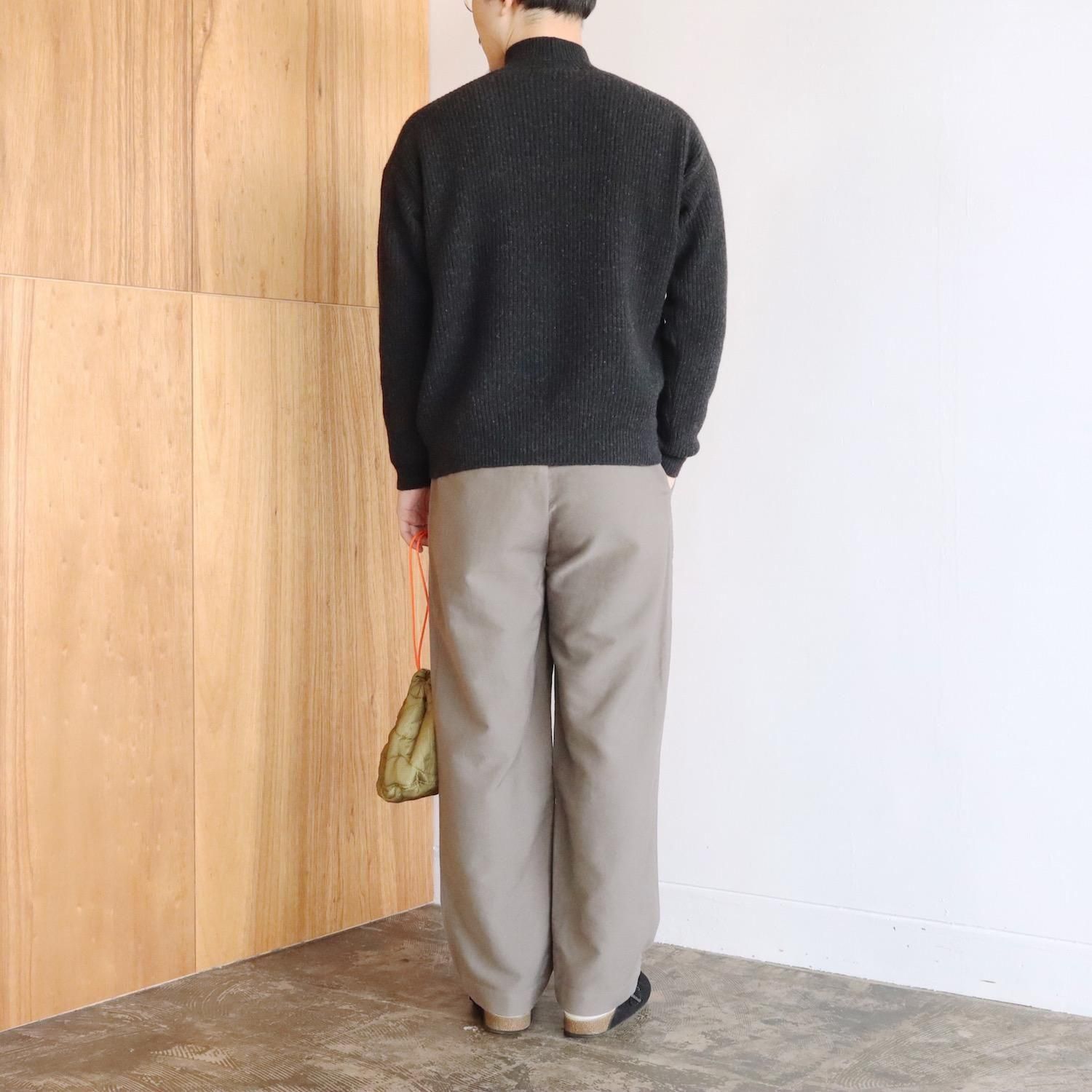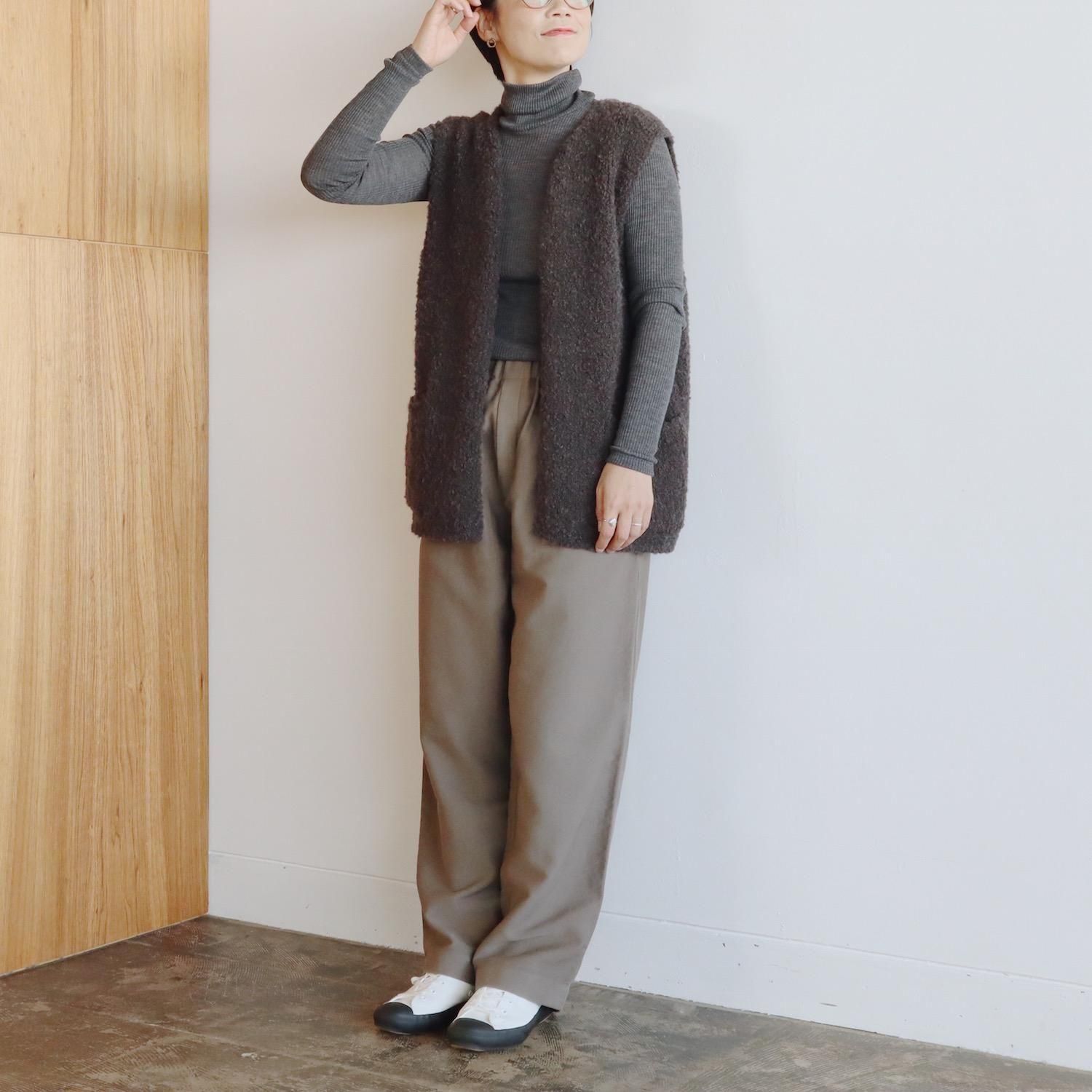 ウエストはゴム+紐のイージー仕様になっており、細かなサイズ調節が可能。綺麗なストレートシルエットで、ポケットのステッチがアクセントになっています。シャツやモコモコニットなど、幅広く合わせやすい癖のないデザインです。