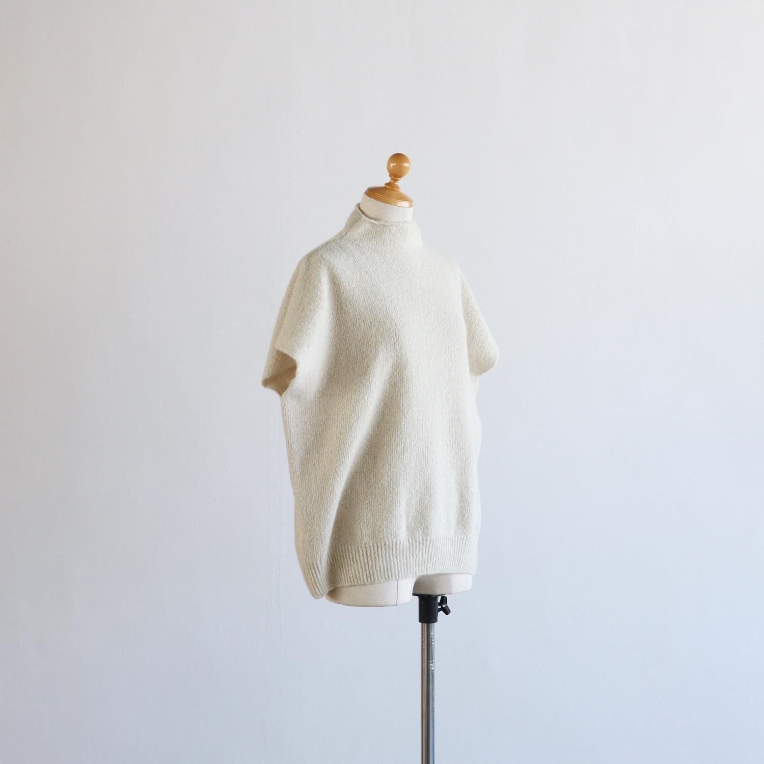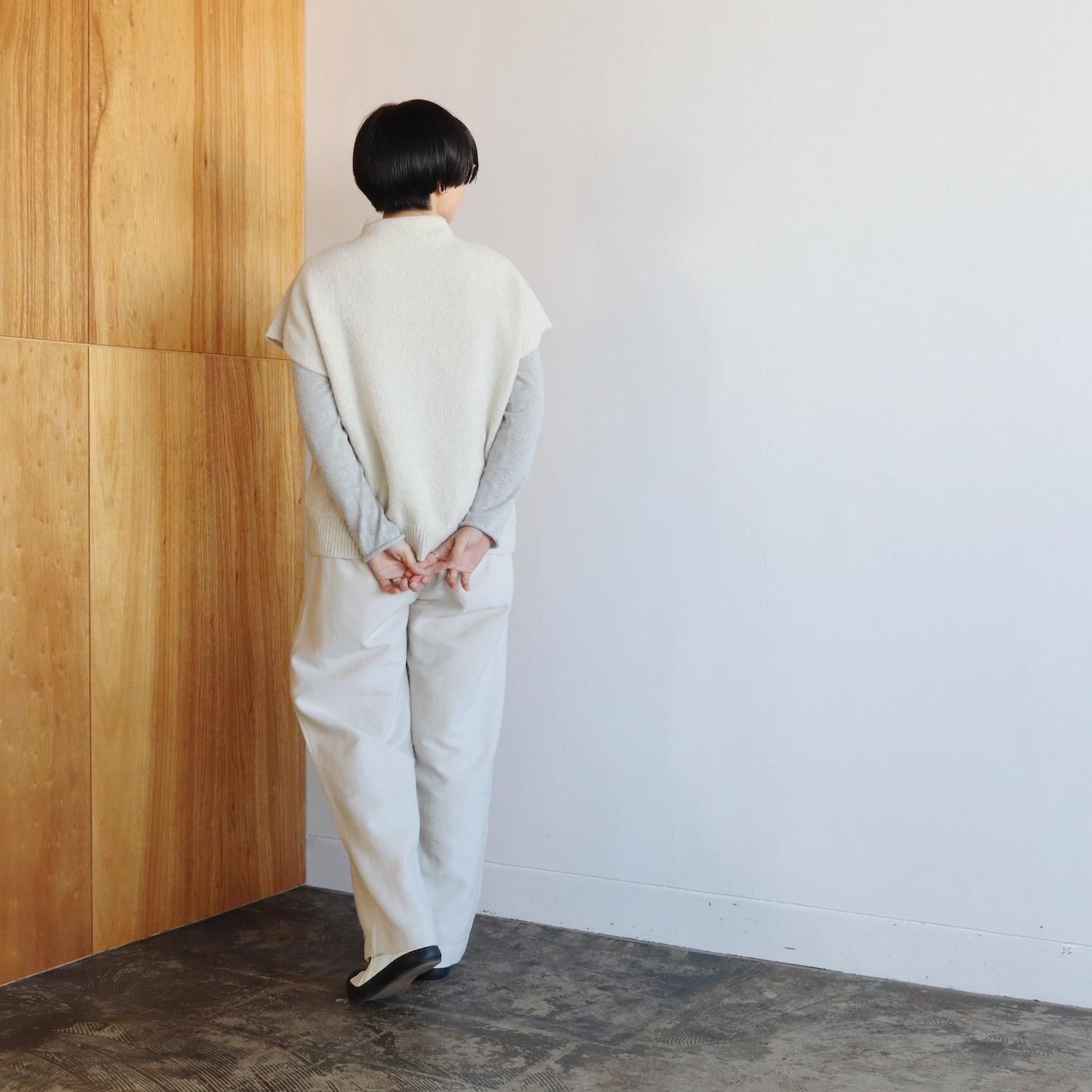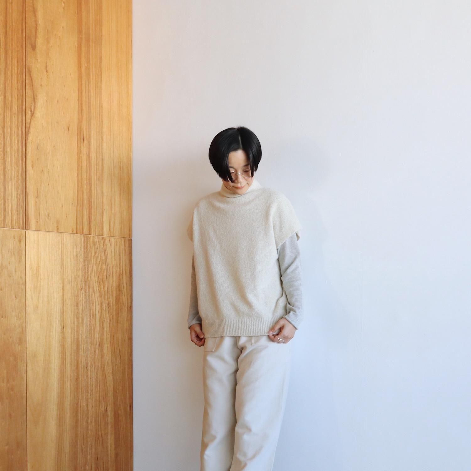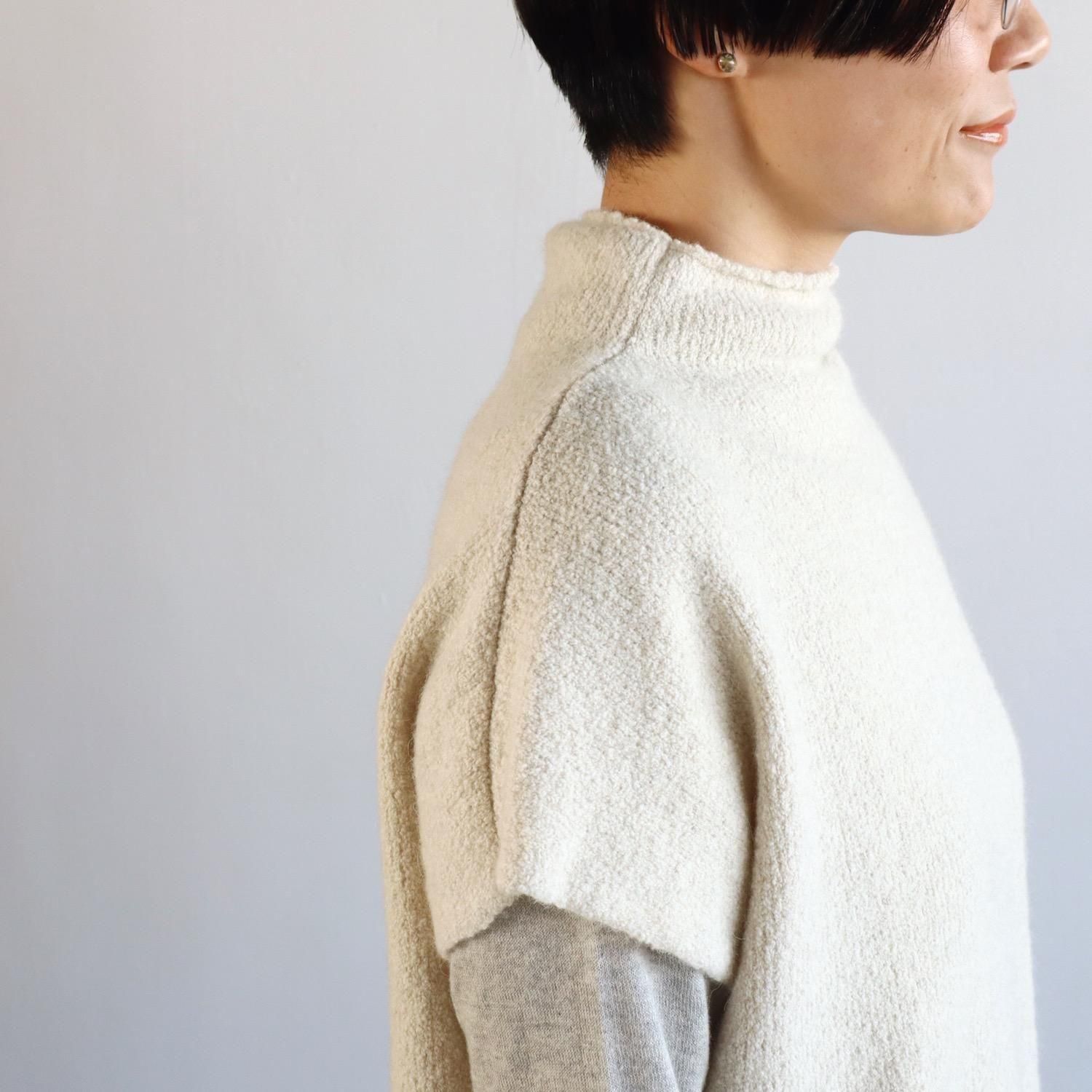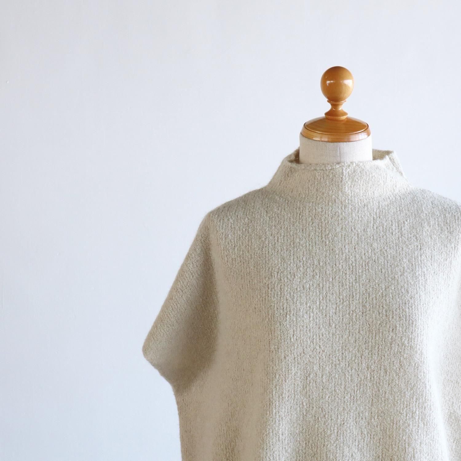 少し立ち上がったネックのニットベストです。ベスト=袖無しですがこちらはちょっとだけ袖があり、肩も温めてくれます。