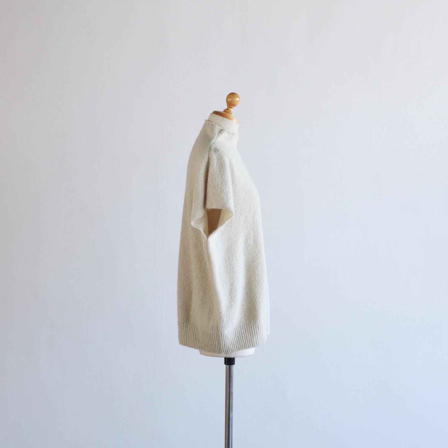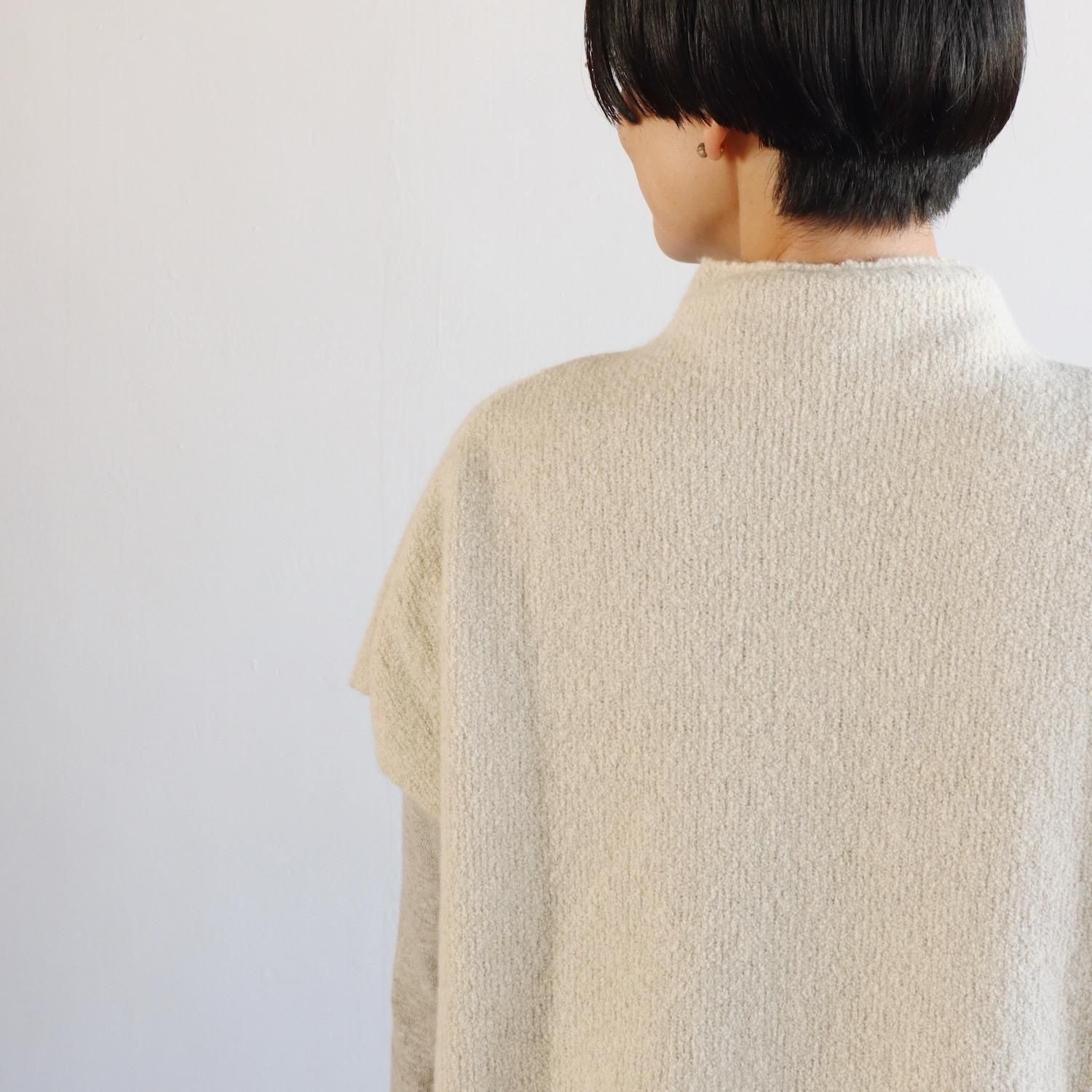 柔らかく軽いブルーフォックスを使い、糸の輪を表側に見せるブークレ加工を施しポコポコした表情のニットを作りました。どちらかというと薄手でとても軽く、上着を羽織っても全くかさばりません。
