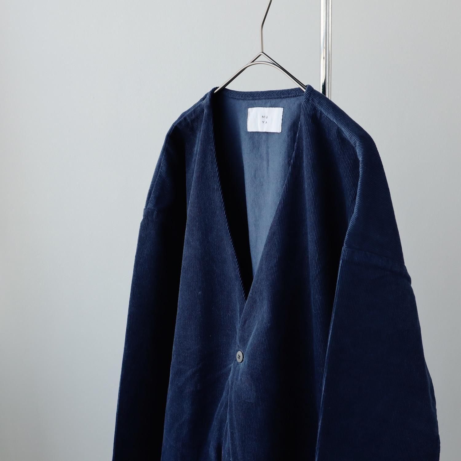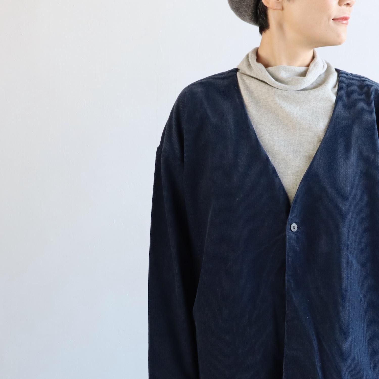 コーデュロイ素材で仕立てられた、シンプルなデザインのカーディガンです。
