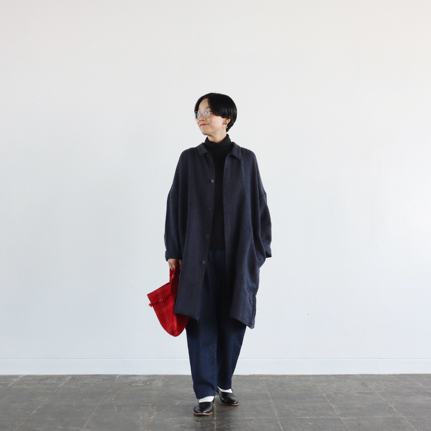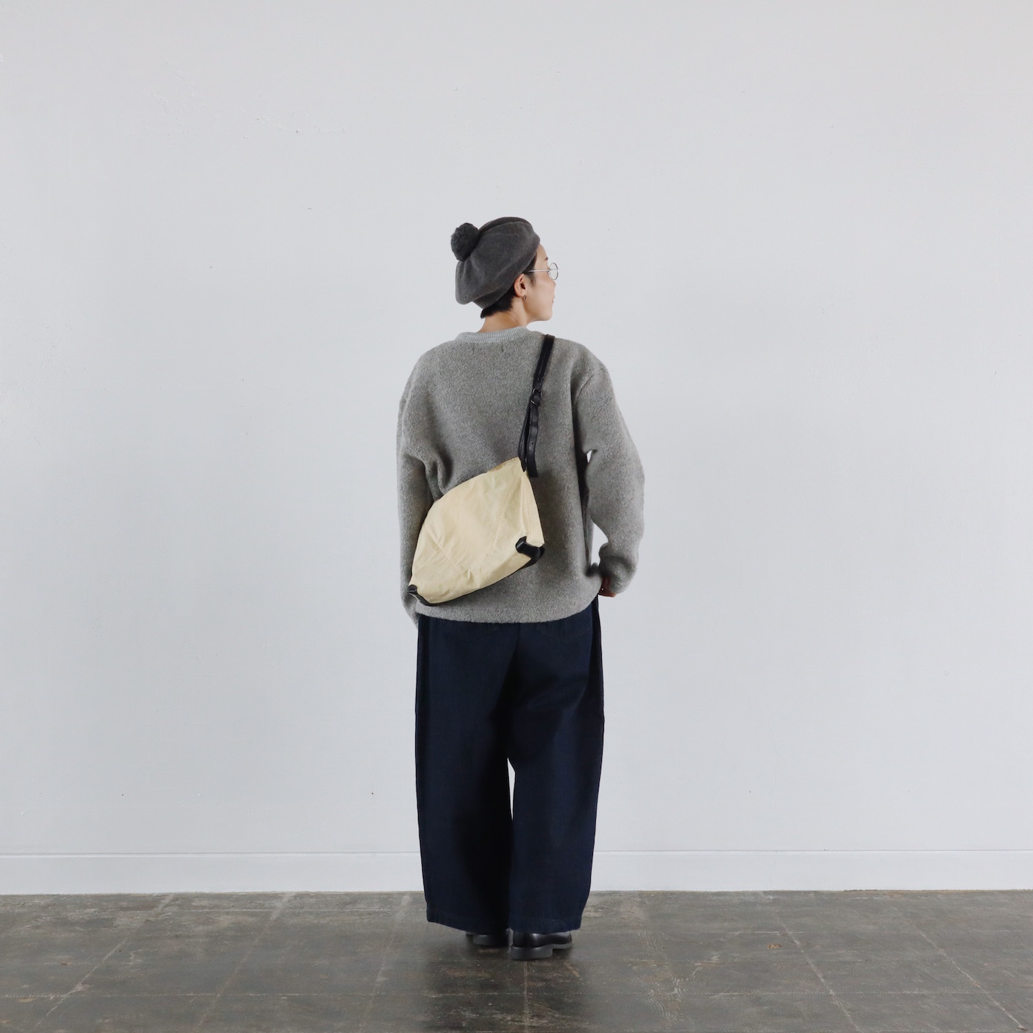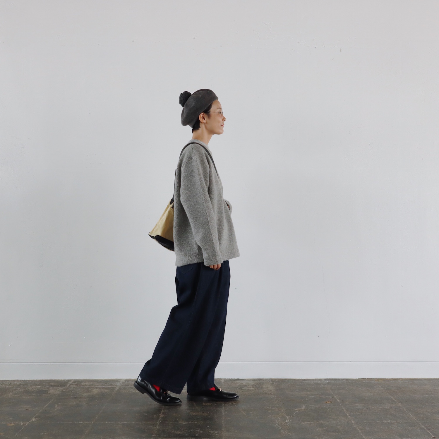 腰まわりがスッキリ見えるよう、タックの位置にこだわりました。ヒップやワタリはゆったりとしたラインで、股上を深めにとり、ハイウエストで履いても、腰で履いても、バランスの良い仕上がりです。ただのワイドではなく、裾巾広めのコクーンシルエットが、独特の印象を与えます。