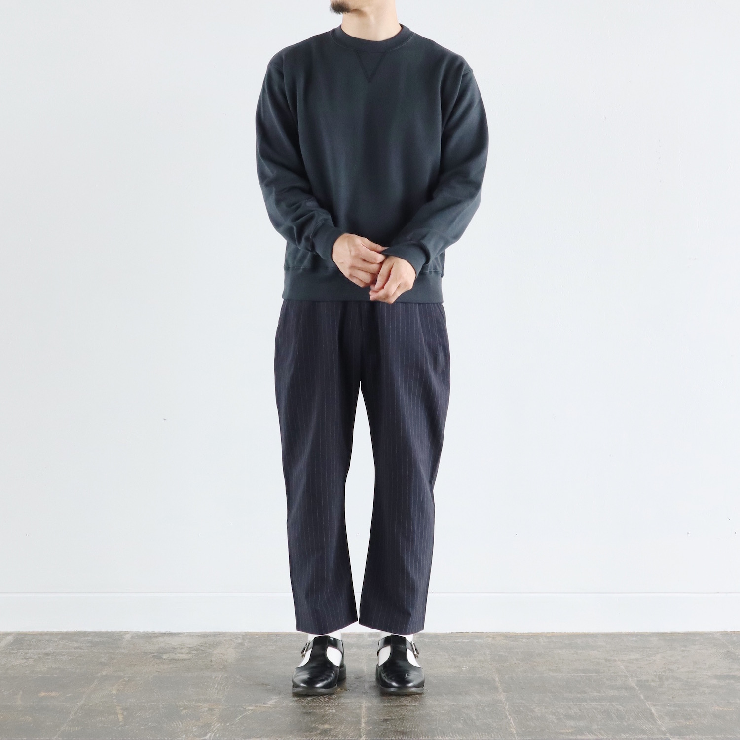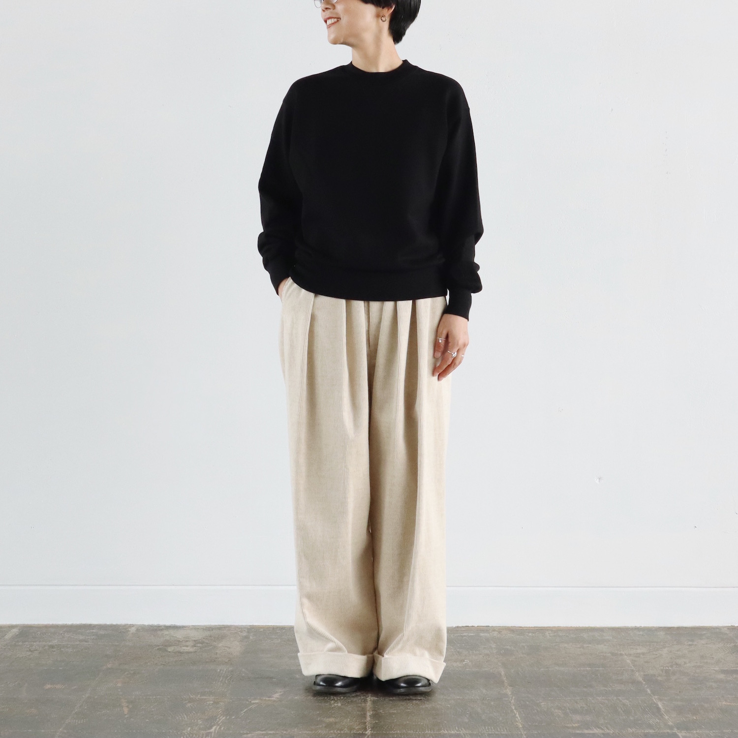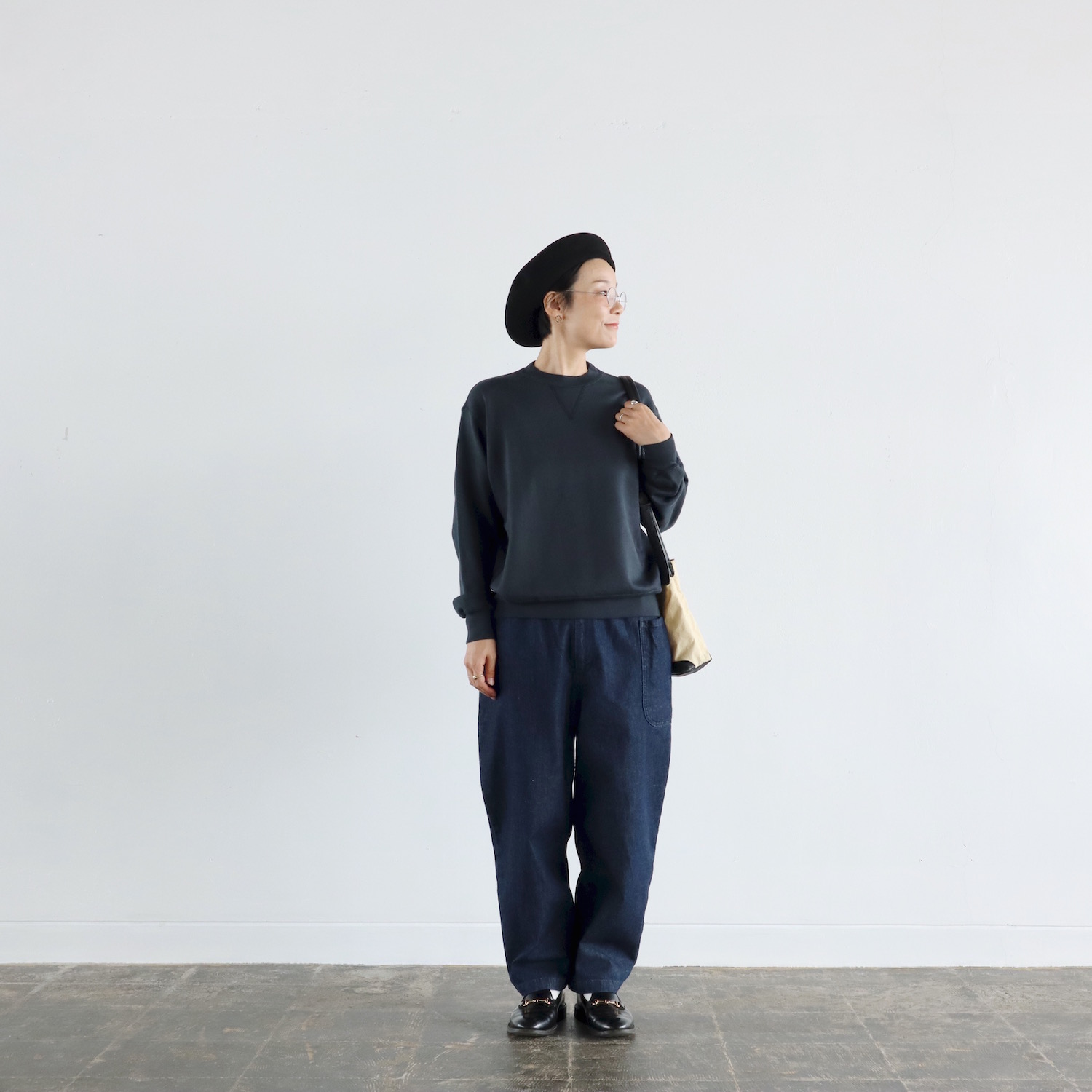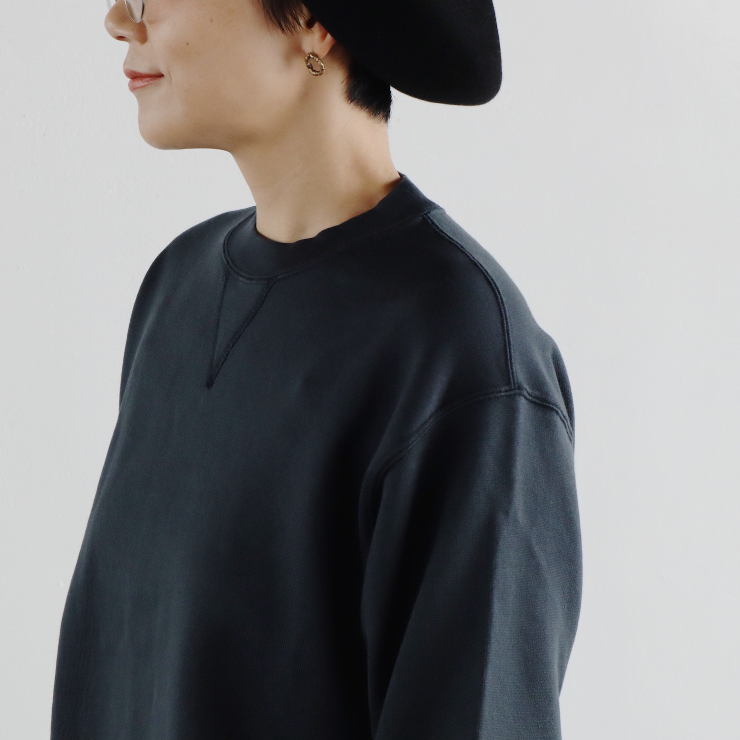 首元のVガゼット、キュッと締まったリブに袖口のたまり感など、デザインはオーセンティックなスウェットを踏襲しつつ、現代的なシルエットにアレンジしました。短めに整えられた着丈のお陰で、ワイドパンツやスカートを合わせてもきれいにまとまります。