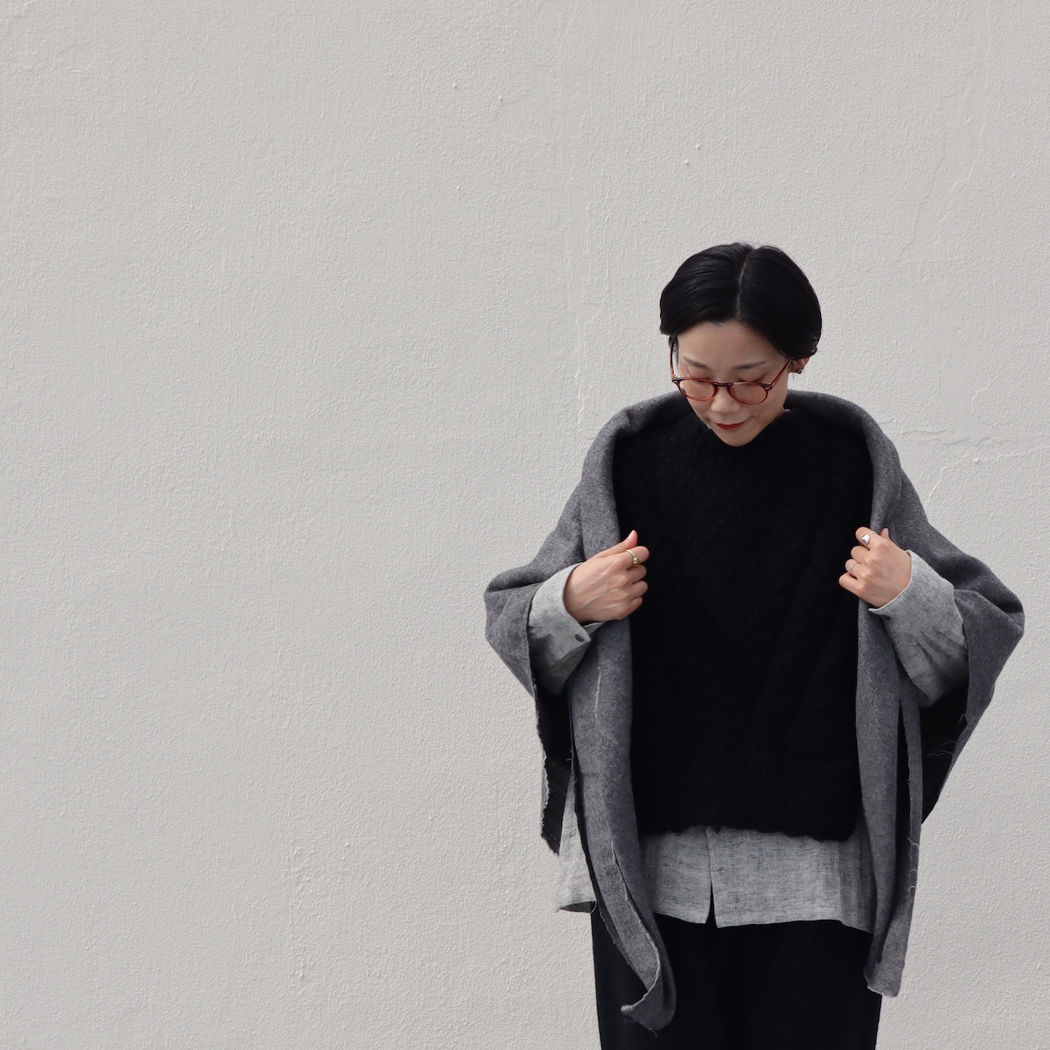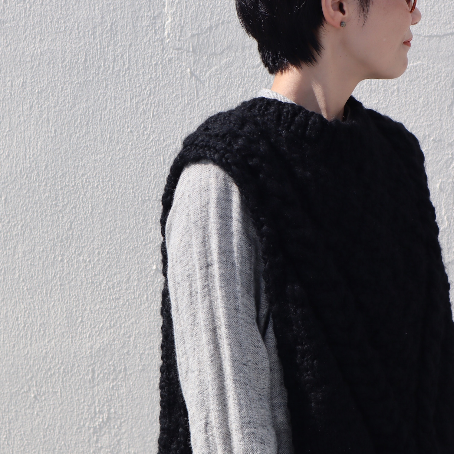首周りは詰まりすぎず広がりすぎず、程よいクルーネックで、サイドが開いているオープンベストです。オーバーサイズのインナーも受け止めてくれる包容力も魅力で、すっぽりと頭から被ったら、ハイOK。ズッシリ感がありそうですが、重さはあまり感じません。可愛いだけでなく、お腹と背中がジワジワあたたかくって、とっても心地良いです。