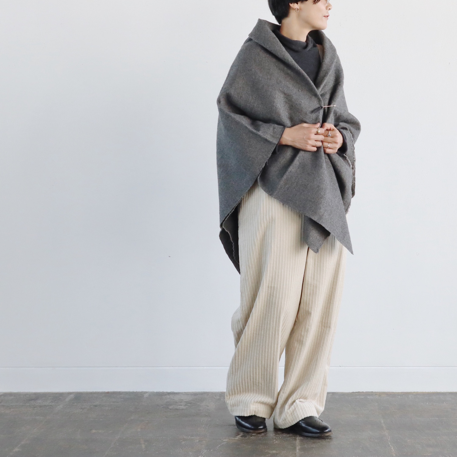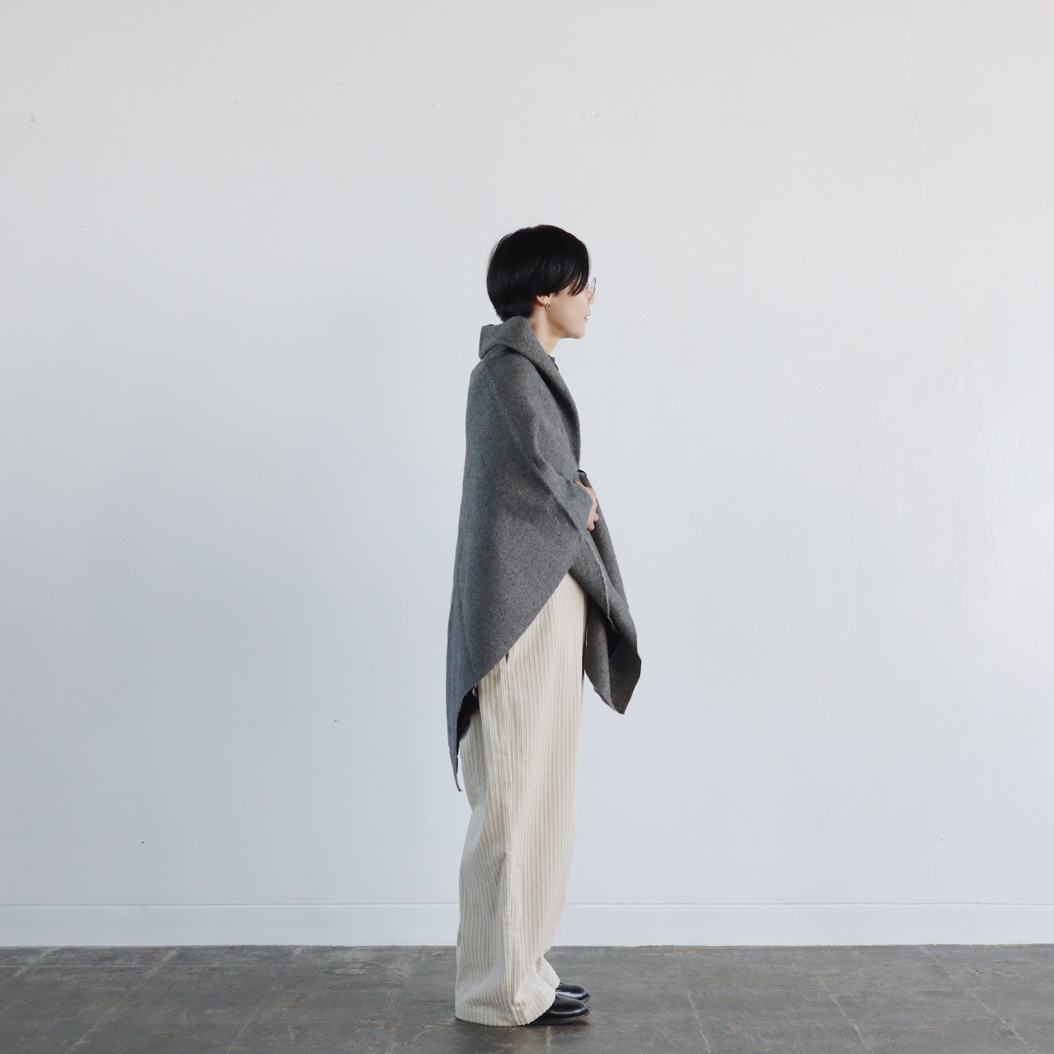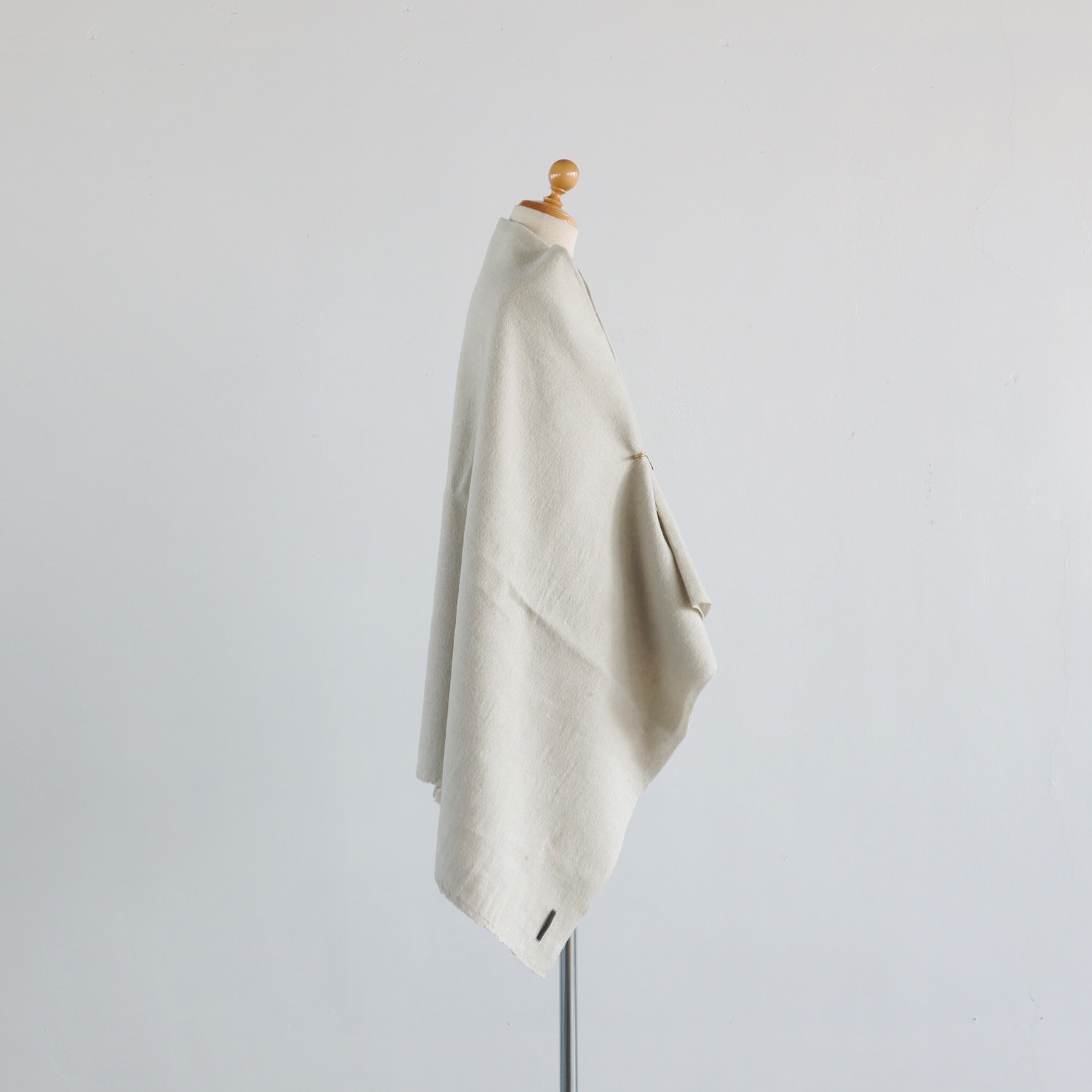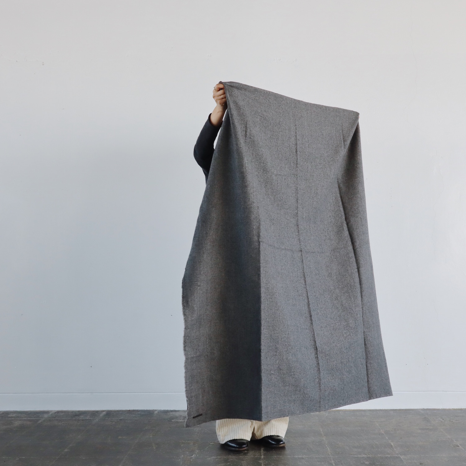 ウールとリネンをブランドし、ウォッシュ加工を施した生地は、仄かなシワがナチュラルな印象で、とてもあたたか。すっぽりと全身を包み込んでくれる、大きな大きな一枚です。