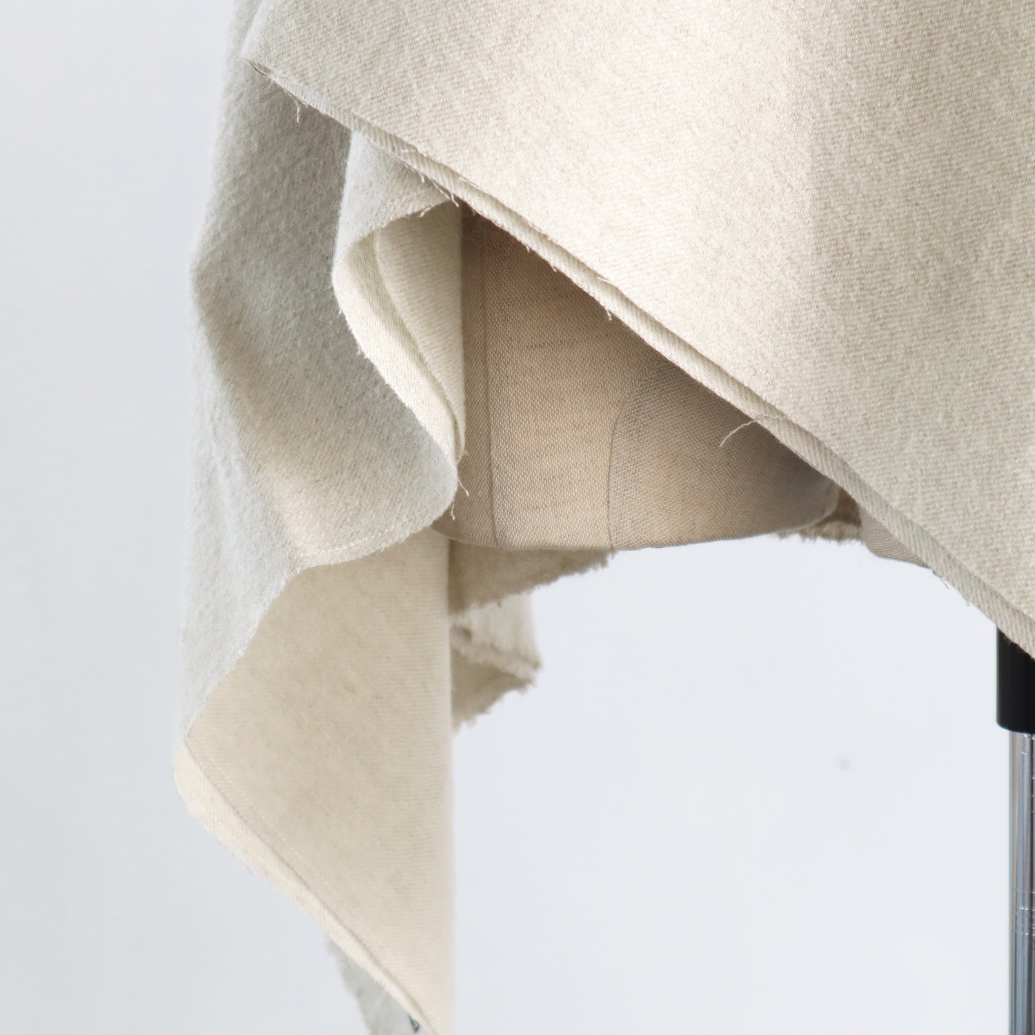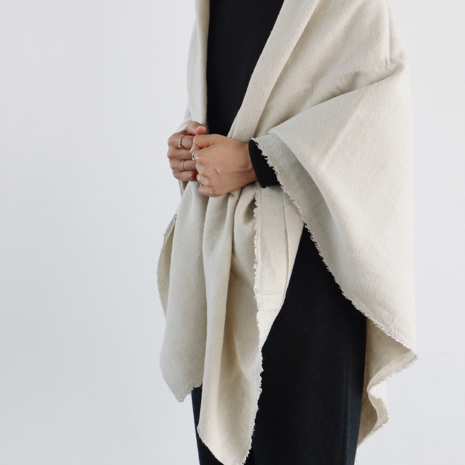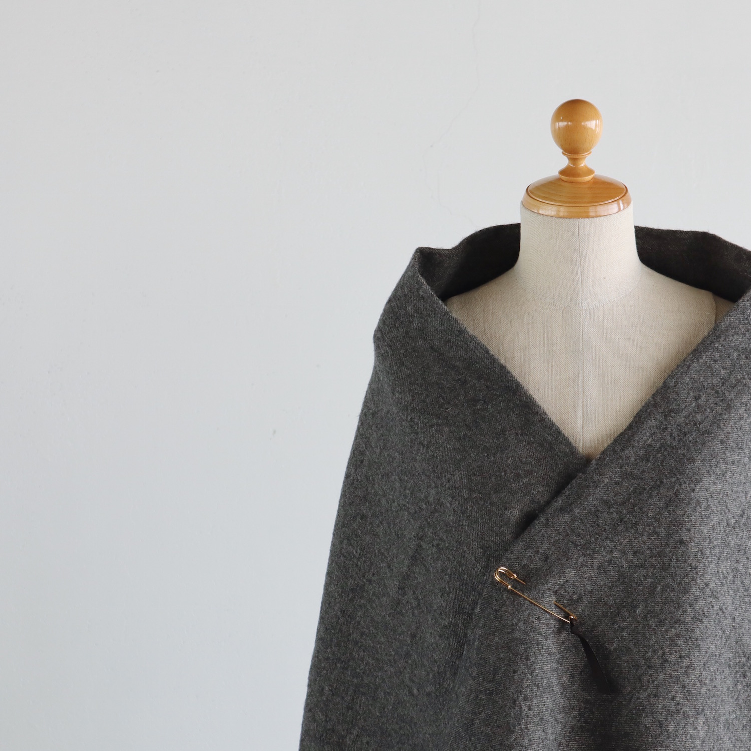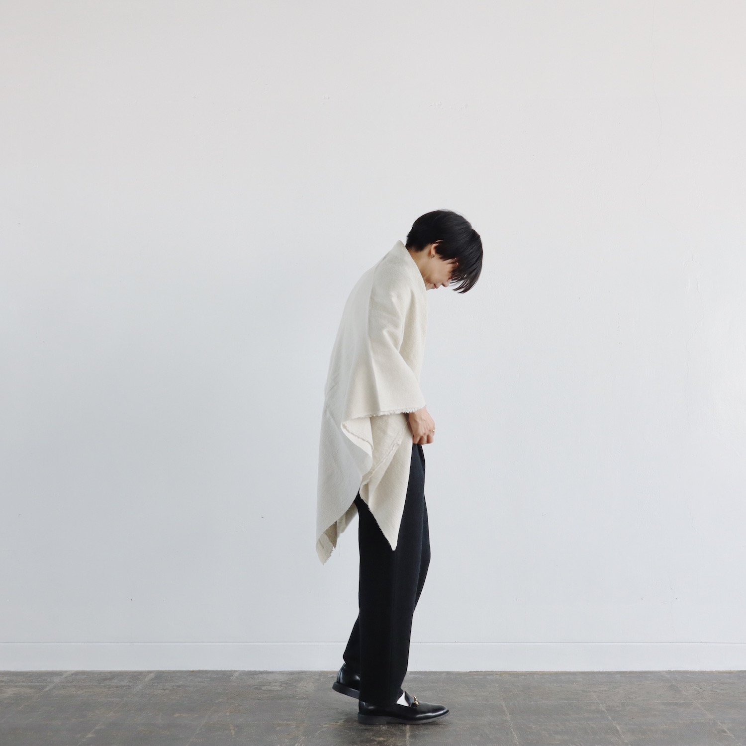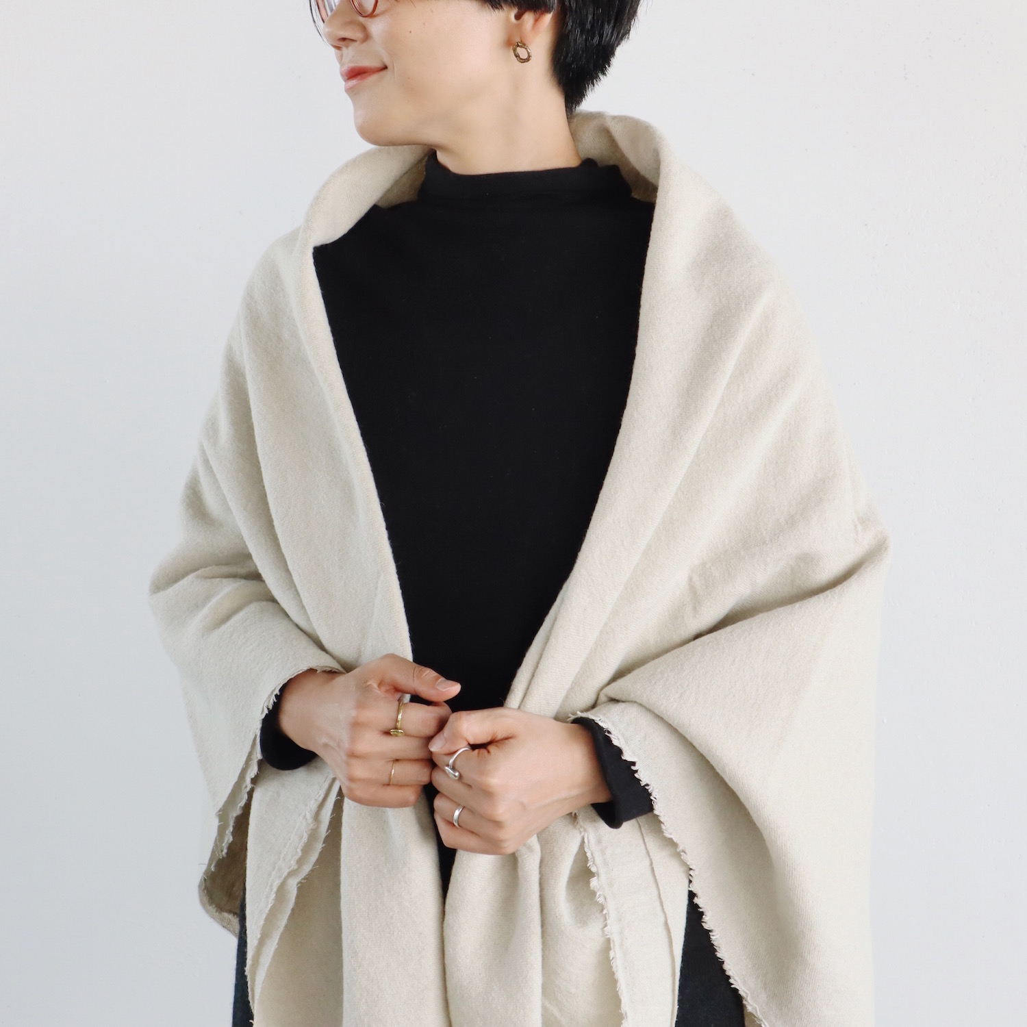 ウールとリネンをブランドし、ウォッシュ加工を施した生地は、仄かなシワがナチュラルな印象で、とてもあたたか。すっぽりと全身を包み込んでくれる、大きな大きな一枚です。