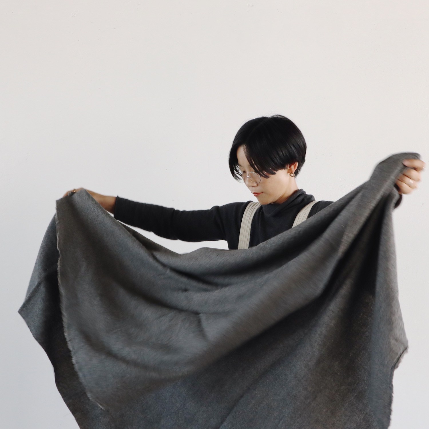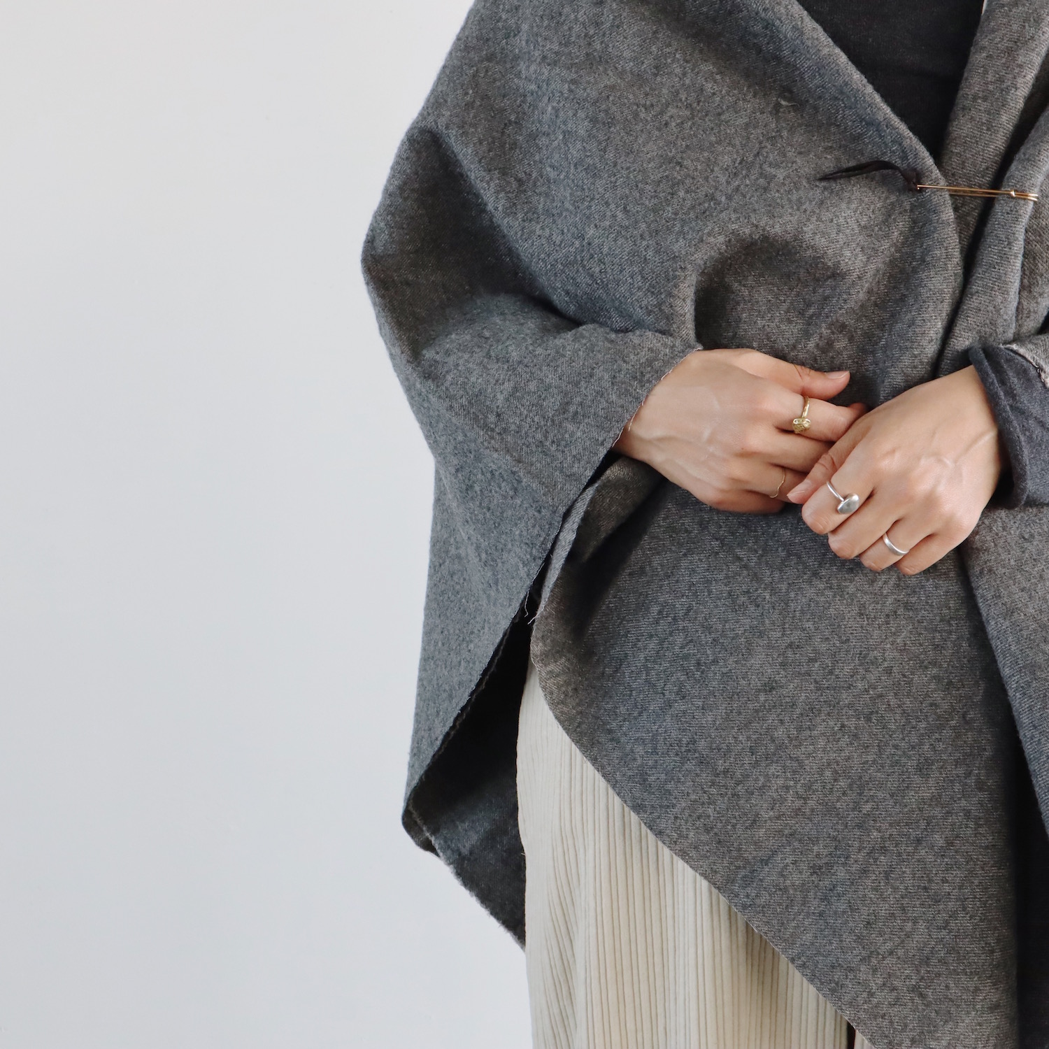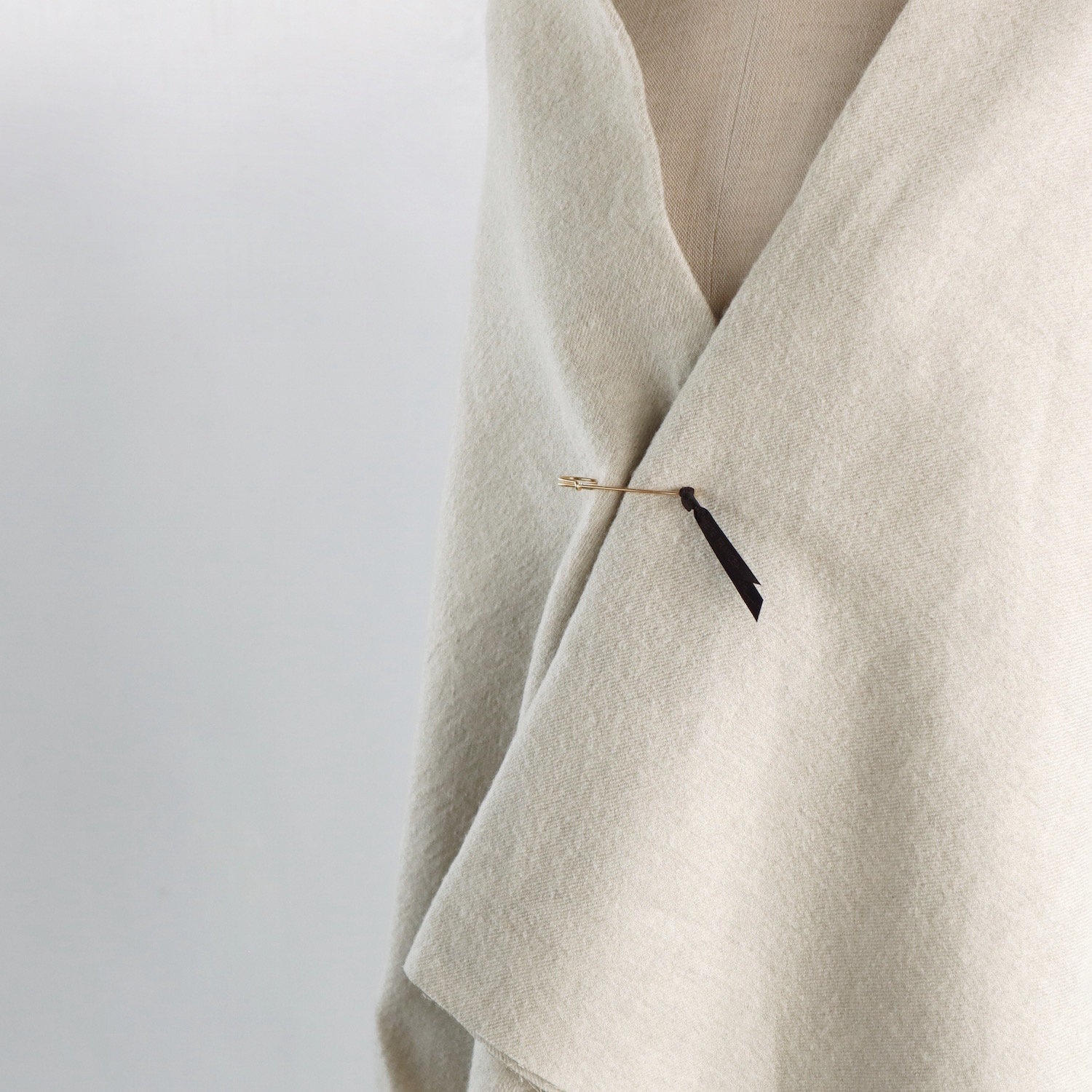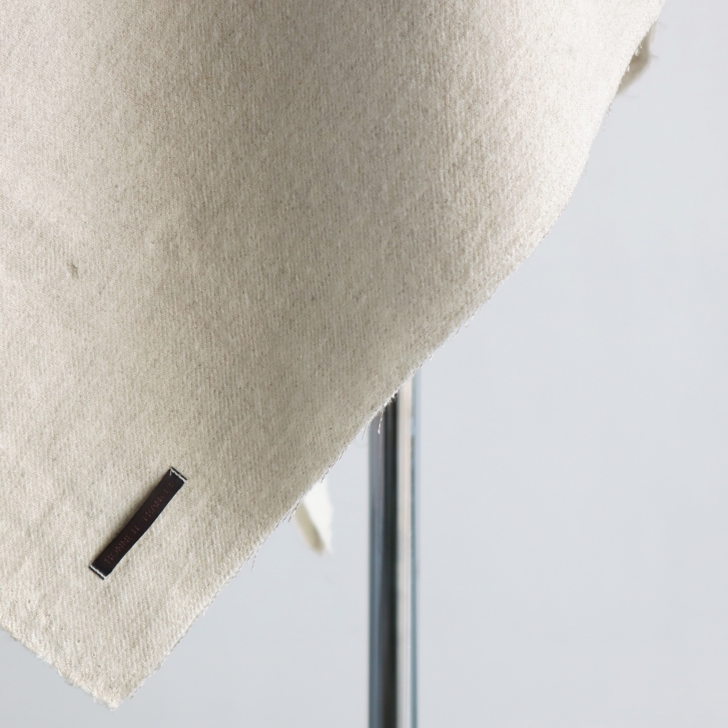 ウールとリネンをブランドし、ウォッシュ加工を施した生地は、仄かなシワがナチュラルな印象で、とてもあたたか。すっぽりと全身を包み込んでくれる、大きな大きな一枚です。