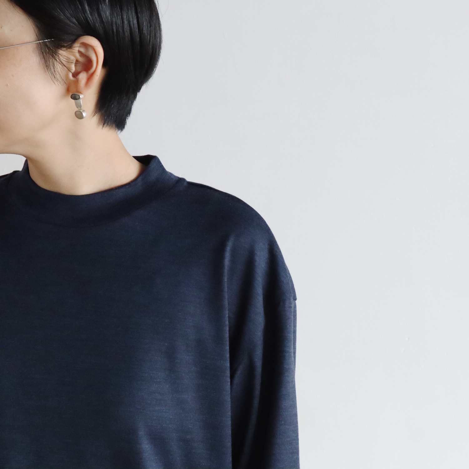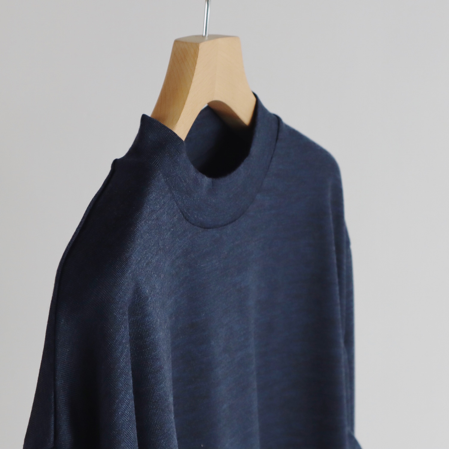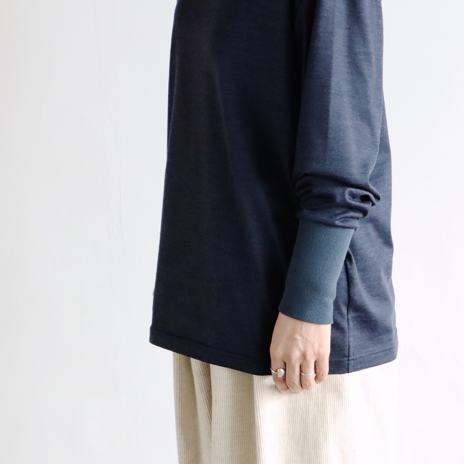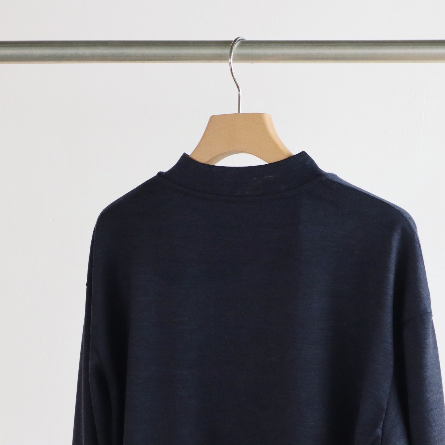太めの幅のネック。袖は長めのコットンリブ。細かなデザインを散りばめ、そこらのプルオーバーとはちょっと違う雰囲気に仕上がっています。一枚で着てもサマになるのが良いところです。