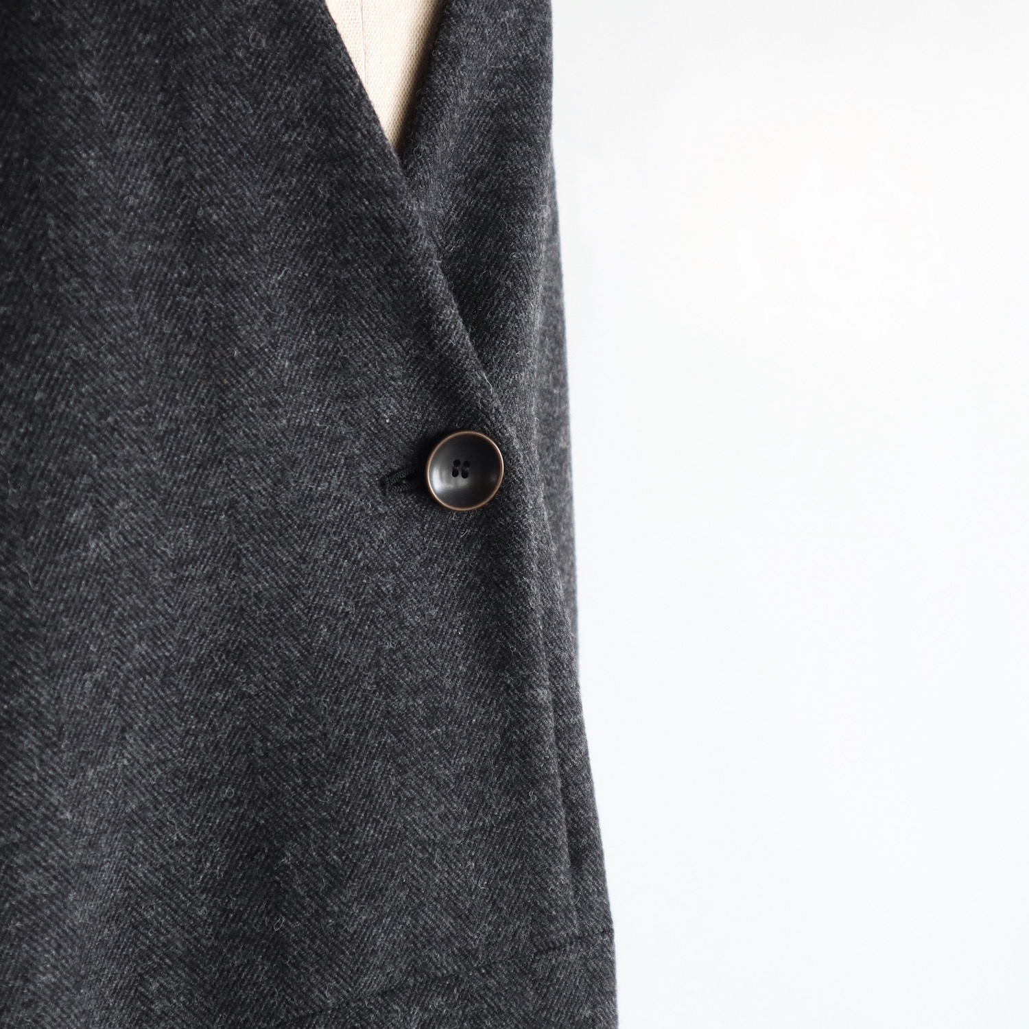 生地は尾州産の再生羊毛を使用しています。やや厚地で細かなヘリンボーン柄が大人な雰囲気を醸し出しています。