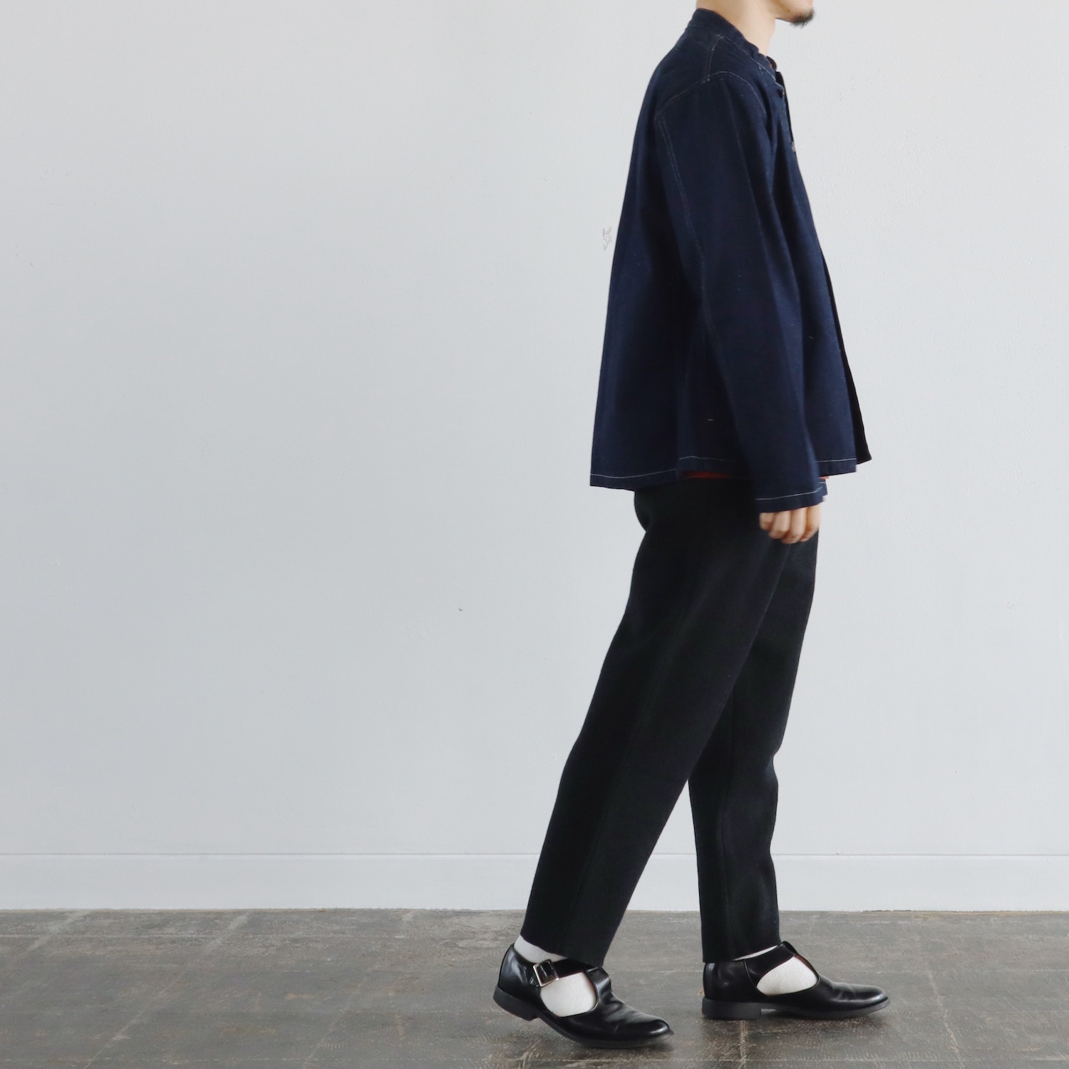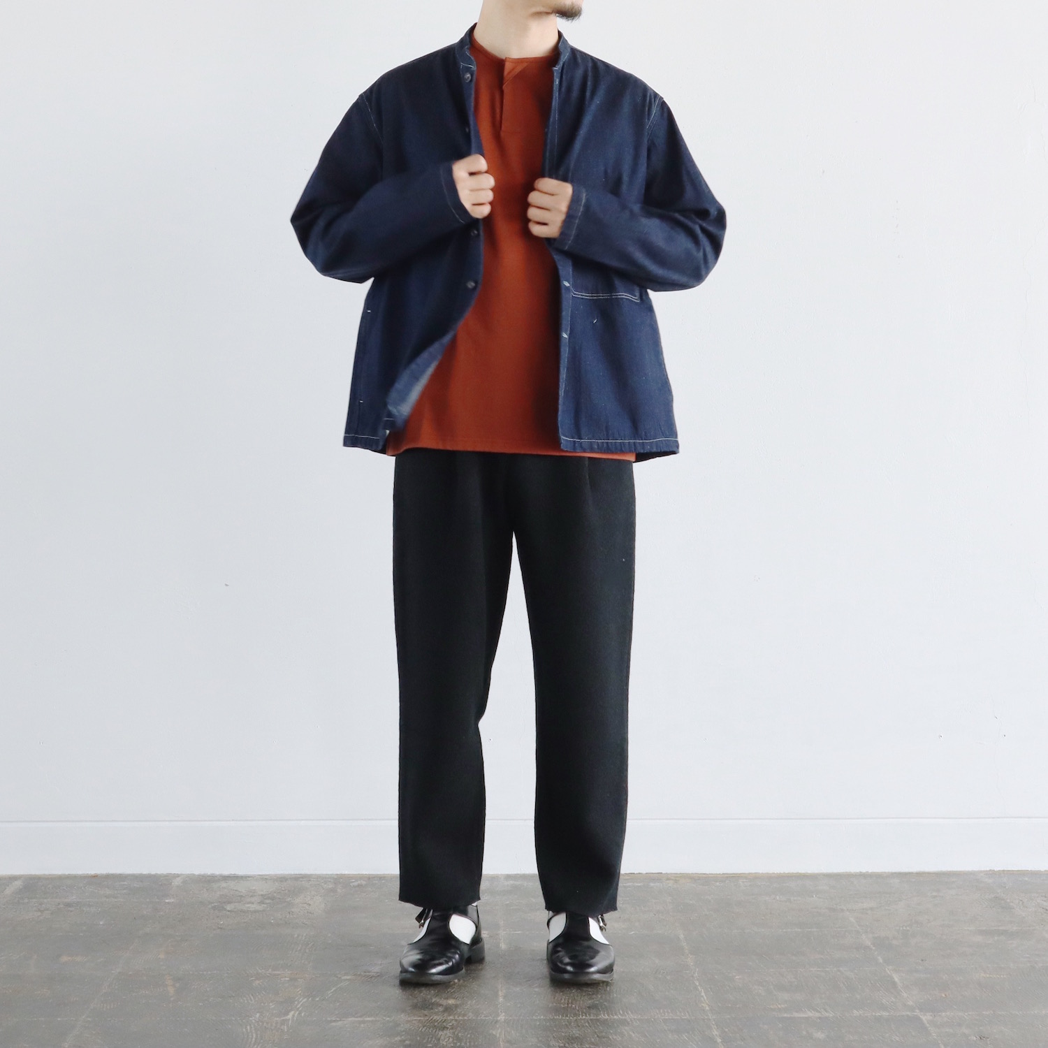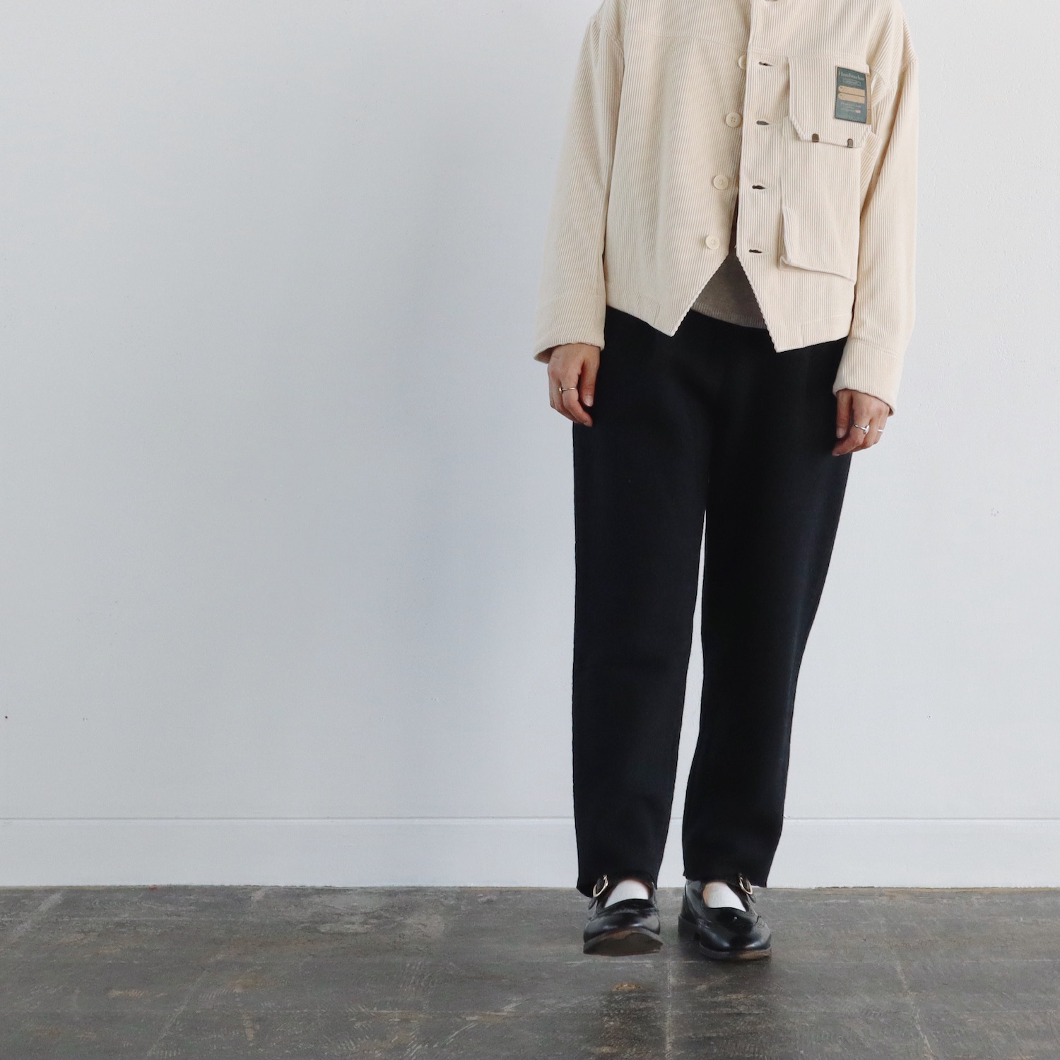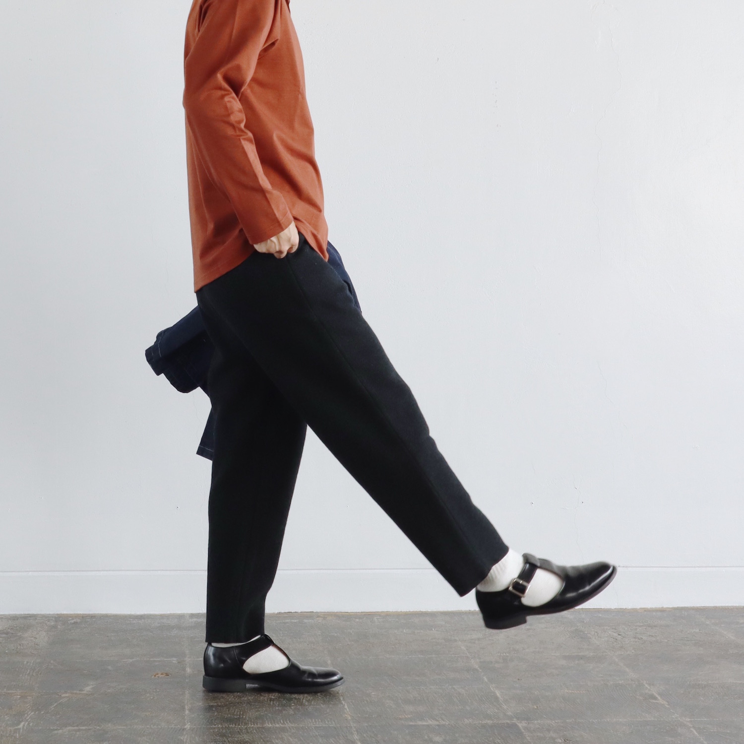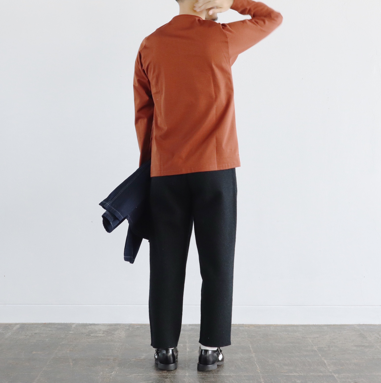 ウールパンツというのは、どうしても牧歌的でユルっとした雰囲気になりがちです。コチラはウエストにタックが入り、裾は切りっぱなしに見えるようなデザインで、キリッと綺麗な仕上がりです。そこにウールの優しい見た目も入ってくるので、美しさと優しさを兼ね備えた、最強のウールパンツだと思います。