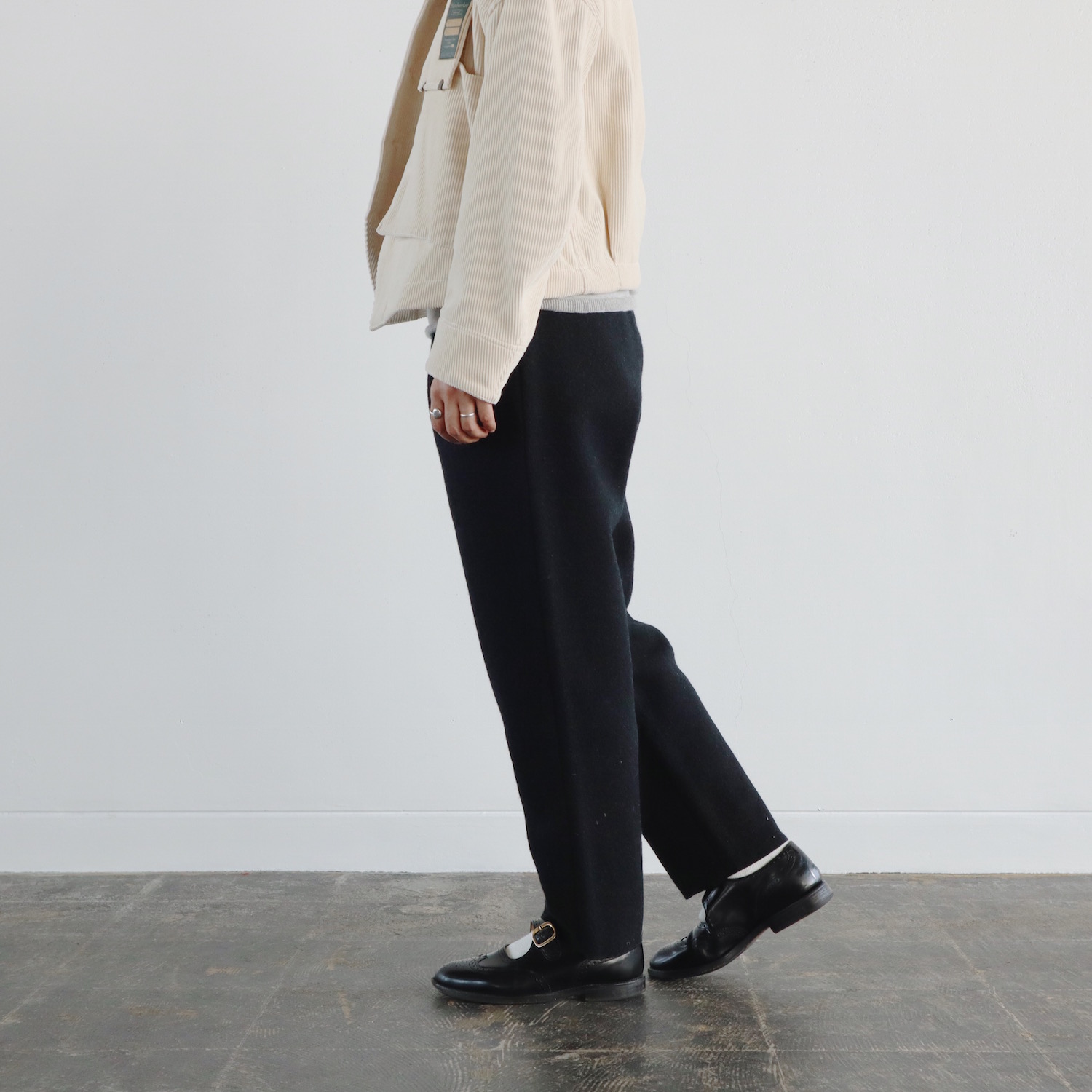 寒さから足全体を守ってくれるパンツ。柔らかなウールで編んだニット地を圧縮する事で生まれる、evam eva(エヴァムエヴァ)定番のプレスウール素材で作られています。