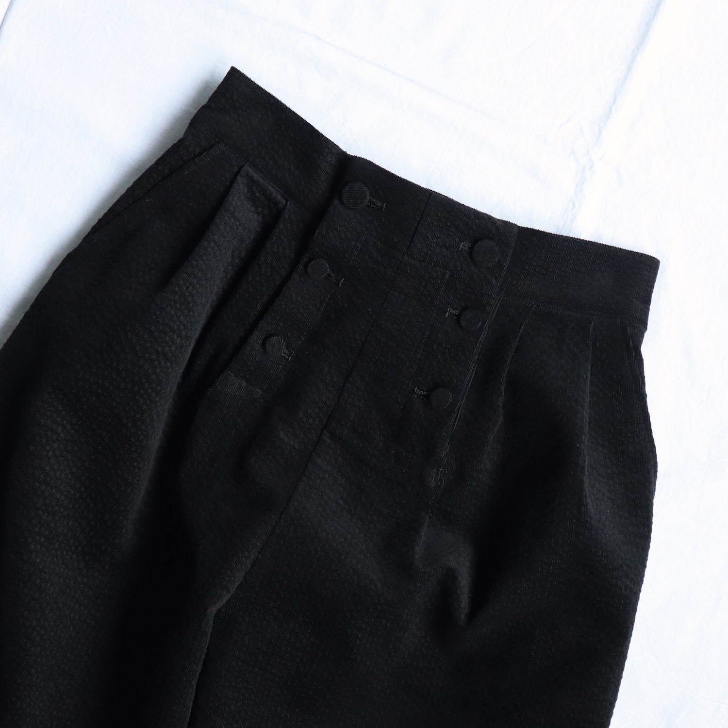 フロントはボタン留めになっています。マリンパンツのようにカジュアルな仕様ですが、くるみボタンを採用しワントーンにまとめ上げる事で、程よくエレガントな印象にシフトチェンジしています。