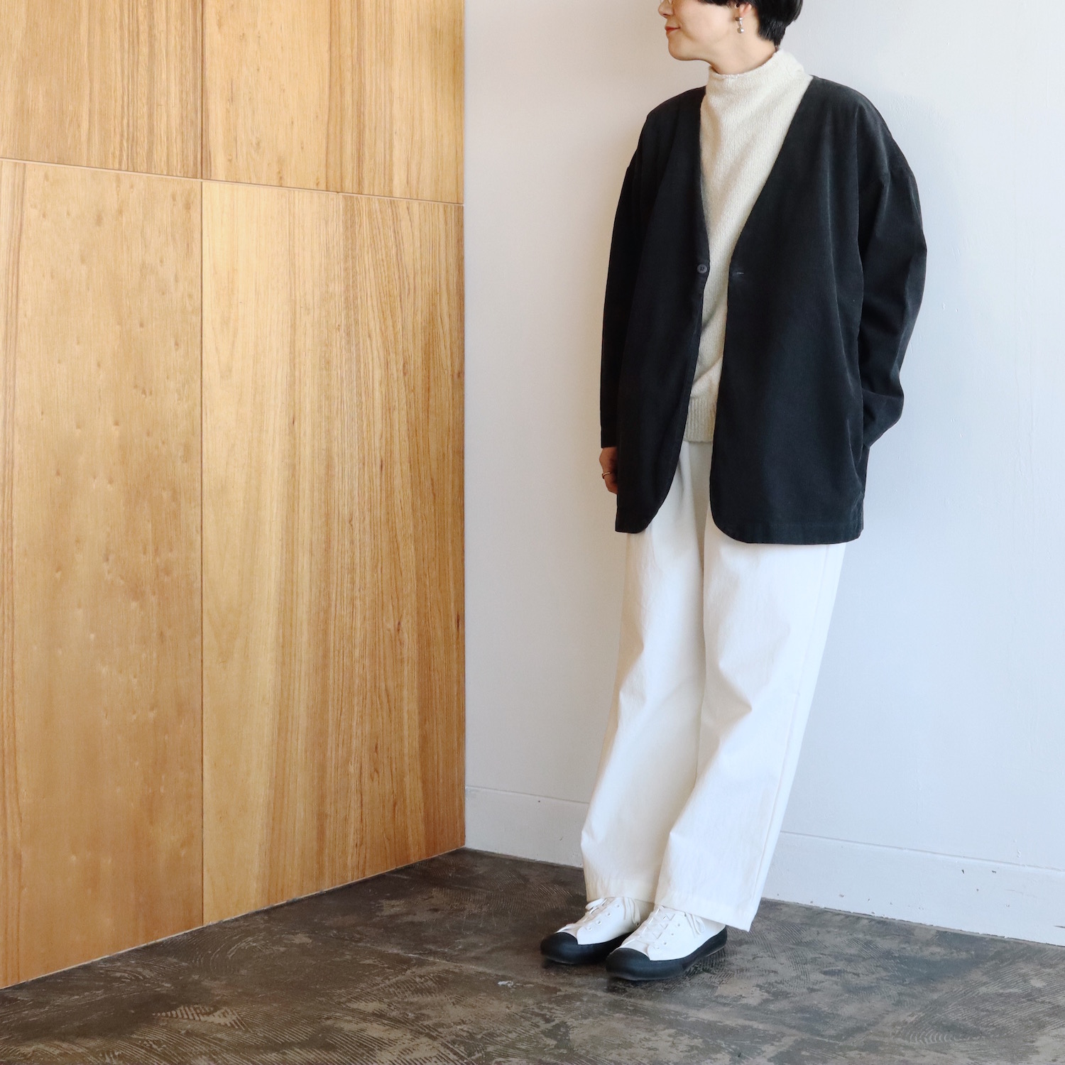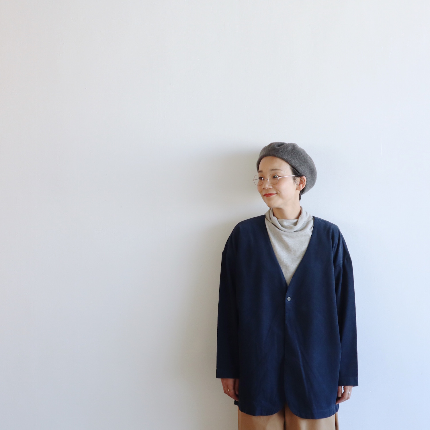 端正なノーカラーのデザインは、レギュラカラーのシャツやタートルネックのニットなど、どんなアイテムも受け入れてくれる、懐の深さが自慢です。