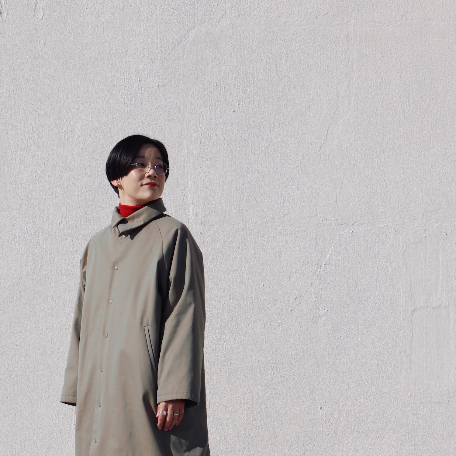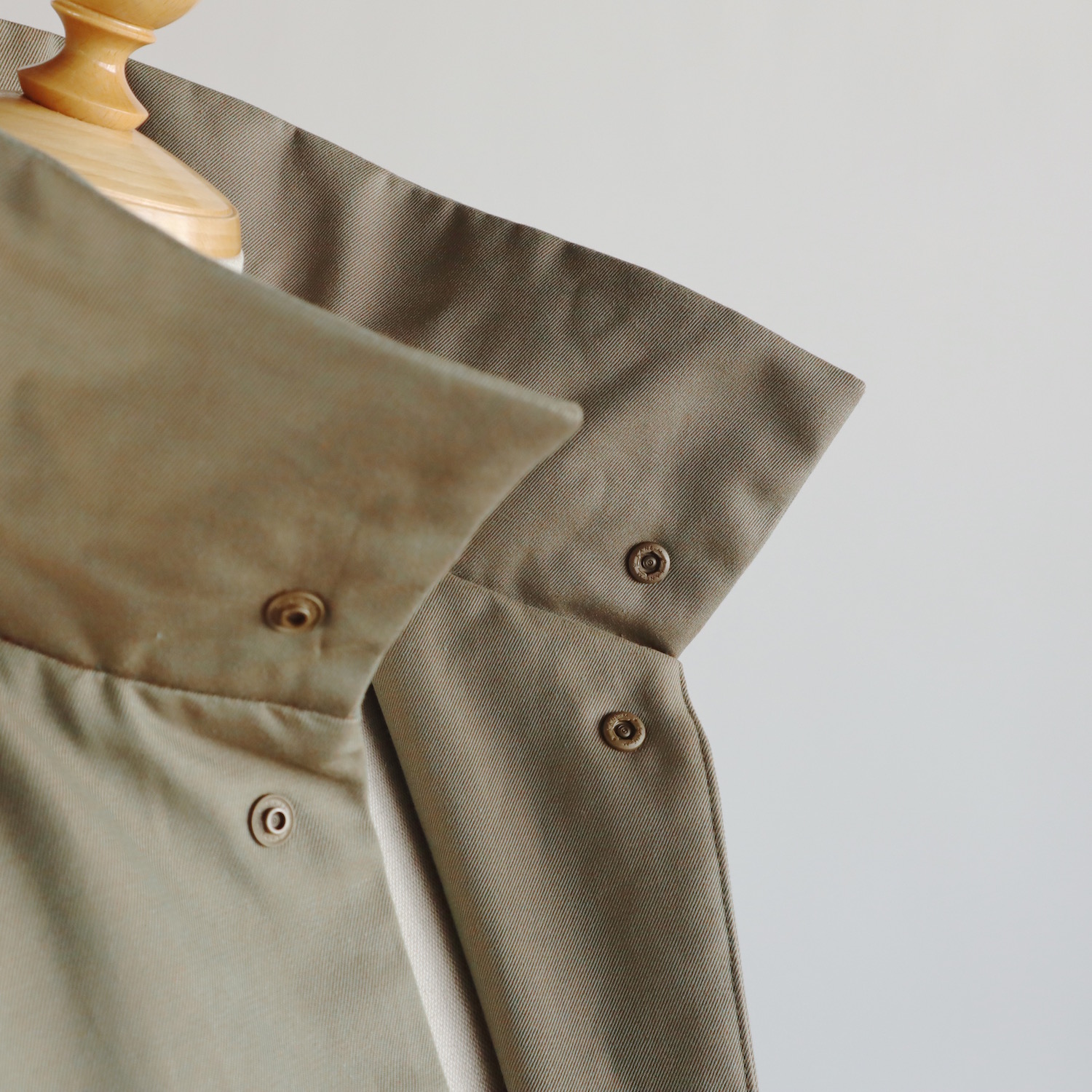 襟のボタンを全部留めると、首をすっぽりと覆う高めのスタンドカラーに。そのまま一回折り返して、低めのスタンドカラーとしても可愛いです。また、ボタンを留めずにオープンカラーのようにしても、しっくりときます。