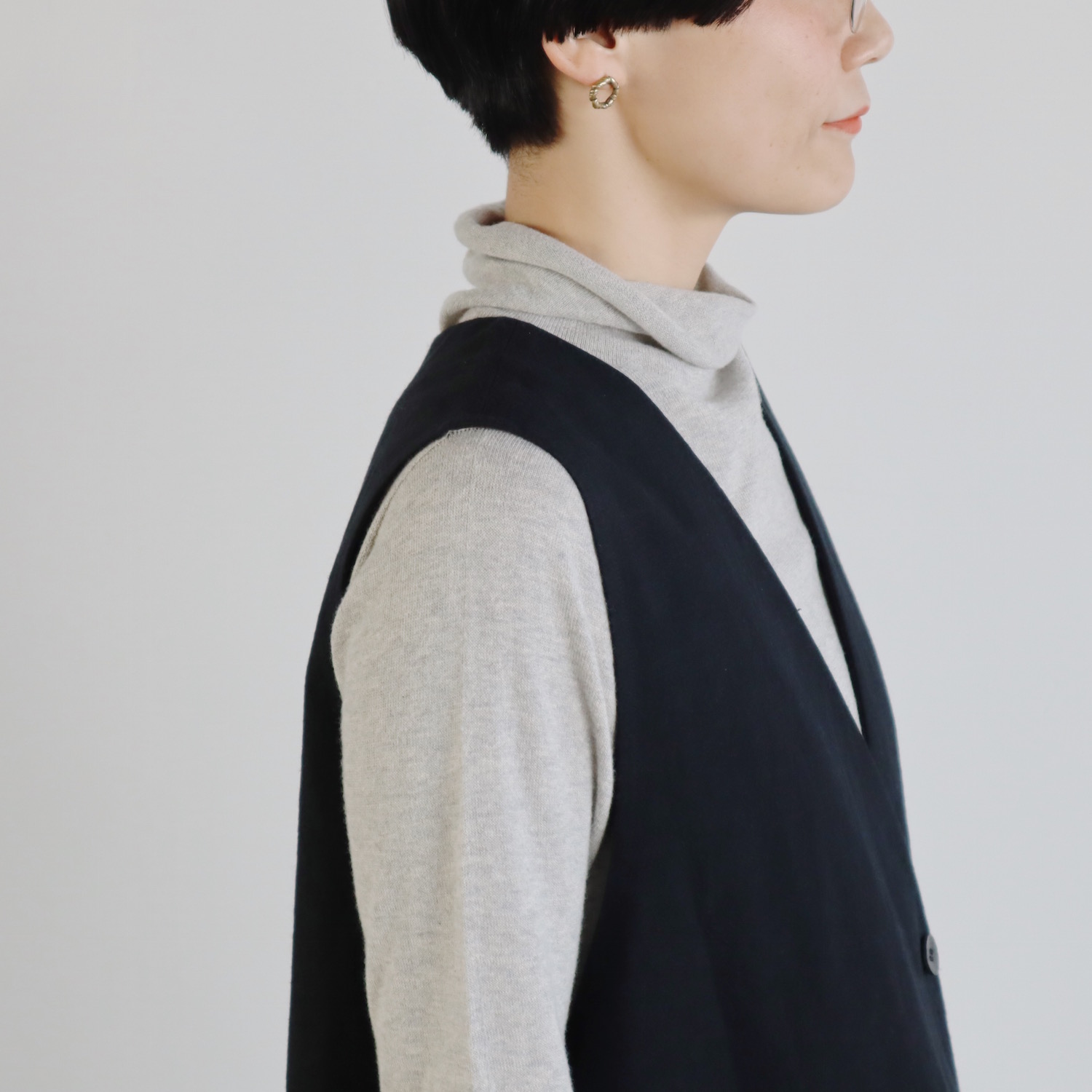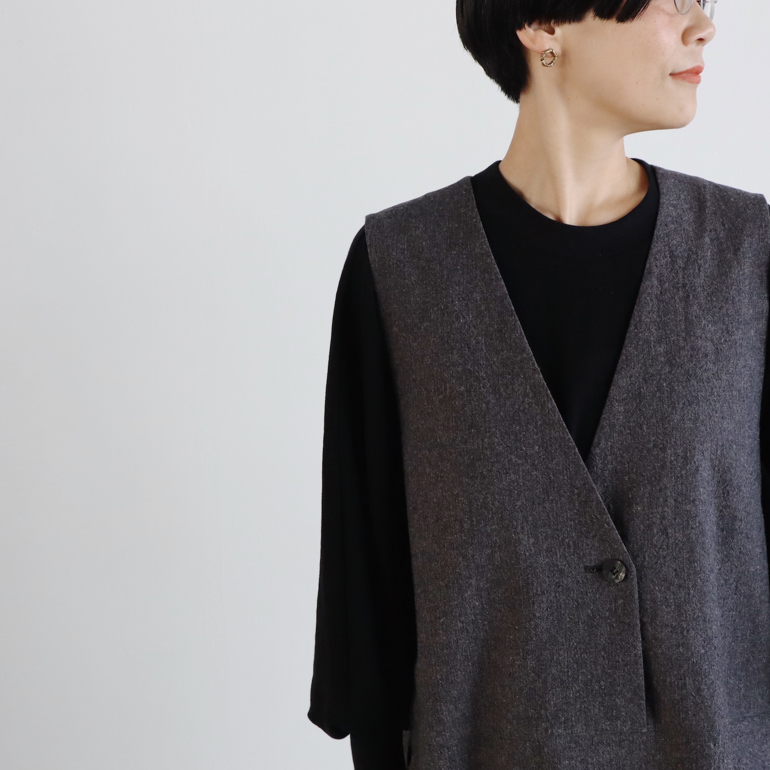 バストとウエストはゆったりと。縦長なコクーンシルエットを採用することで、身体のラインを拾いにくくなっています。広いアームホールのおかげで、身幅たっぷりなカットソーや袖幅の広いブラウスなど、どんなトップスも受け入れてくれます。合わせるアイテムに困らない、器の大きさが自慢です。