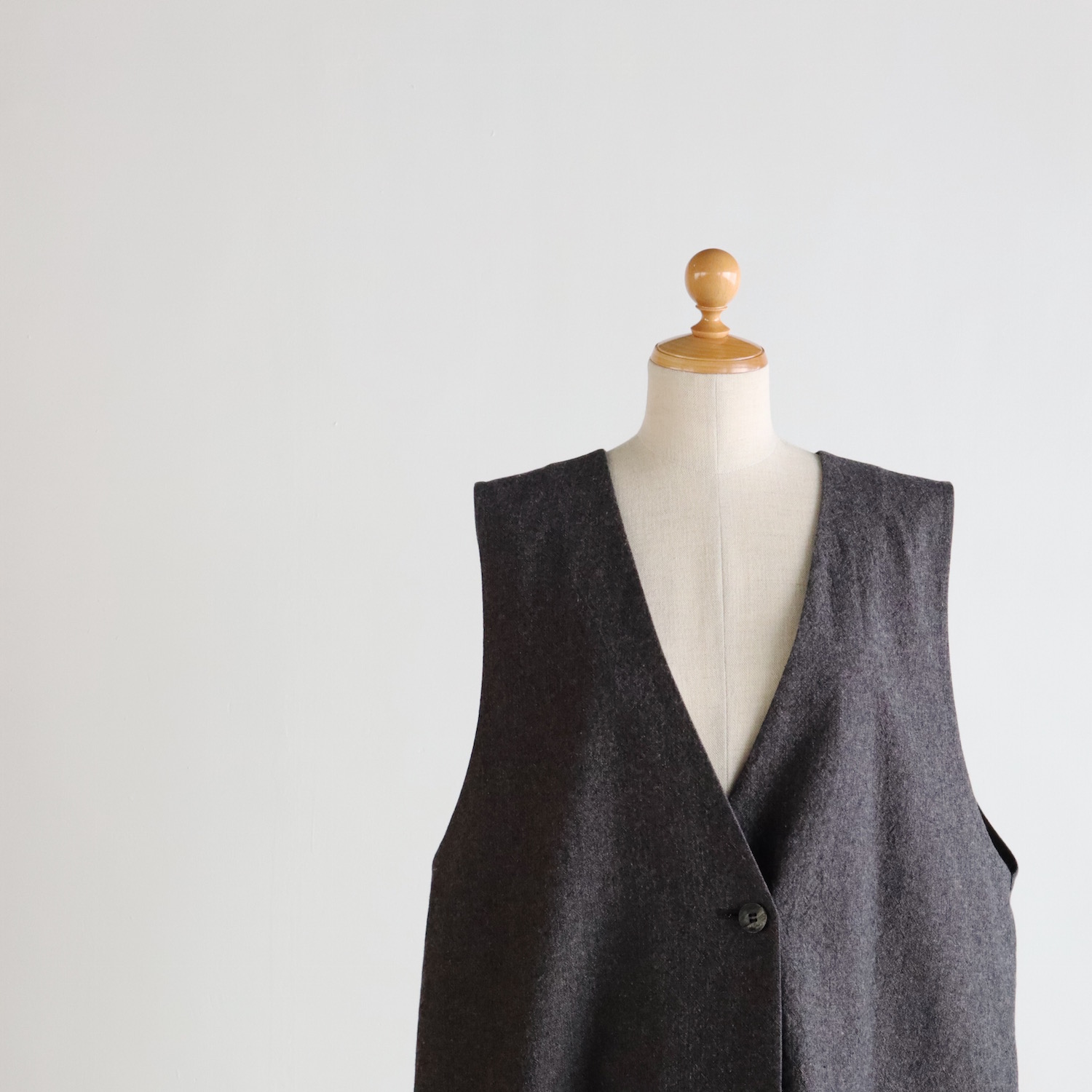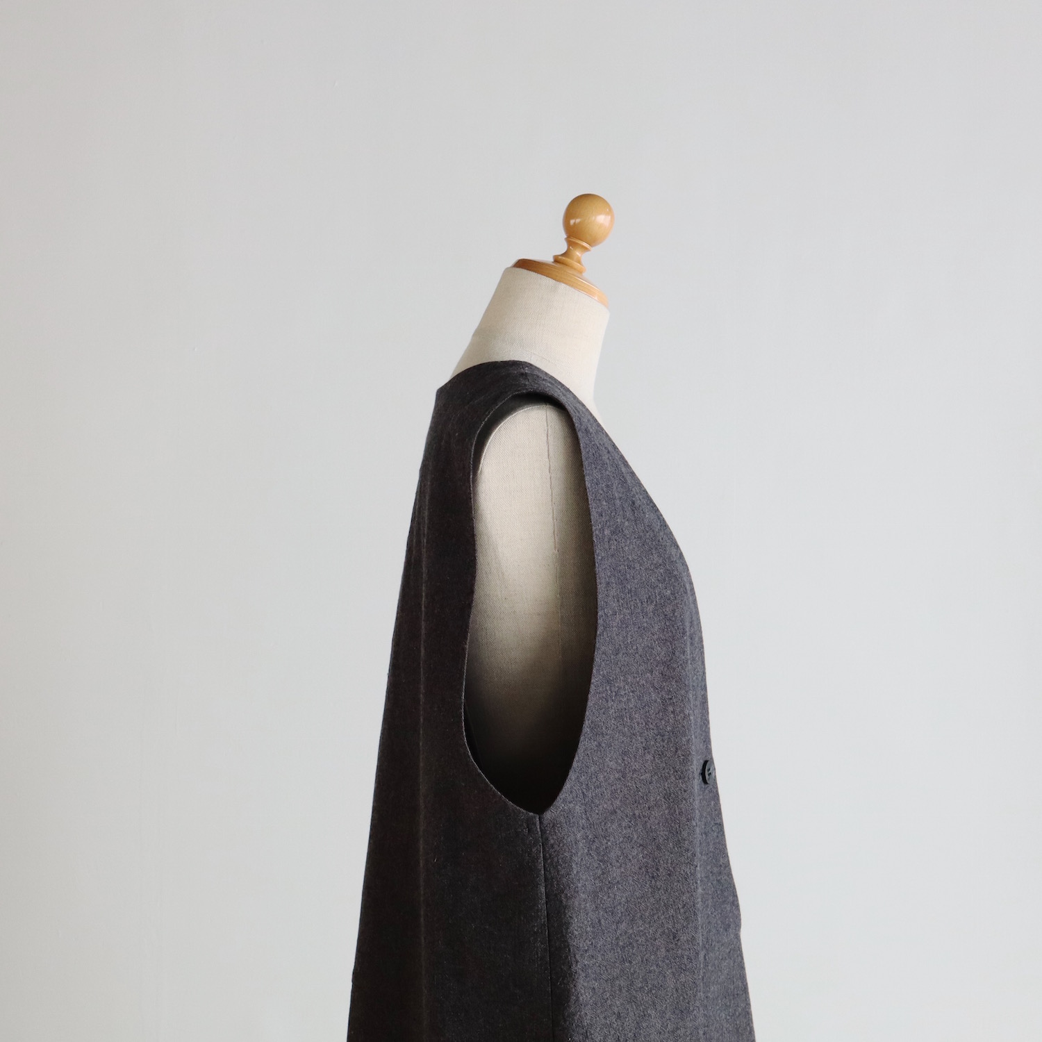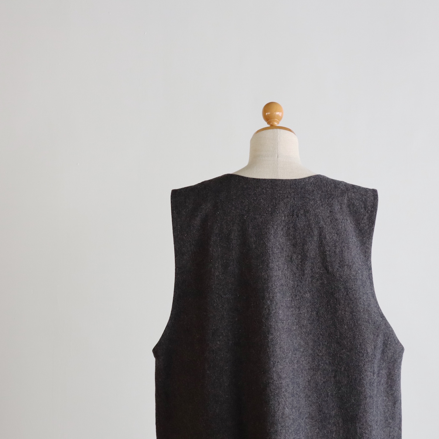 左右には深めのポケットを設け、フロントには凹凸感のあるウッドボタンを配しました。こういった細かな一手間が、アトリエナルセらしい空気を生んでいるのかもしれません。