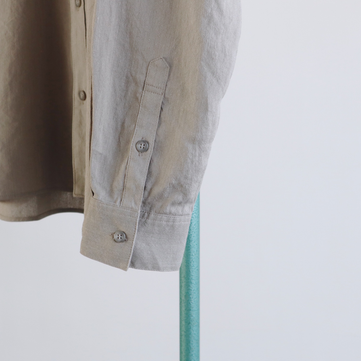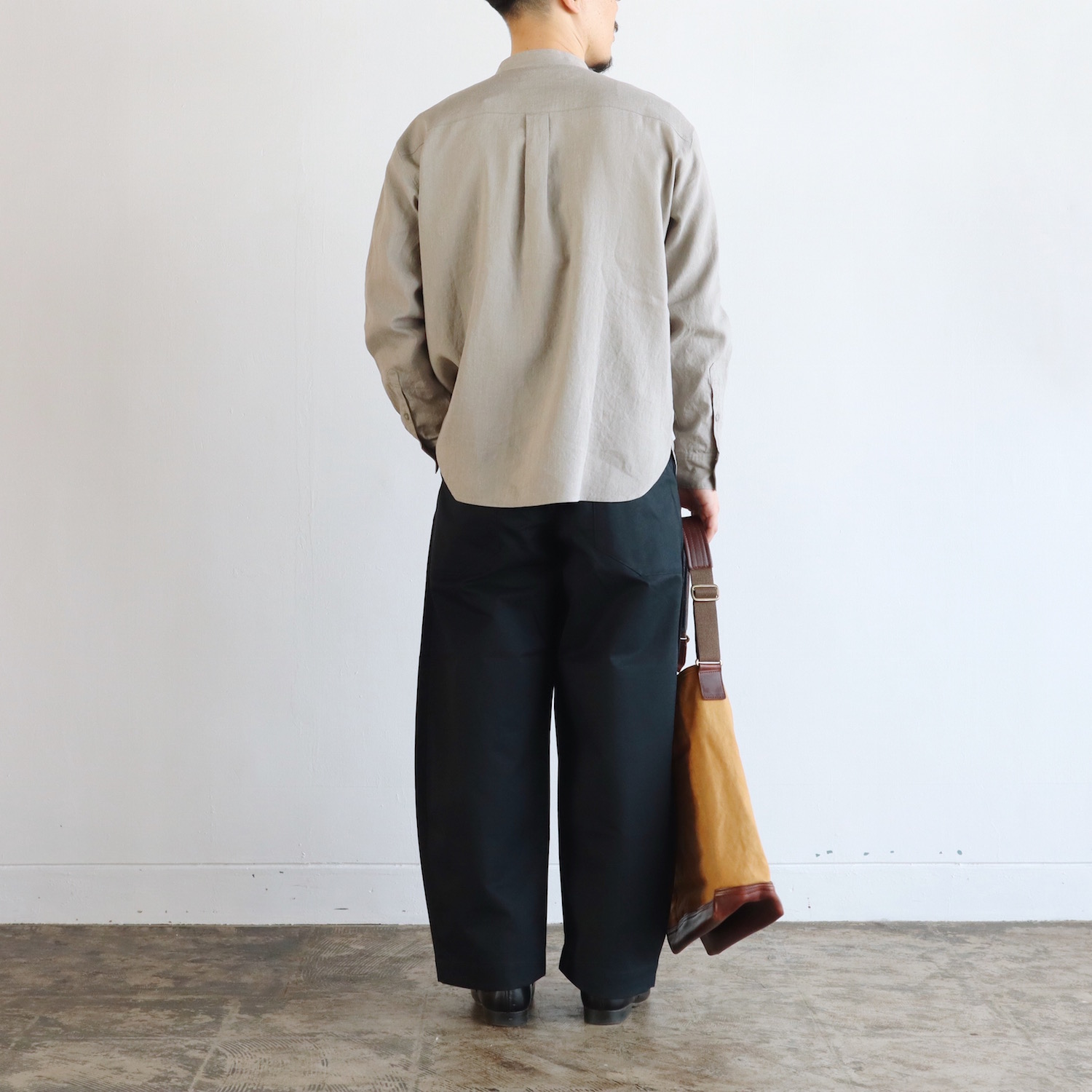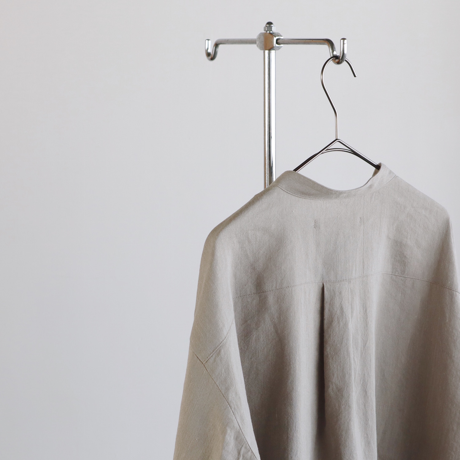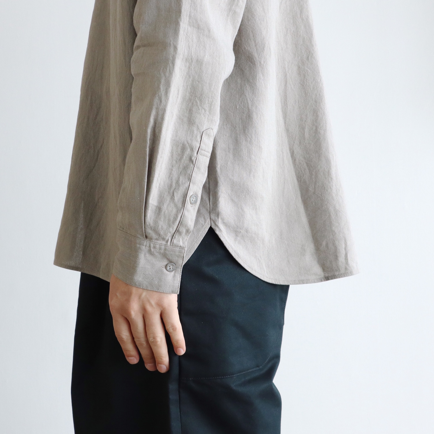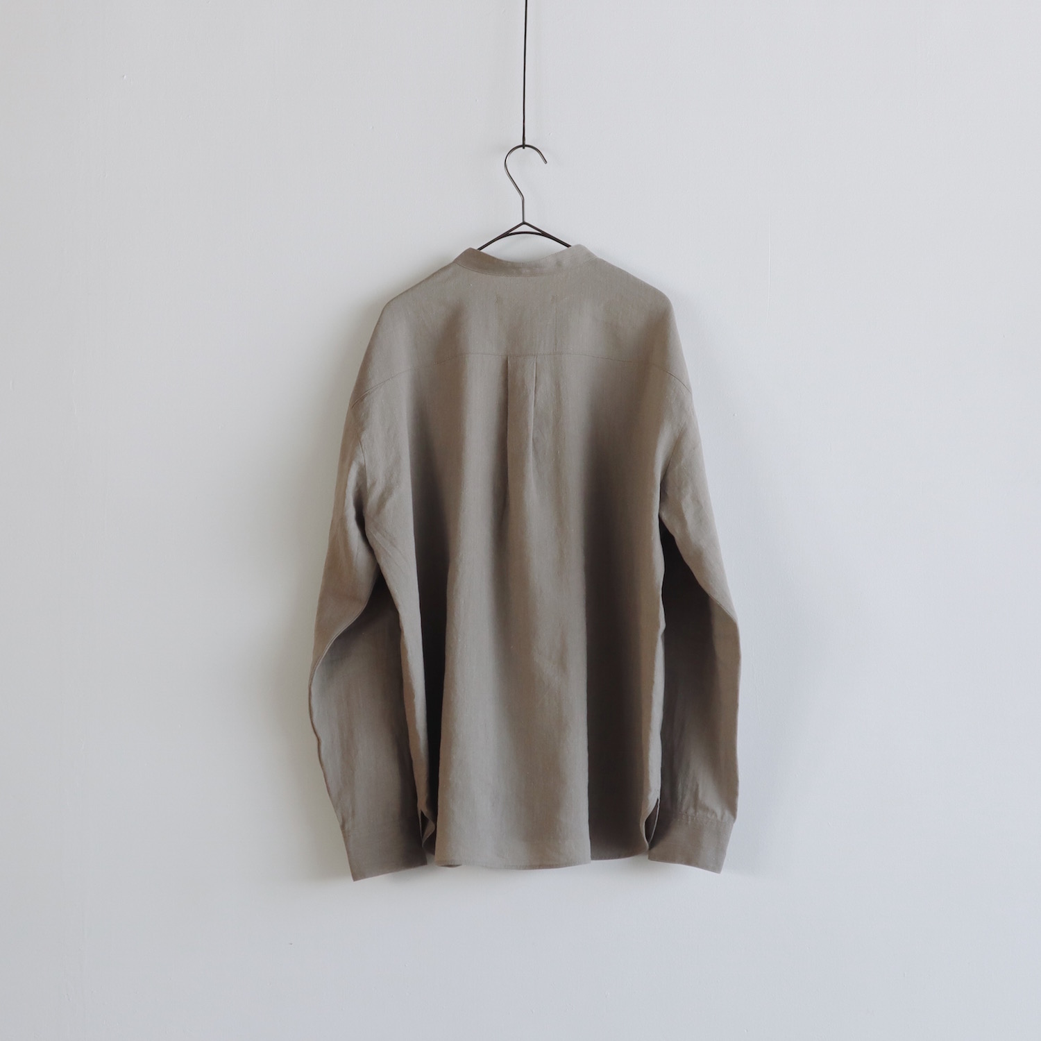 首元はスッキリとしたバンドカラーです。身幅にはゆとりを持たせ、リラックスしたシルエットに仕上げました。派手さはありませんが、他にはない生地感が、さりげない個性を引き立てます。春夏の日々を支えてくれる、頼もしい一枚になると思います。