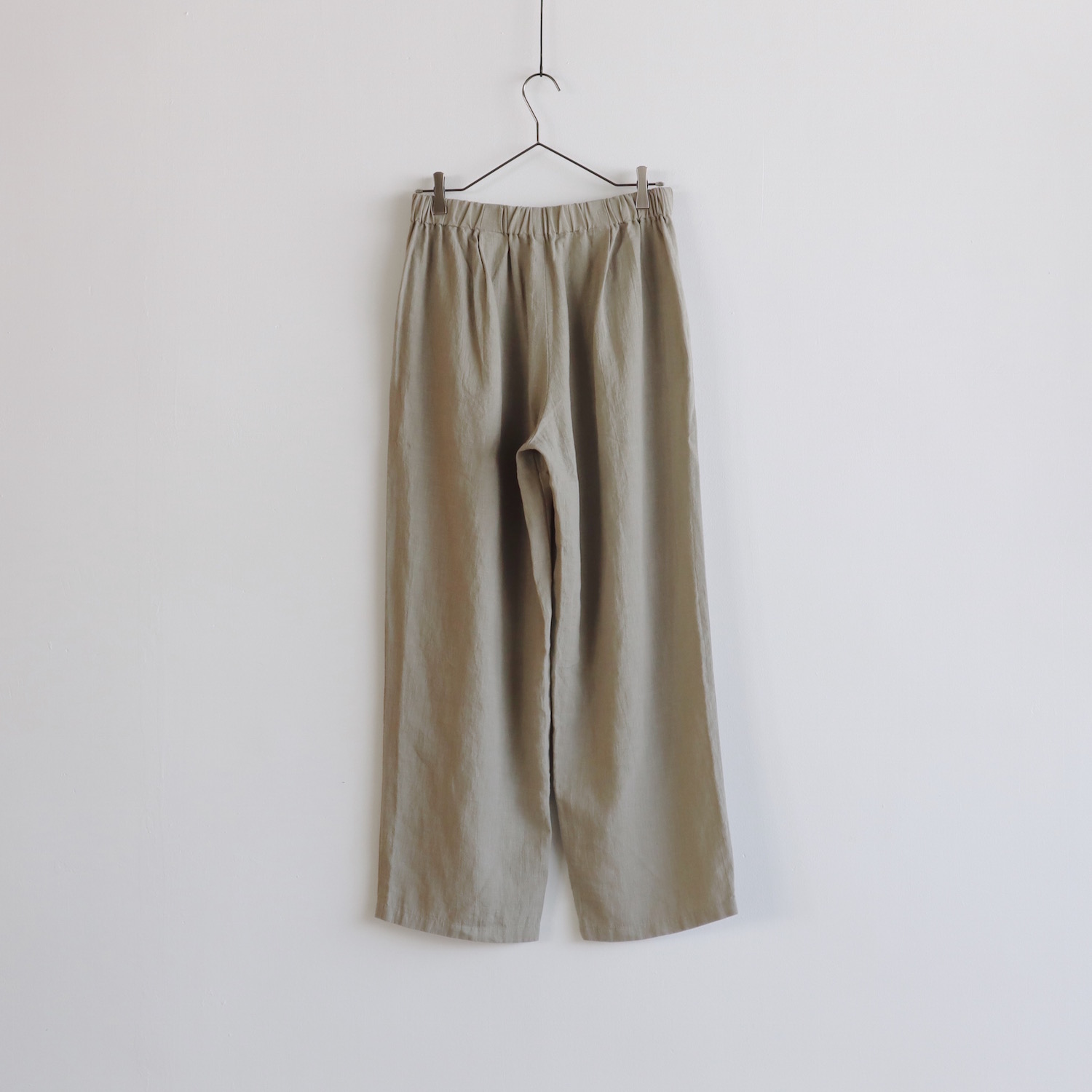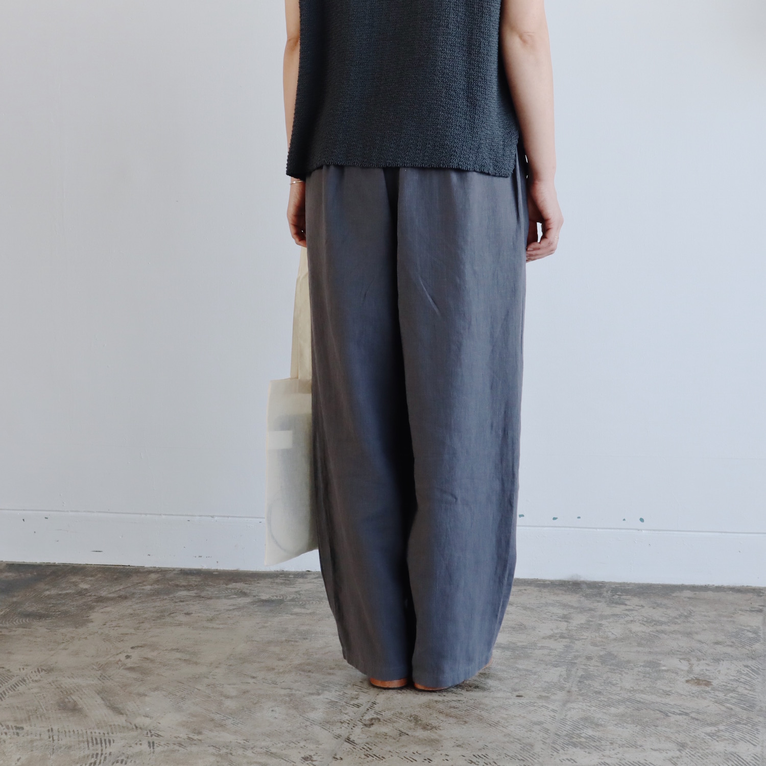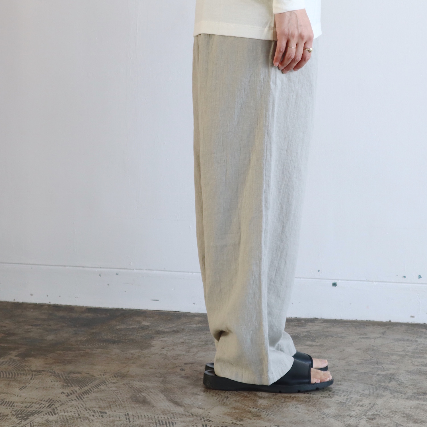 ウエストはゴムのイージーパンツ仕様で、股上は深めです。浅めにタックが入った、ワイドなストレートシルエットに仕立てています。風通しの良い、涼やかなはき心地です。