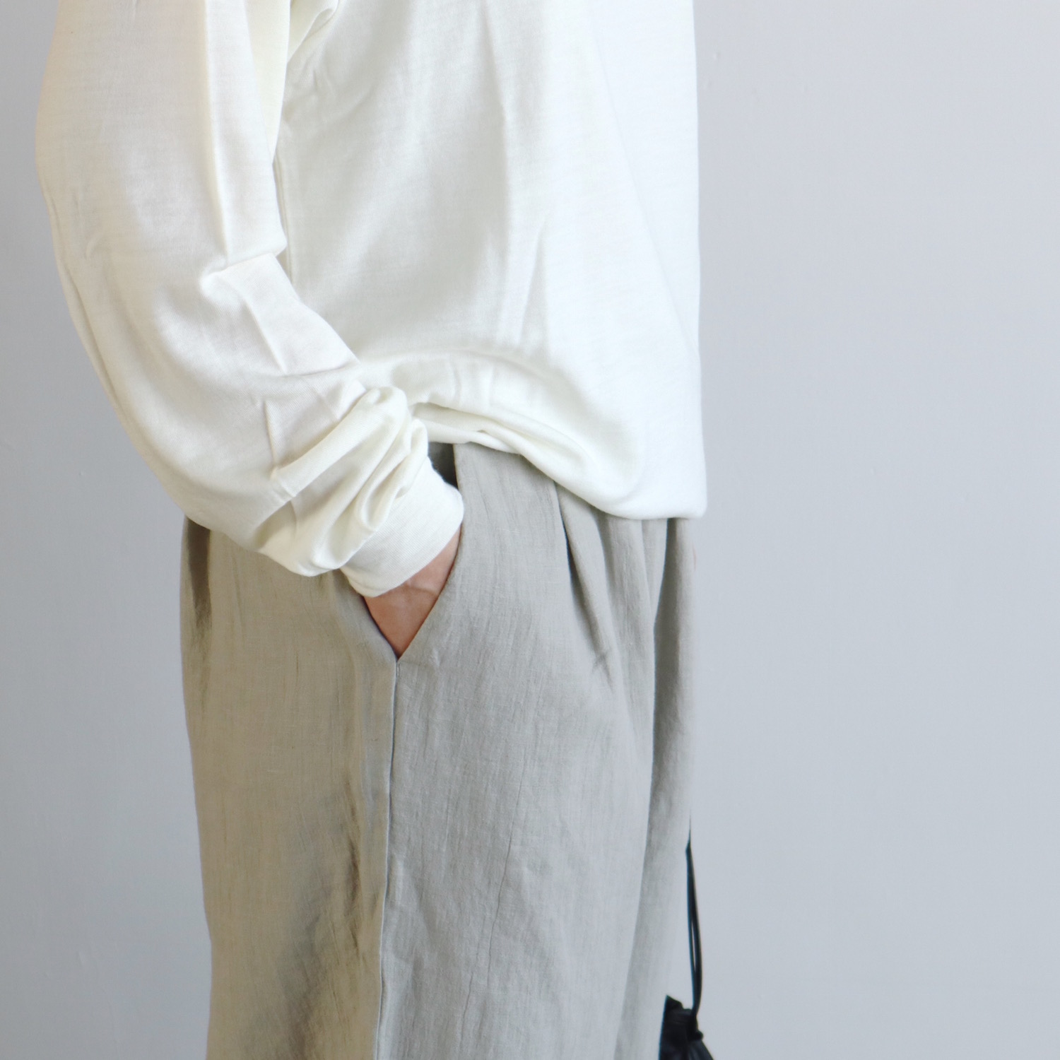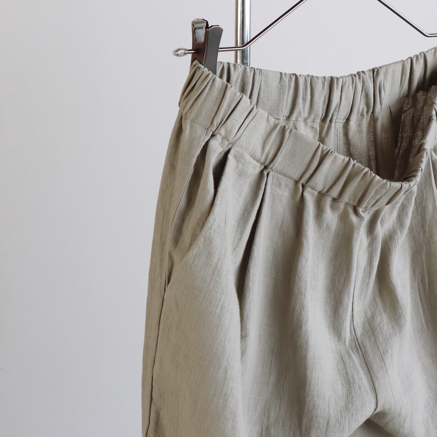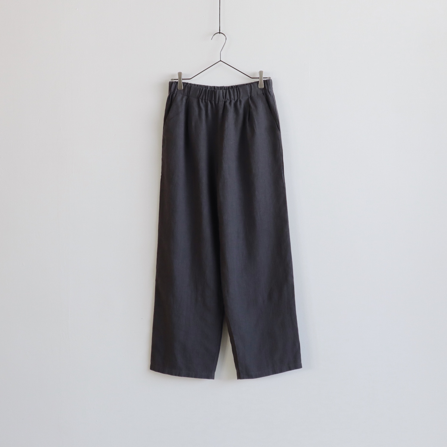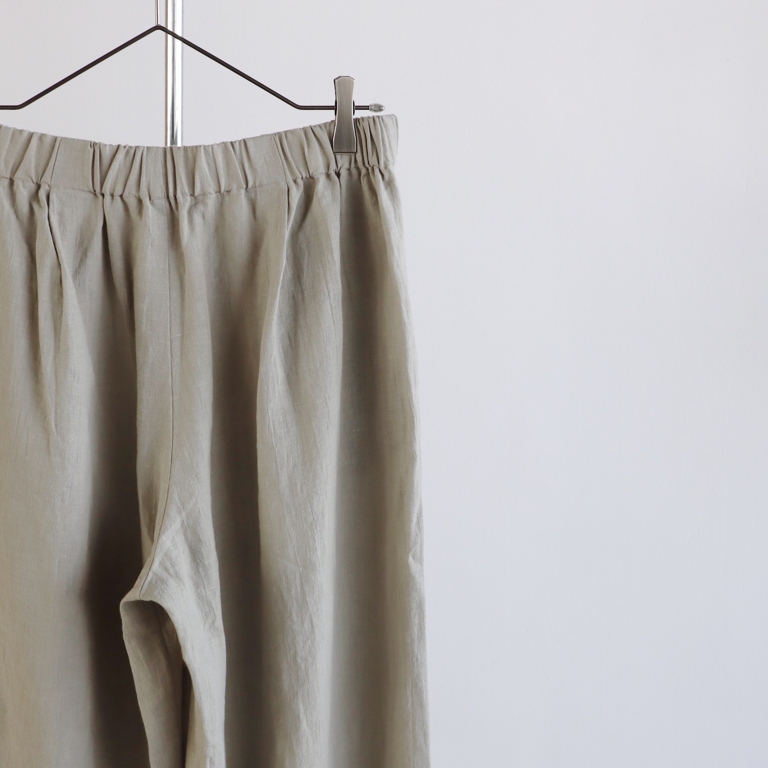 ウエストはゴムのイージーパンツ仕様で、股上は深めです。浅めにタックが入った、ワイドなストレートシルエットに仕立てています。風通しの良い、涼やかなはき心地です。