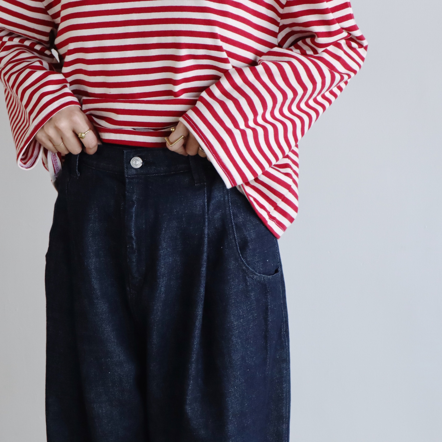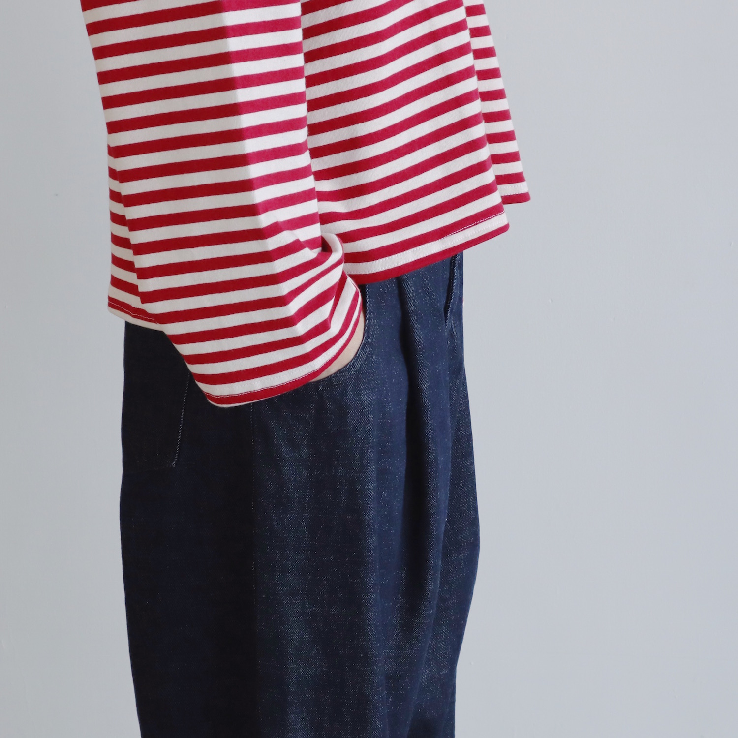デニム×ボーダーという鉄板の合わせで、このパンツの美しいシルエットを堪能できるコーディネートにしてみました。気負わず選んで気持ちよくはける、そんな一本です。是非お楽しみください。
