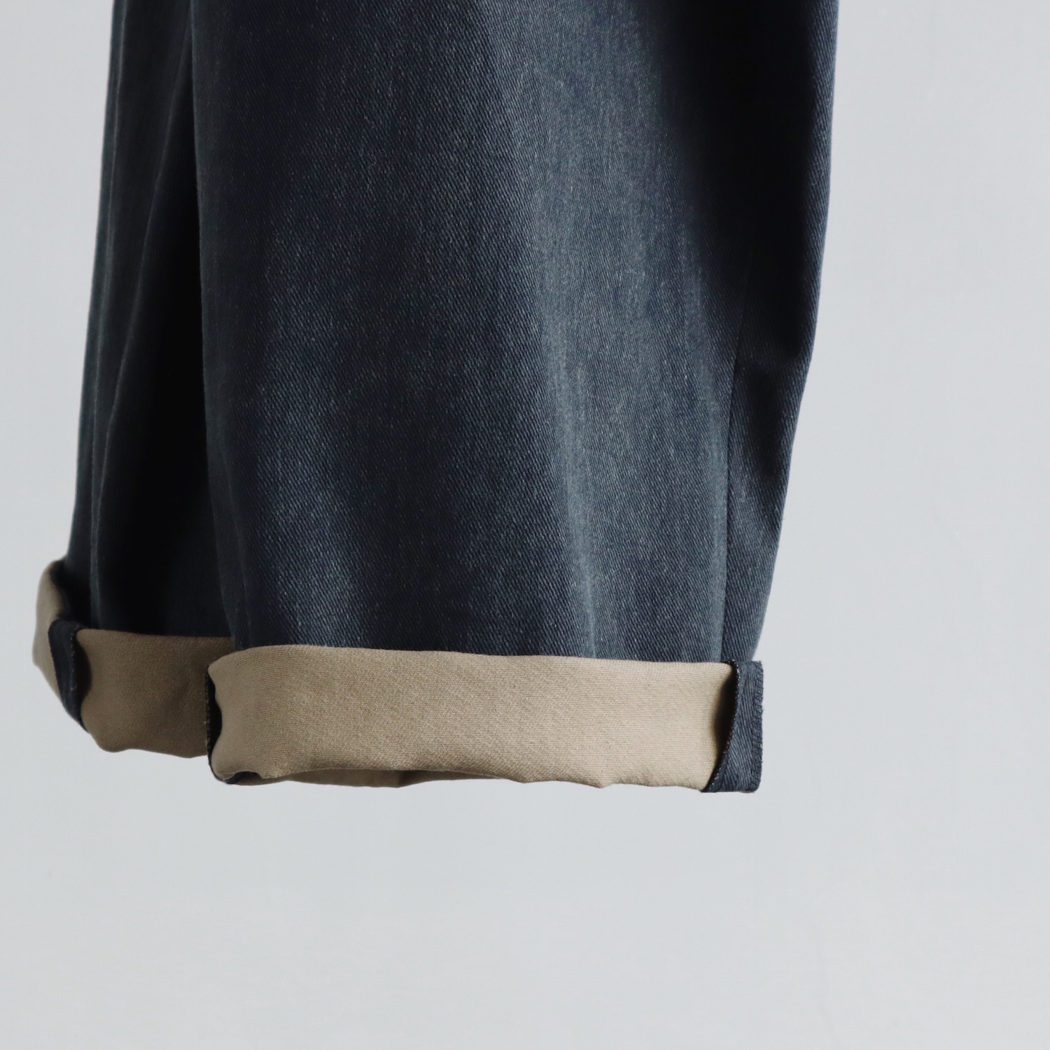 生地の表面に顔料(ピグメント)を塗布する加工を施す事で、表面はデニムの様な色合いを表現し、裏面は素地のベージュをそのまま残すという二面性を持たせました。ロールアップするとしないで、違った味わいを楽しめます。