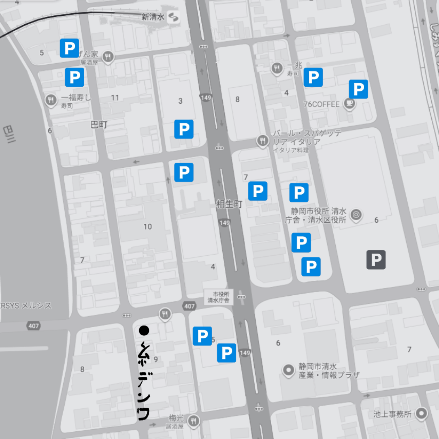 電車でお越しの方は、新清水駅から徒歩5分ほどで当店に到着です。
