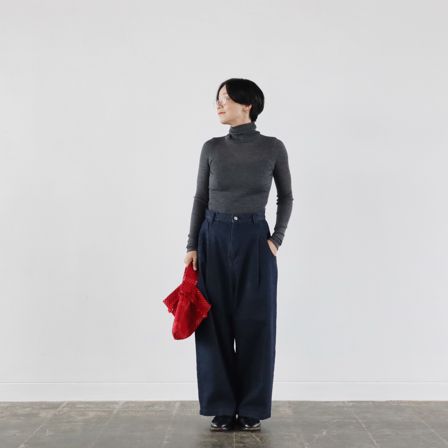 腰まわりがスッキリ見えるよう、タックの位置にはこだわっています。ヒップやワタリはゆったりとしており、股上は深め。ハイウエストで履いても腰で履いても、バランスの良く楽しめます。ただのワイドではない、裾巾広めのコクーンシルエットが、独特の印象を与えます。
